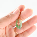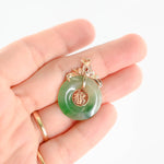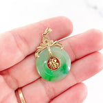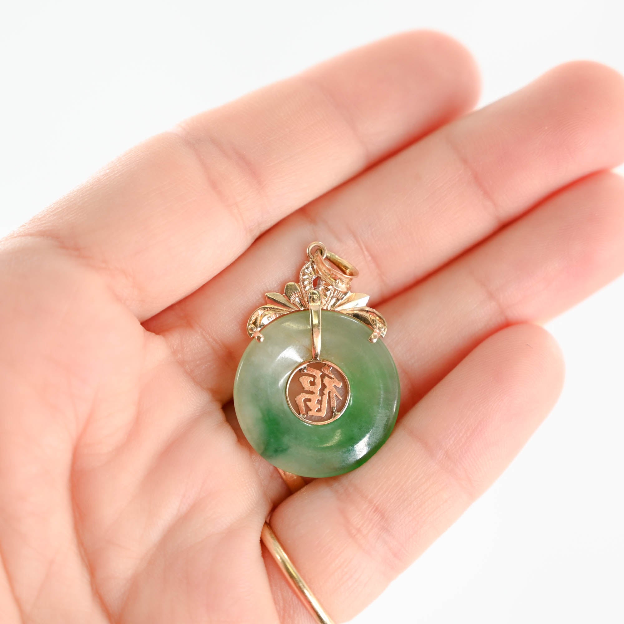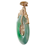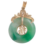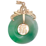 14k Yellow Gold Green Jade Disc Chinese Character For a Good Fortune Pendant
