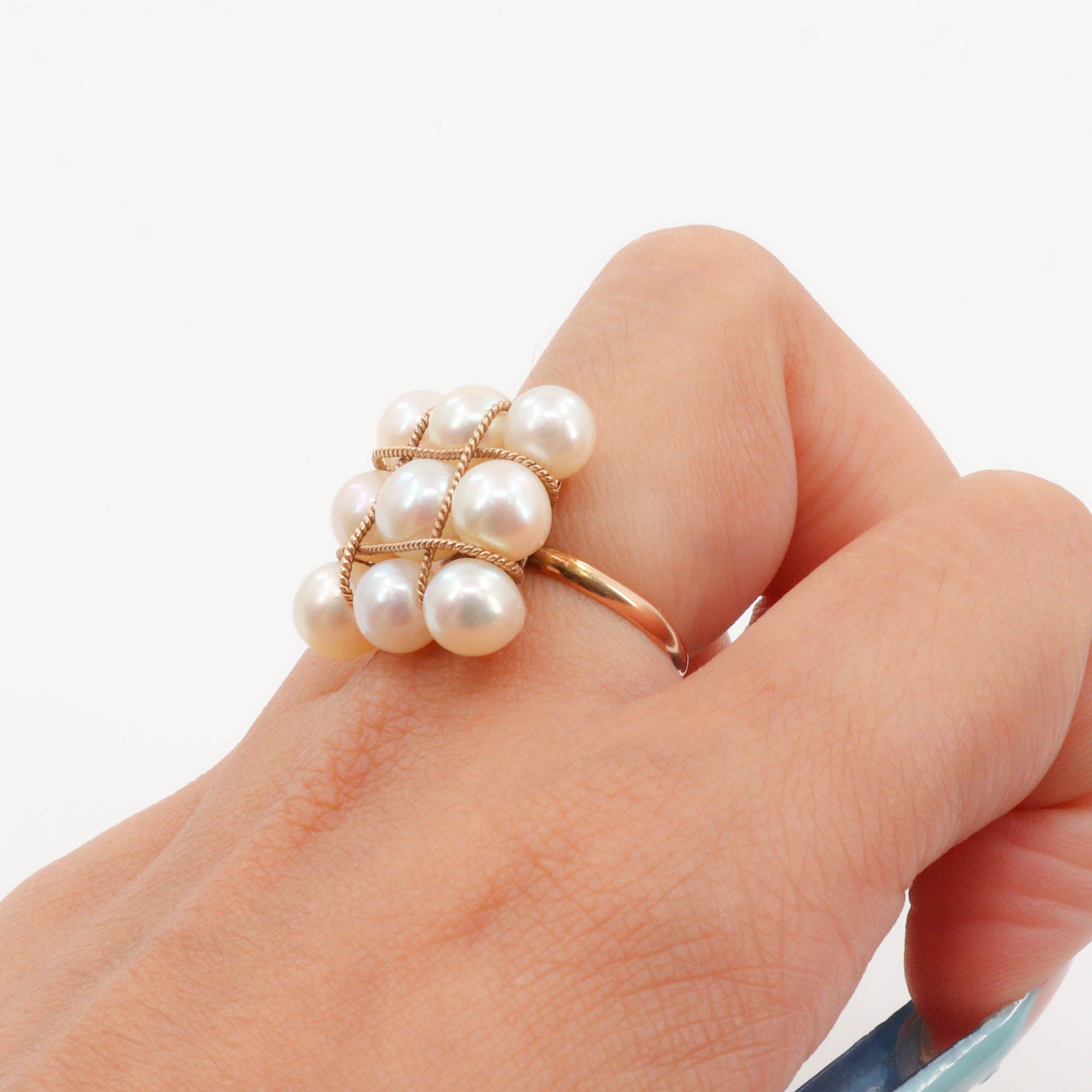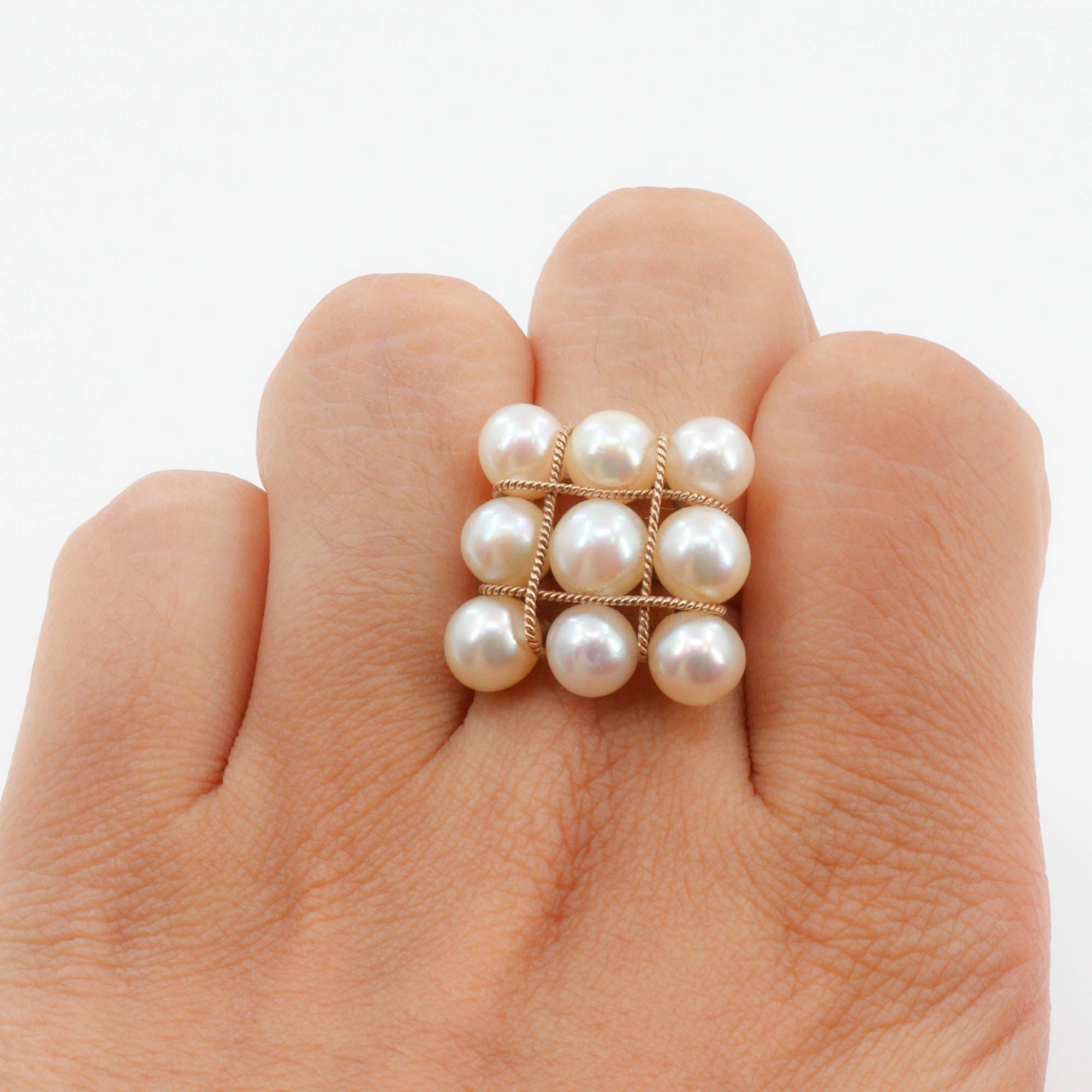 Enhance your style with this 14k Yellow Gold Grid Pearl Cocktail Ring. Featuring a 1.9mm shank and a 21mm head adorned with nine 6mm pearls, this size 7 ring combines elegance with a bold design. Crafted from 14k yellow gold and weighing 6.1 grams, it is a stunning addition to any jewelry collection.