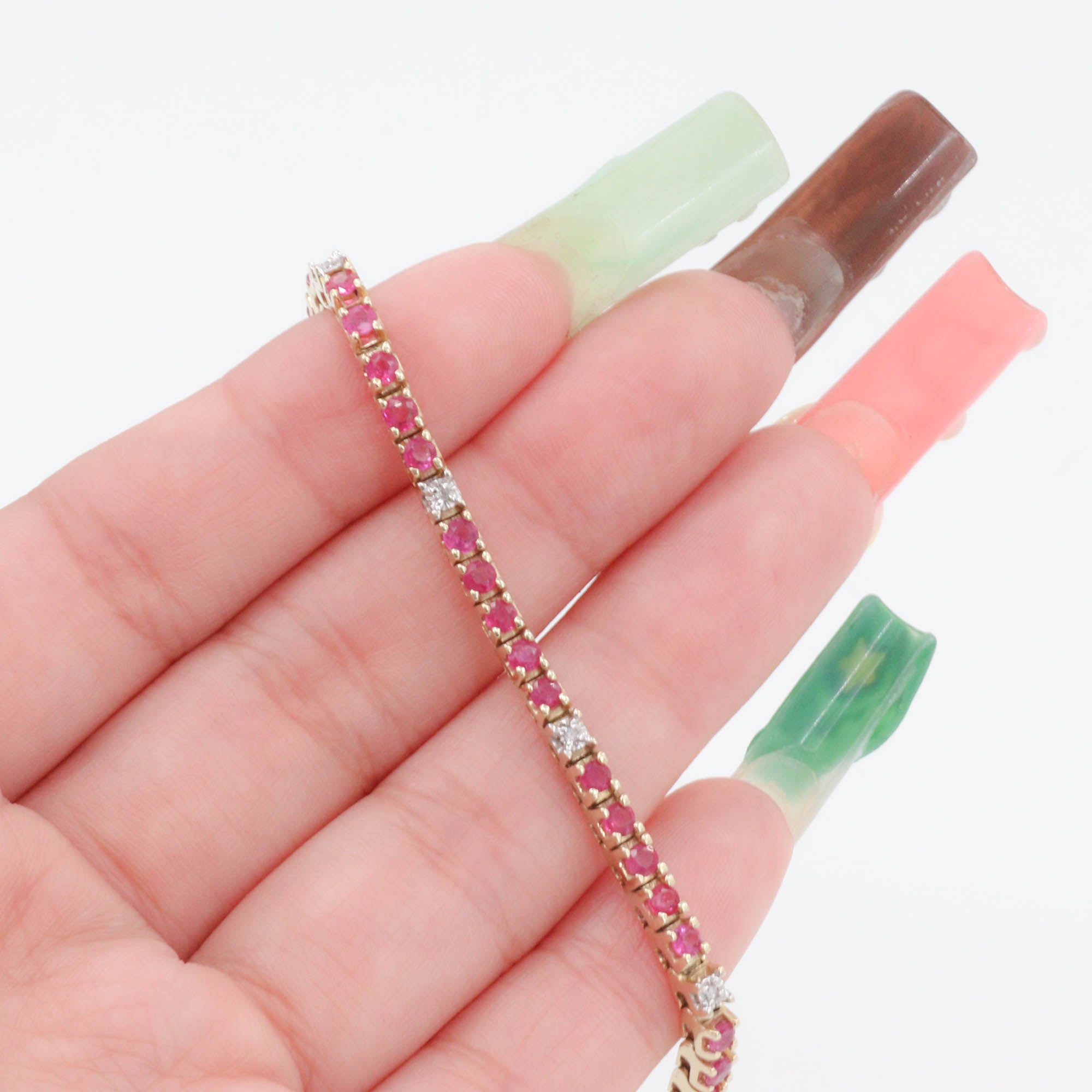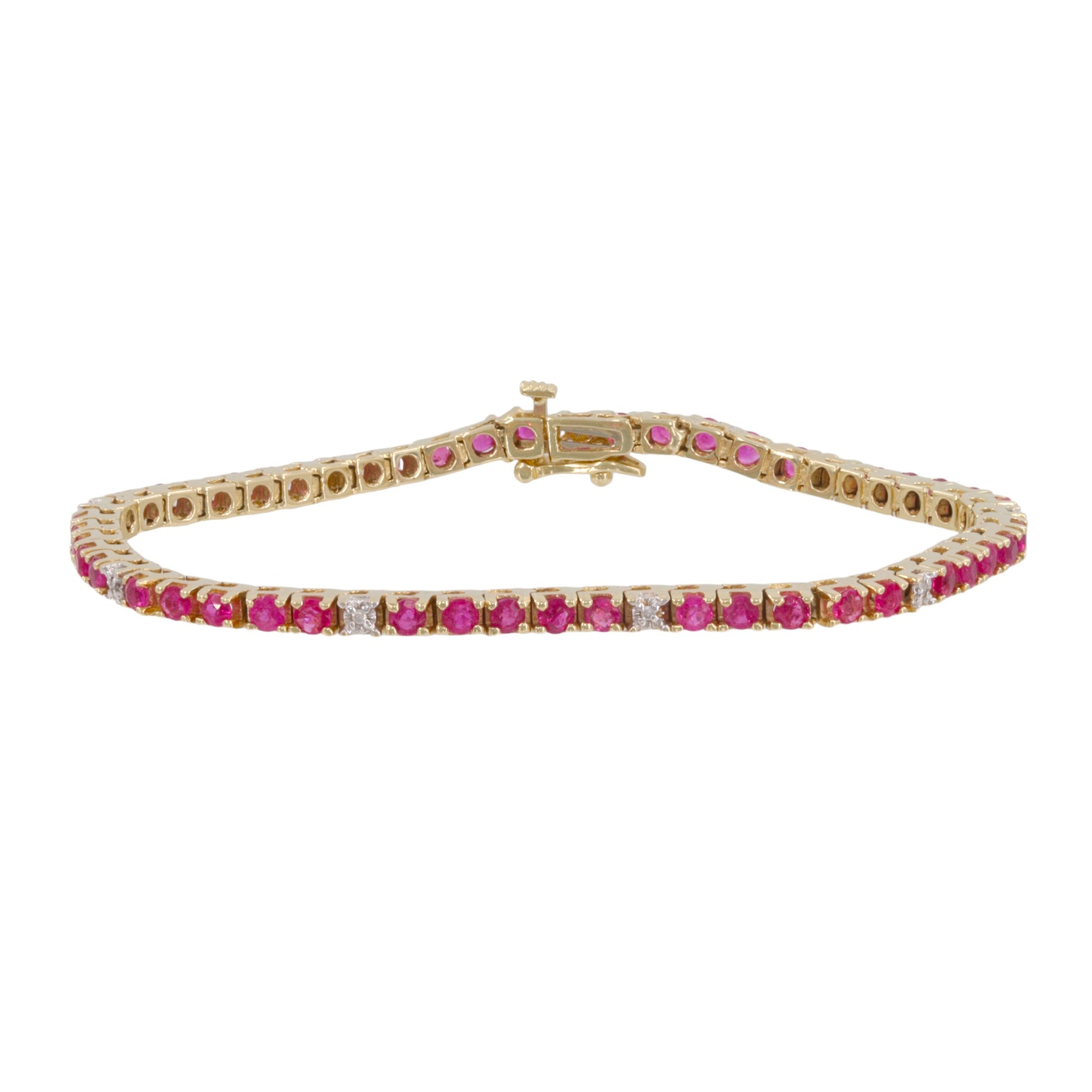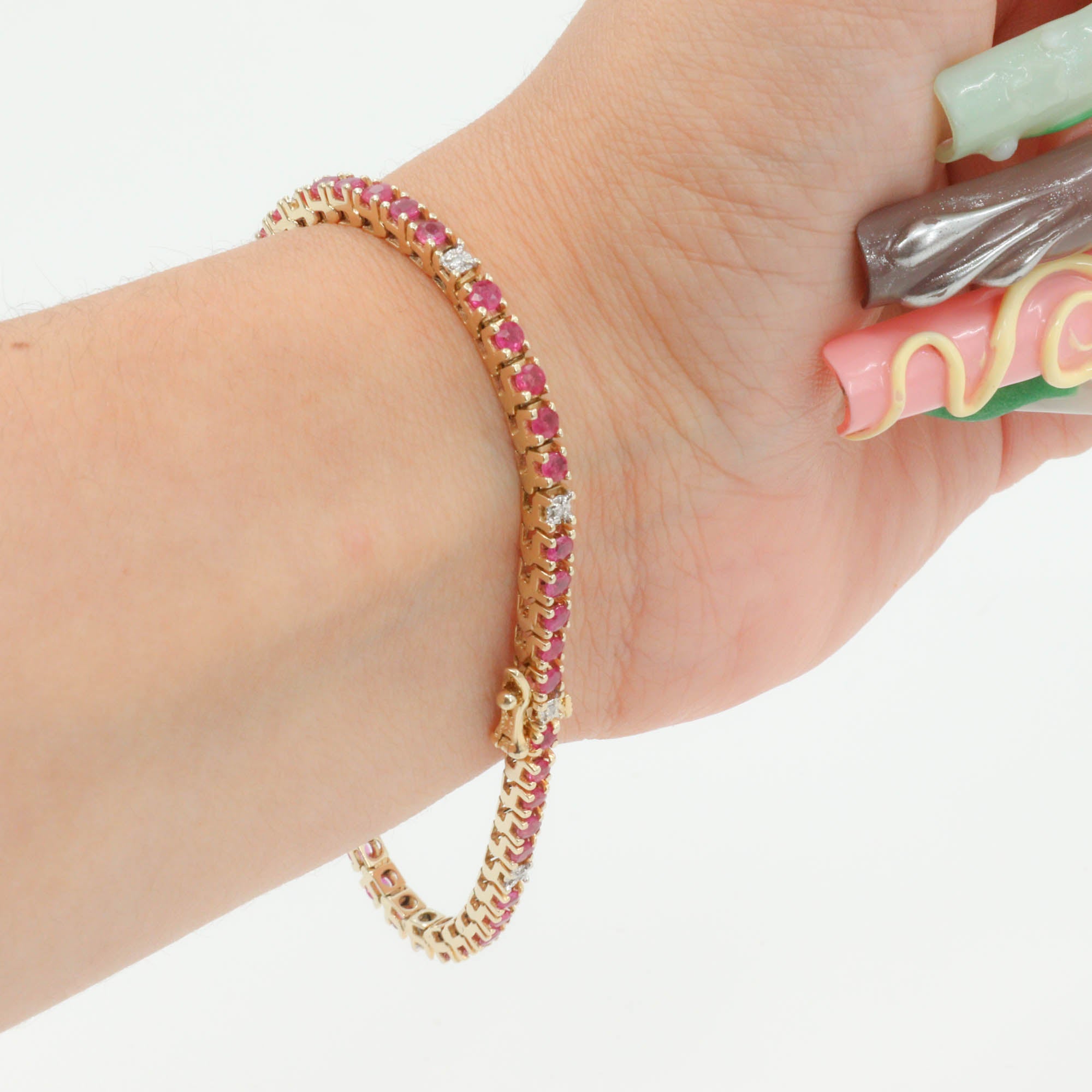 Indulge in the elegance of the 14k Yellow Gold Illusion Set Diamond and Spinel Tennis Bracelet. This stunning piece features 9 round brilliant cut diamonds and 45 round-cut spinel, set in a delicate design. Crafted from luxurious 14k yellow gold, it adds a touch of sophistication to any look.