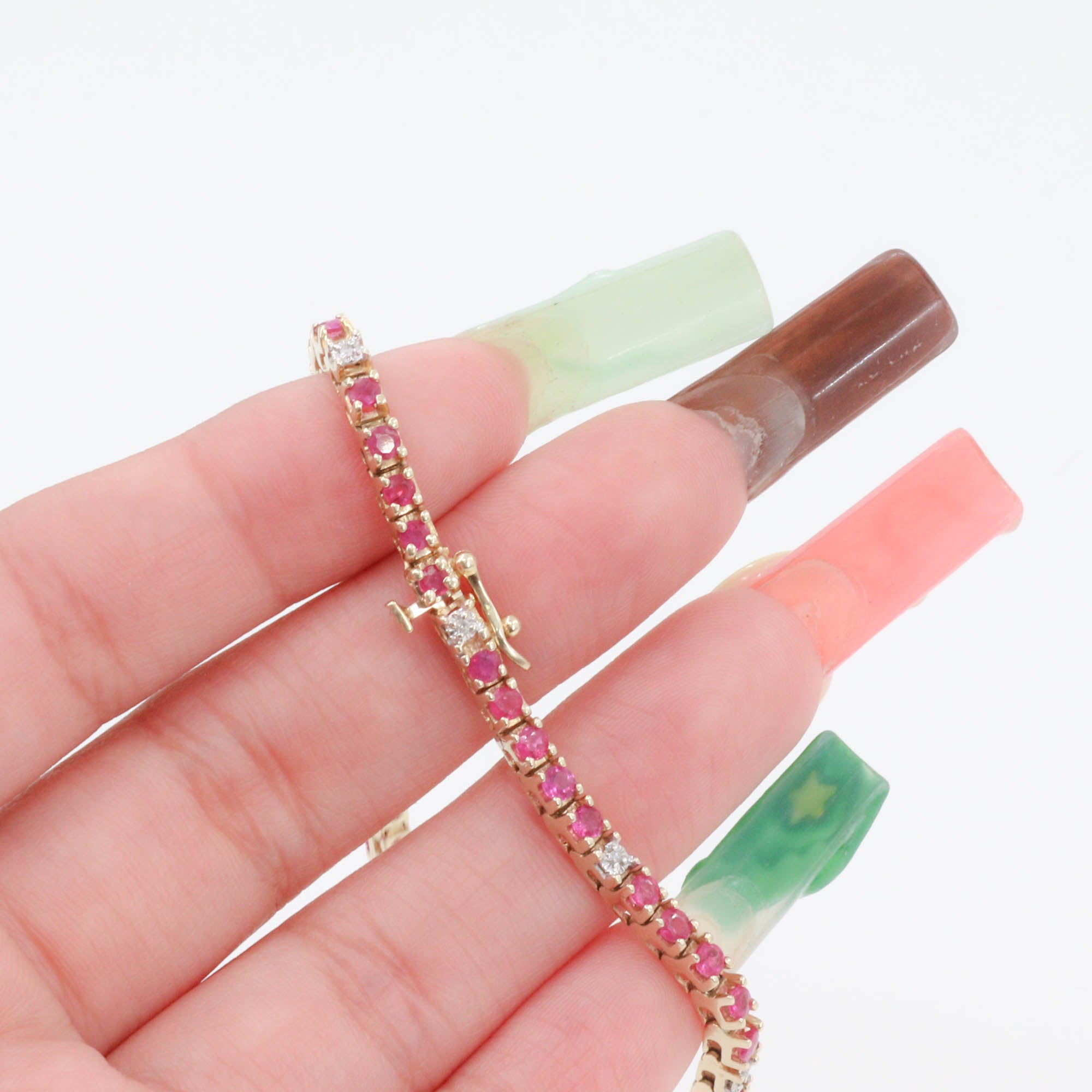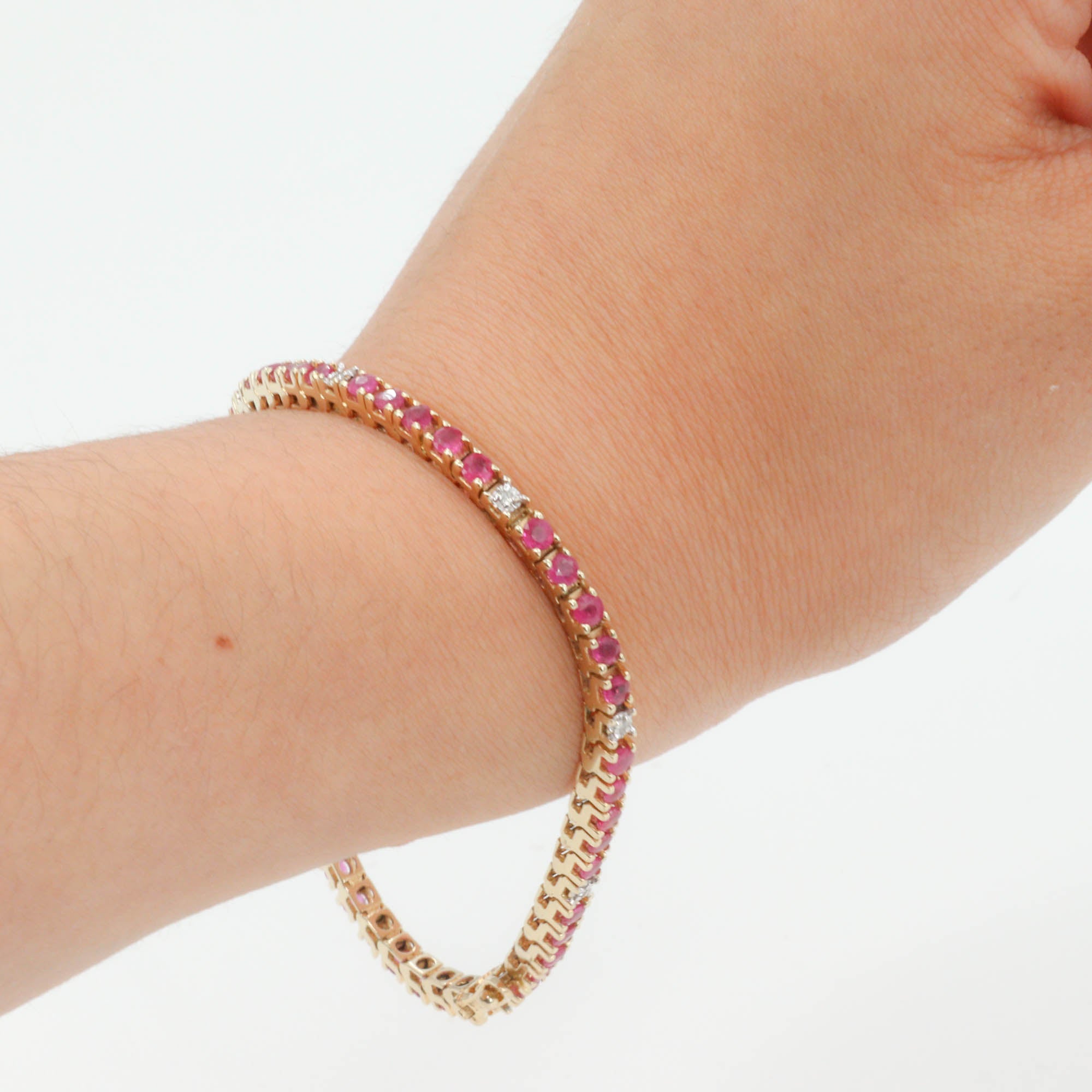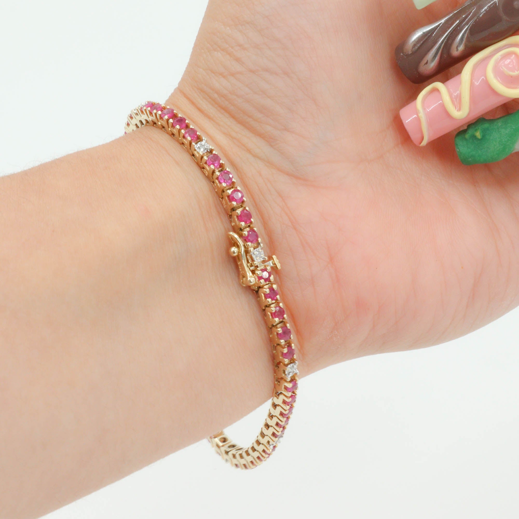 Indulge in the elegance of the 14k Yellow Gold Illusion Set Diamond and Spinel Tennis Bracelet. This stunning piece features 9 round brilliant cut diamonds and 45 round-cut spinel, set in a delicate design. Crafted from luxurious 14k yellow gold, it adds a touch of sophistication to any look.
