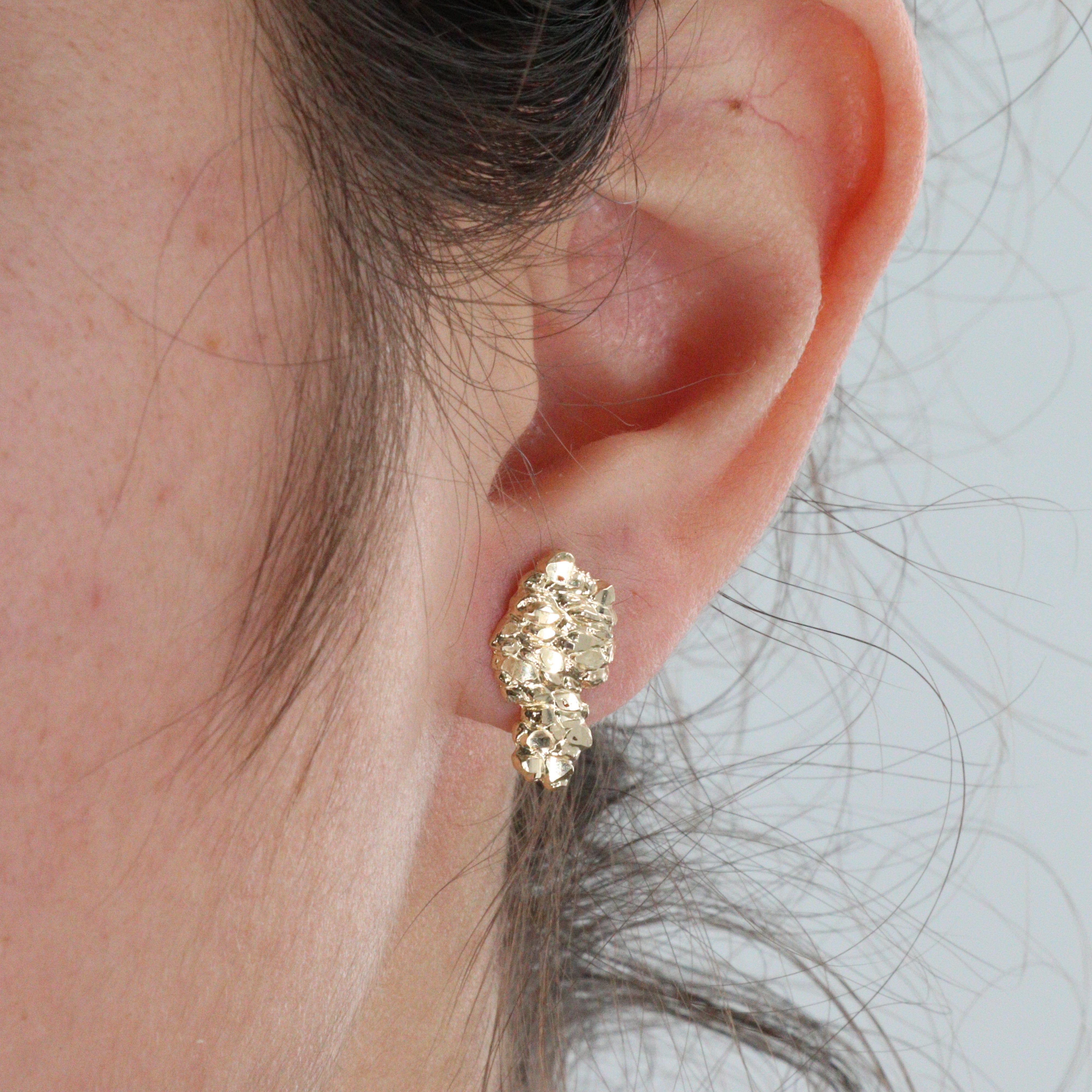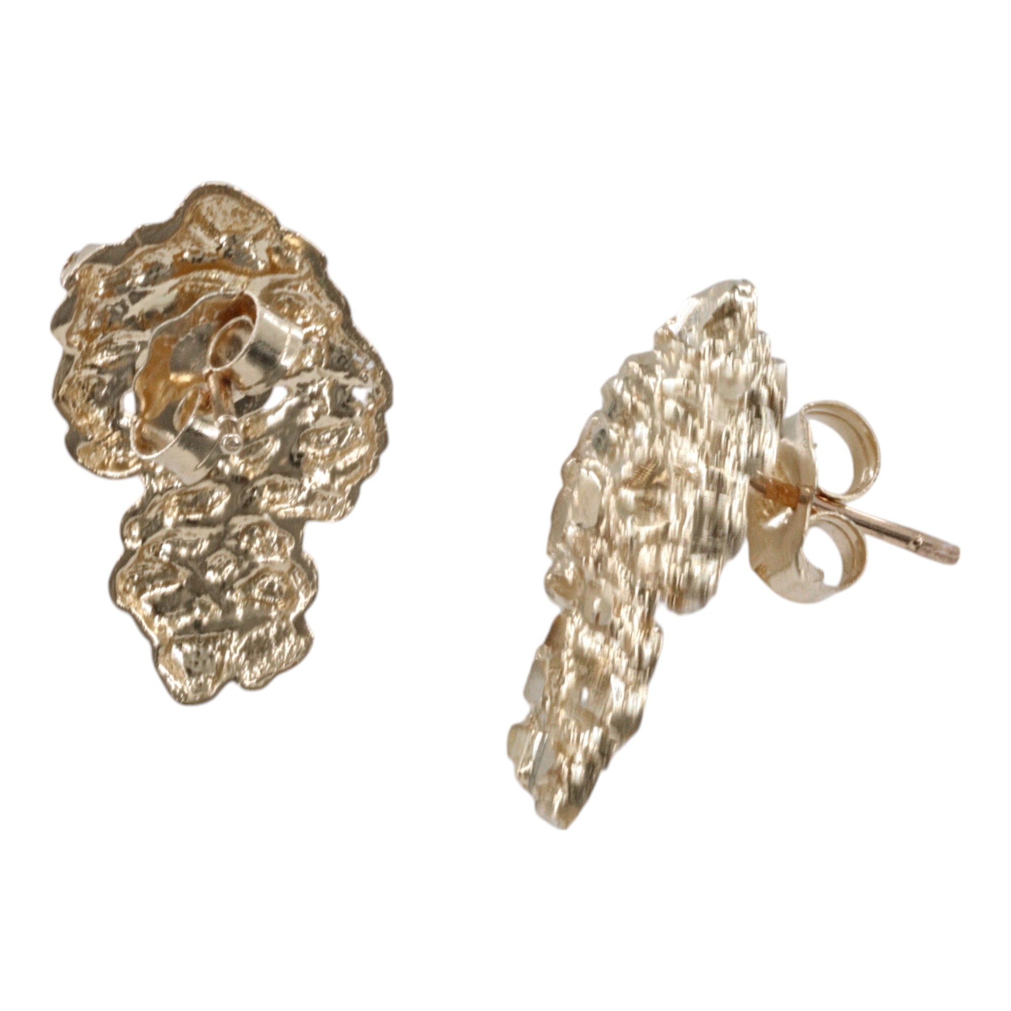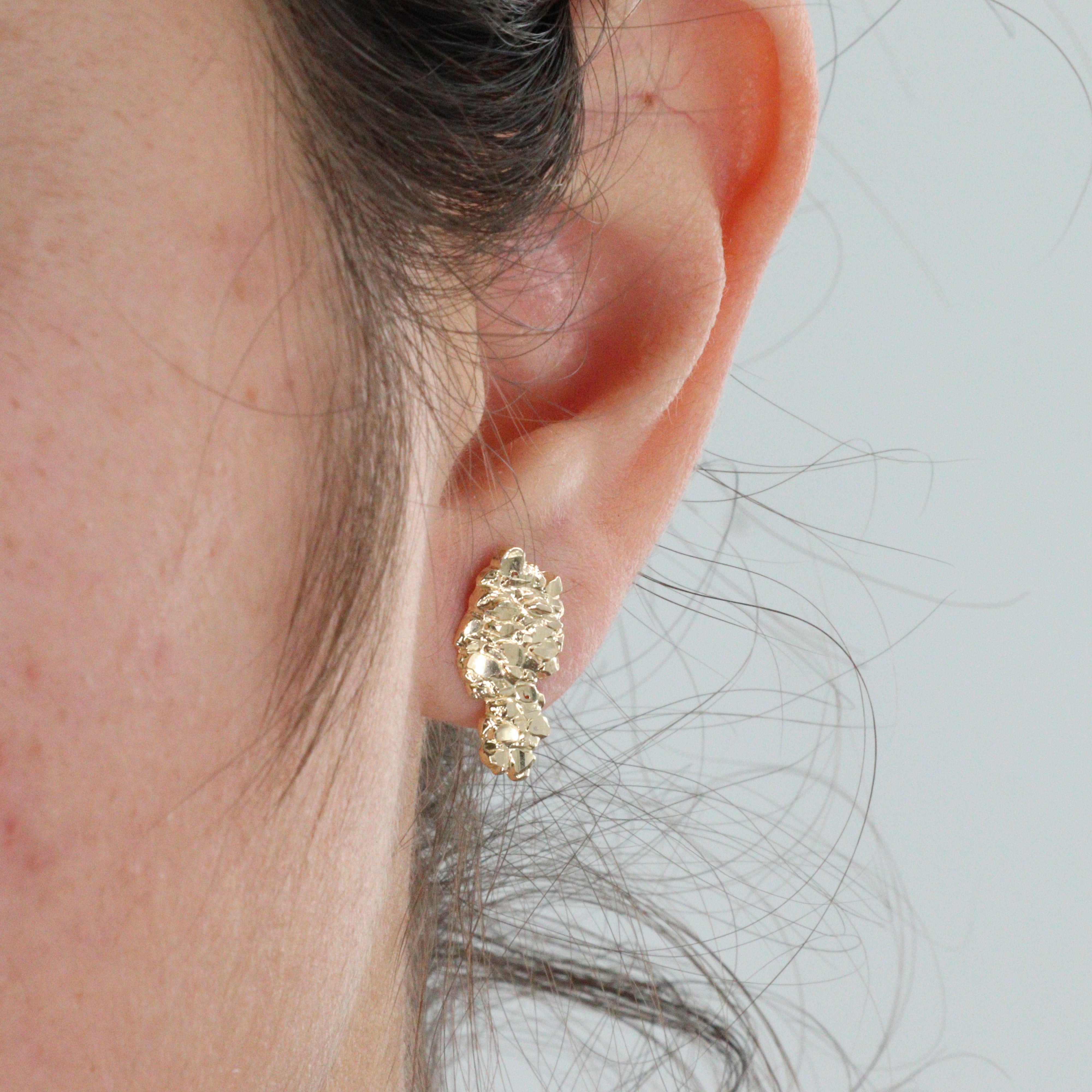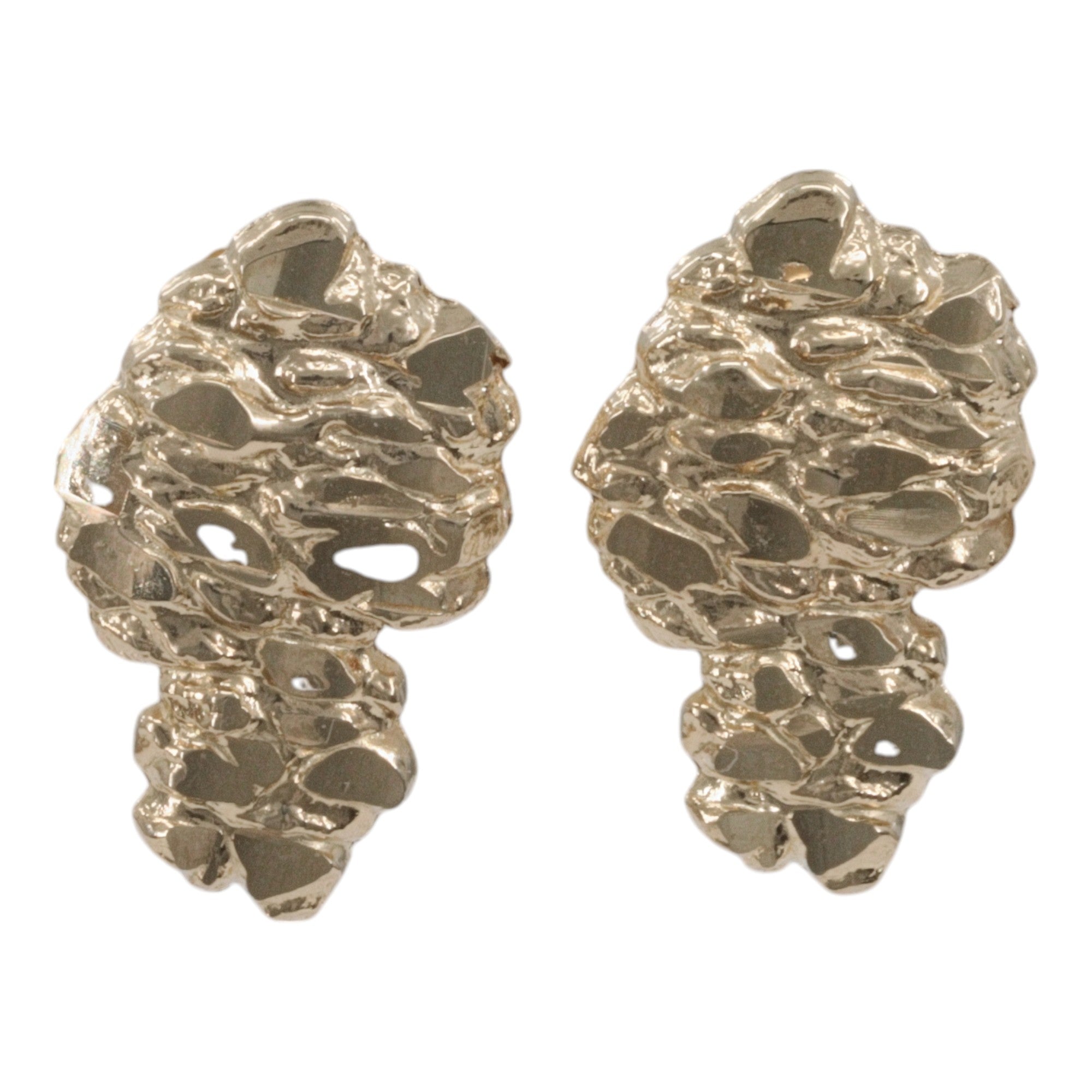 These 14k Yellow Gold Nugget Style Earrings exude a bold, textured elegance. At 16.5mm in length and 10mm in width, they feature a secure pushback closure and a lightweight 1.2g feel. Crafted in lustrous 14k yellow gold, their unique nugget design adds a touch of distinctive style, perfect for making a statement.