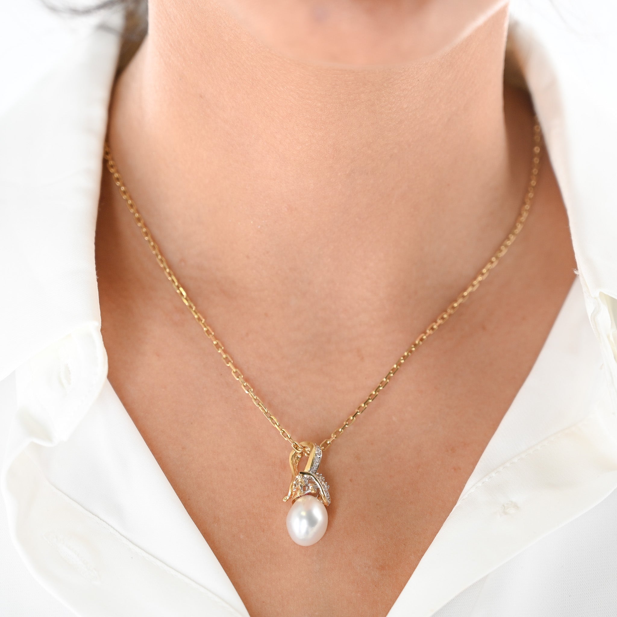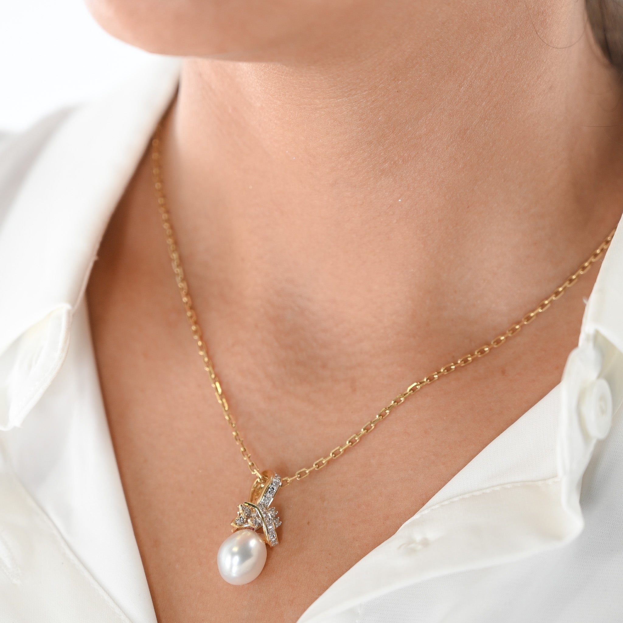 Each piece is a harmonious blend of sophistication and charm, featuring lustrous pearls set in warm 14K yellow gold. The pendant and earrings are adorned with delicate diamonds, adding a touch of brilliance and refinement to the ensemble. This set is perfect for both formal occasions and everyday wear, effortlessly elevating your style with its timeless beauty.