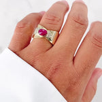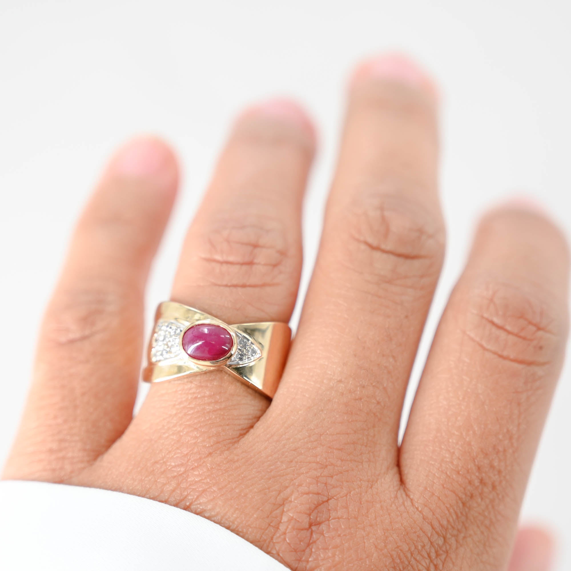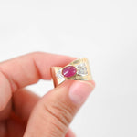 This stunning vintage cocktail ring features a vibrant ruby at its center, flanked by sparkling diamonds, all set in luxurious 14K yellow gold. The bold design and rich colors create a timeless, elegant statement piece perfect for adding a touch of glamour to any occasion.