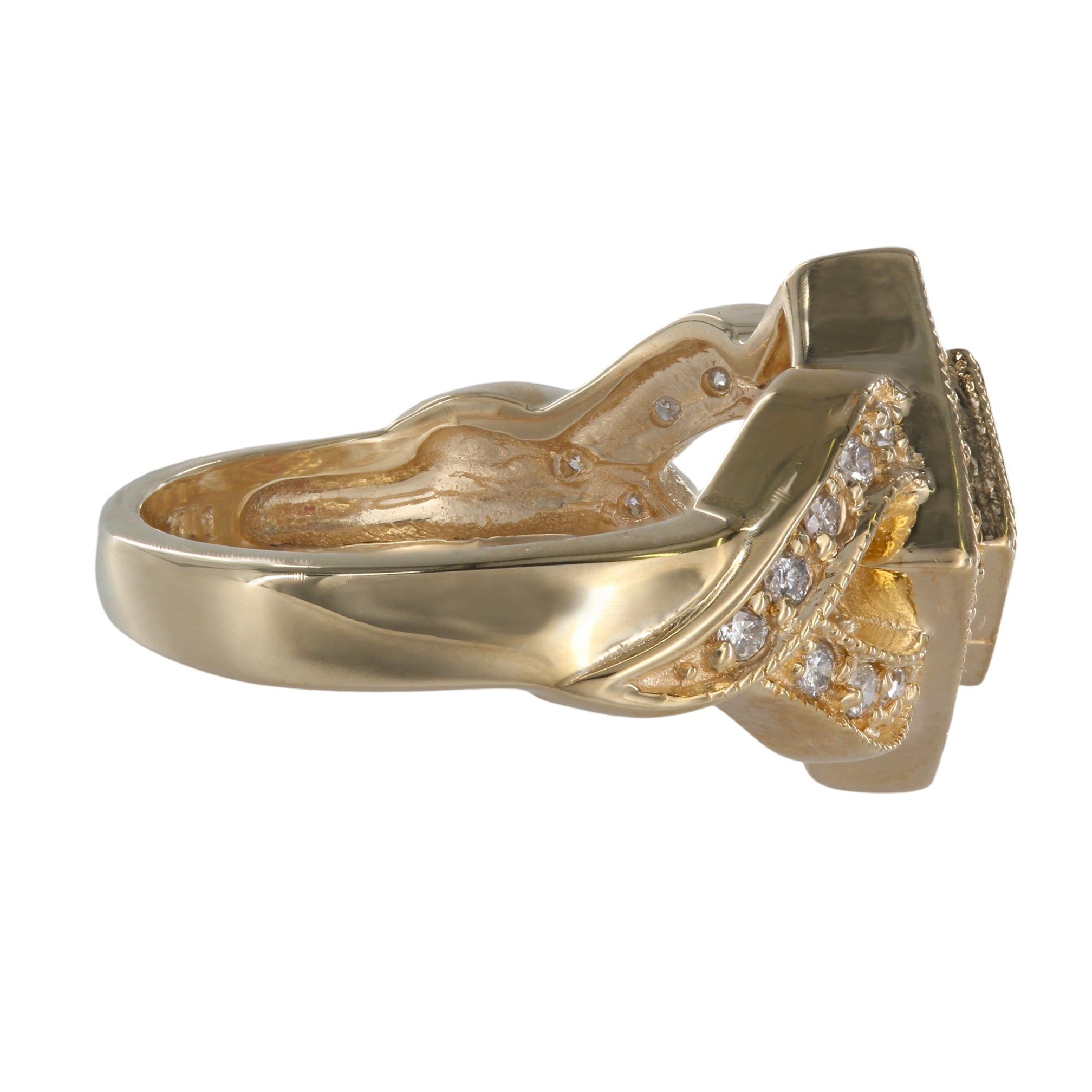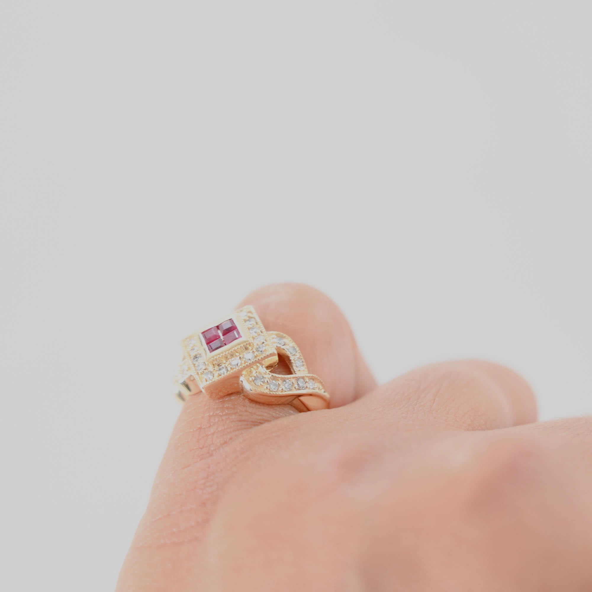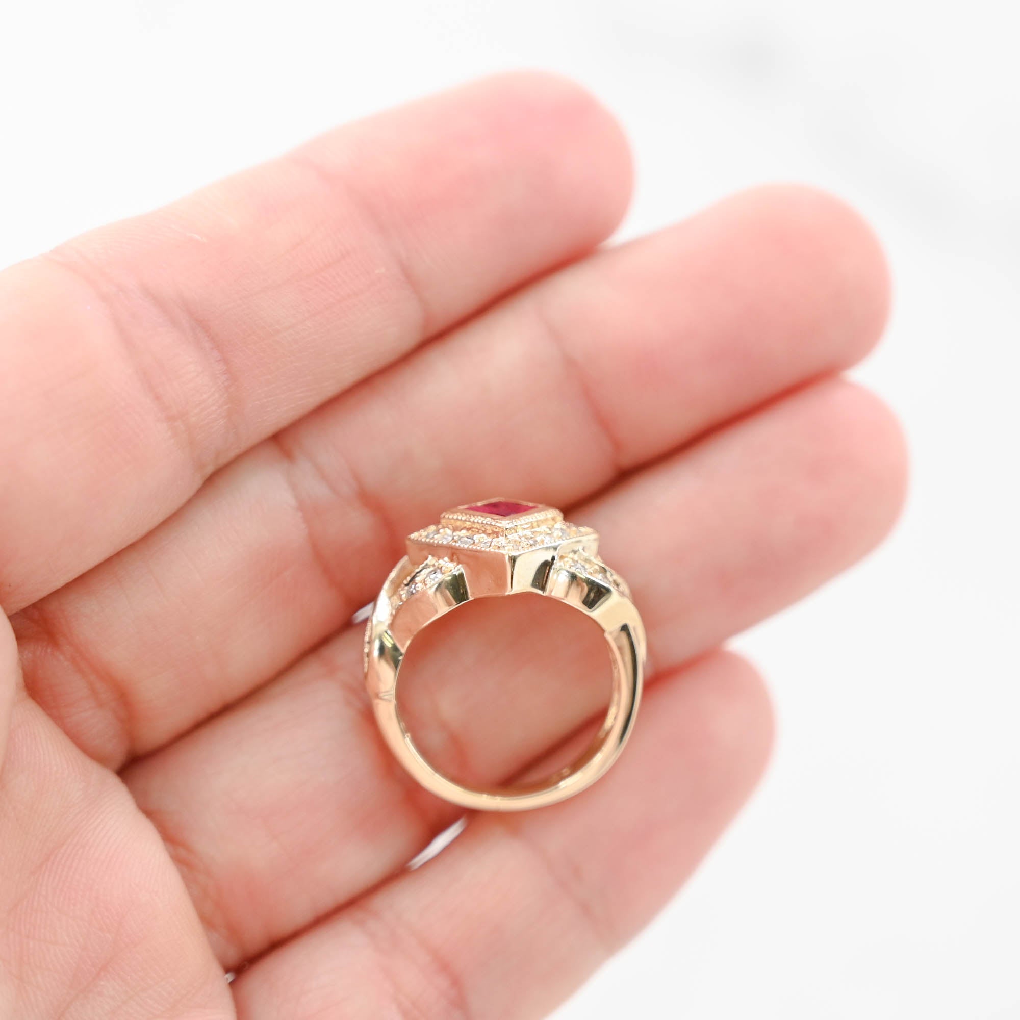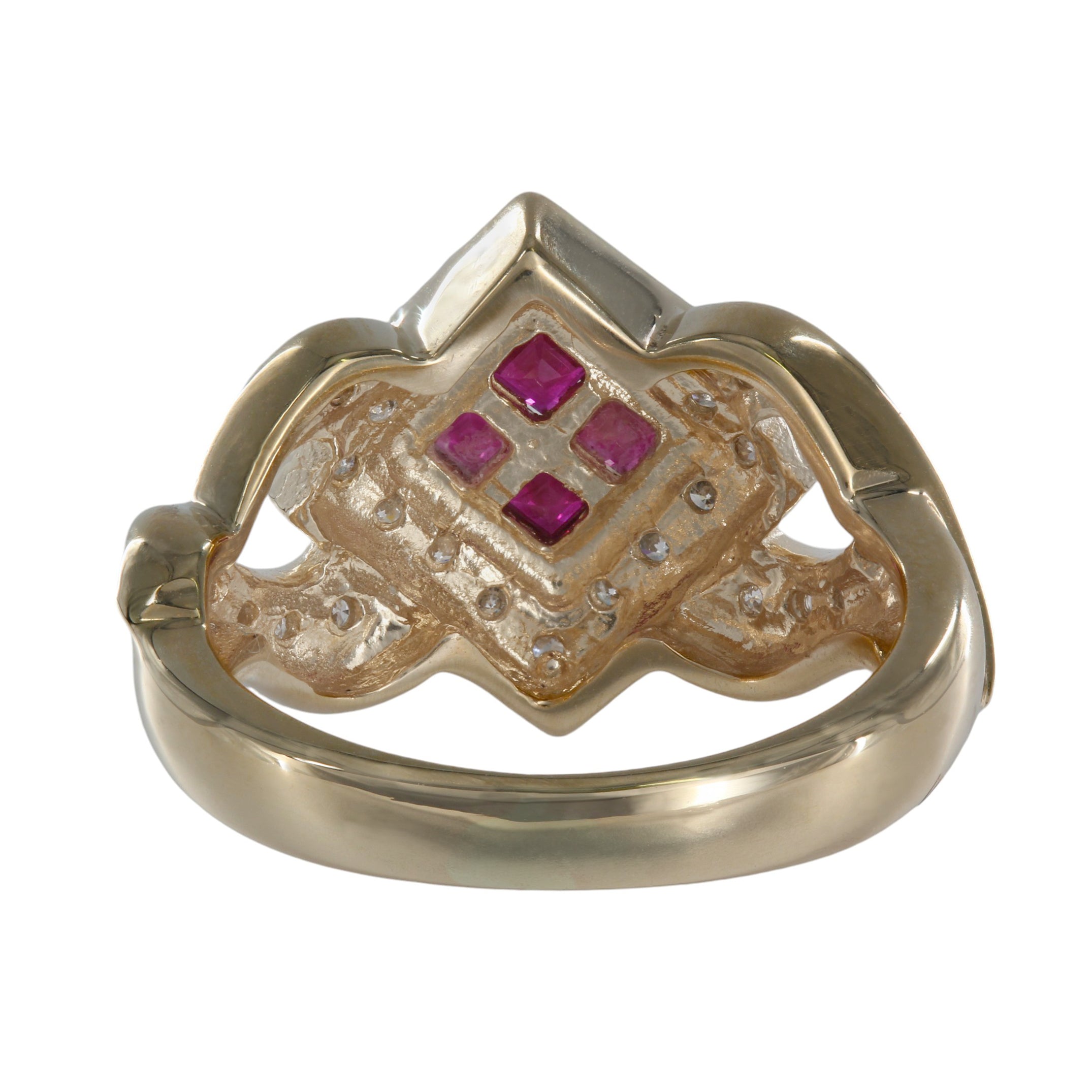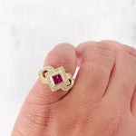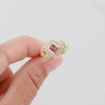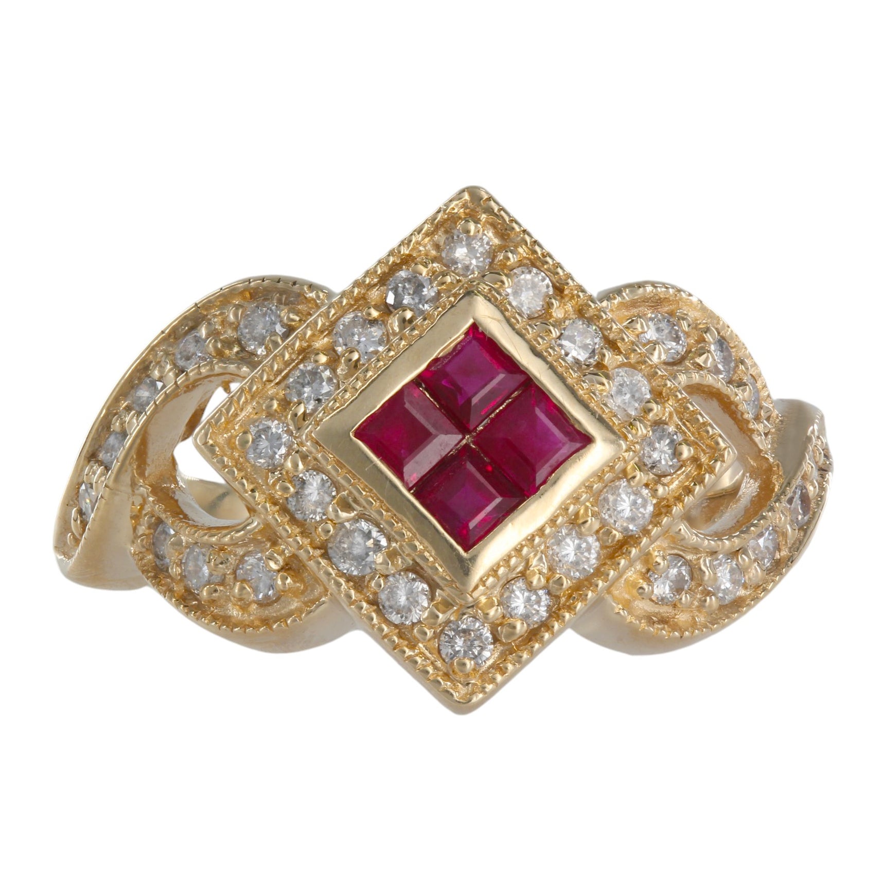 14K Yellow Gold Ruby Cluster Diamond Invisible Setting Millgrain Twisting Band Ring