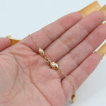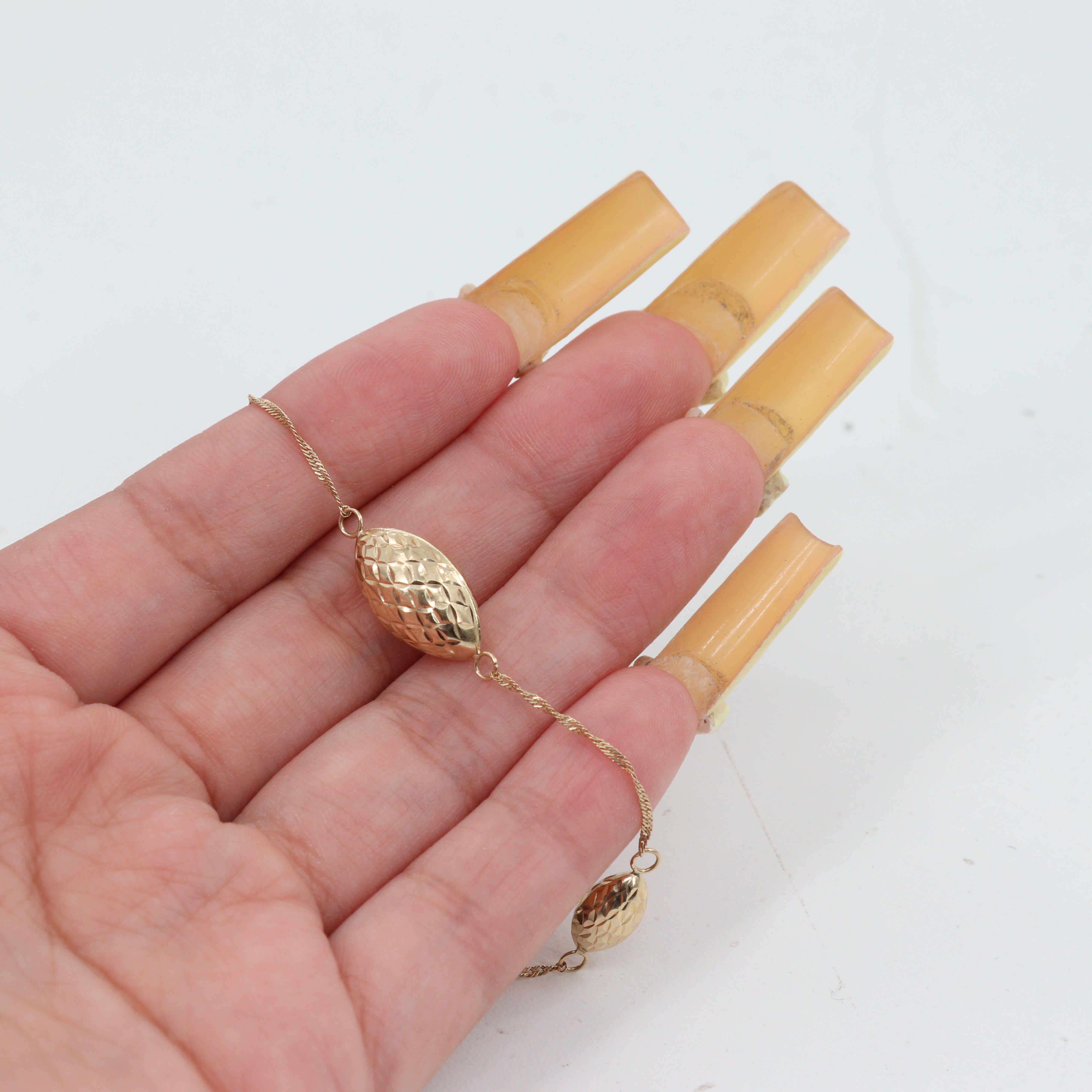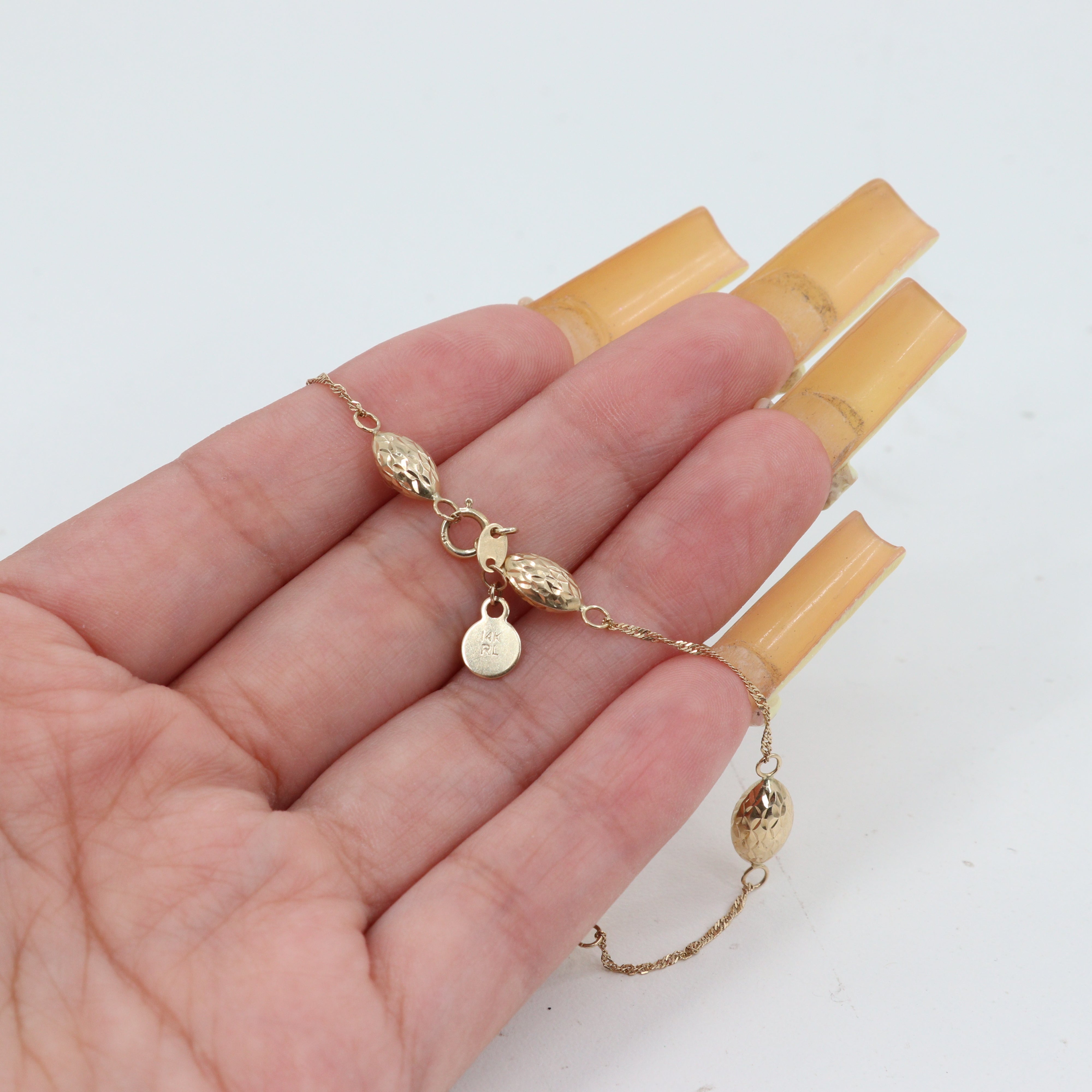 This 14k Yellow Gold Tapered Oval Beaded Bracelet features a delicate 7-inch flat chain accented with five tapered oval gold beads. Crafted in 14k yellow gold, the 1.1mm-wide bracelet is secured with a spring-ring clasp and weighs 2.5g—perfect for subtle elegance and everyday wear.