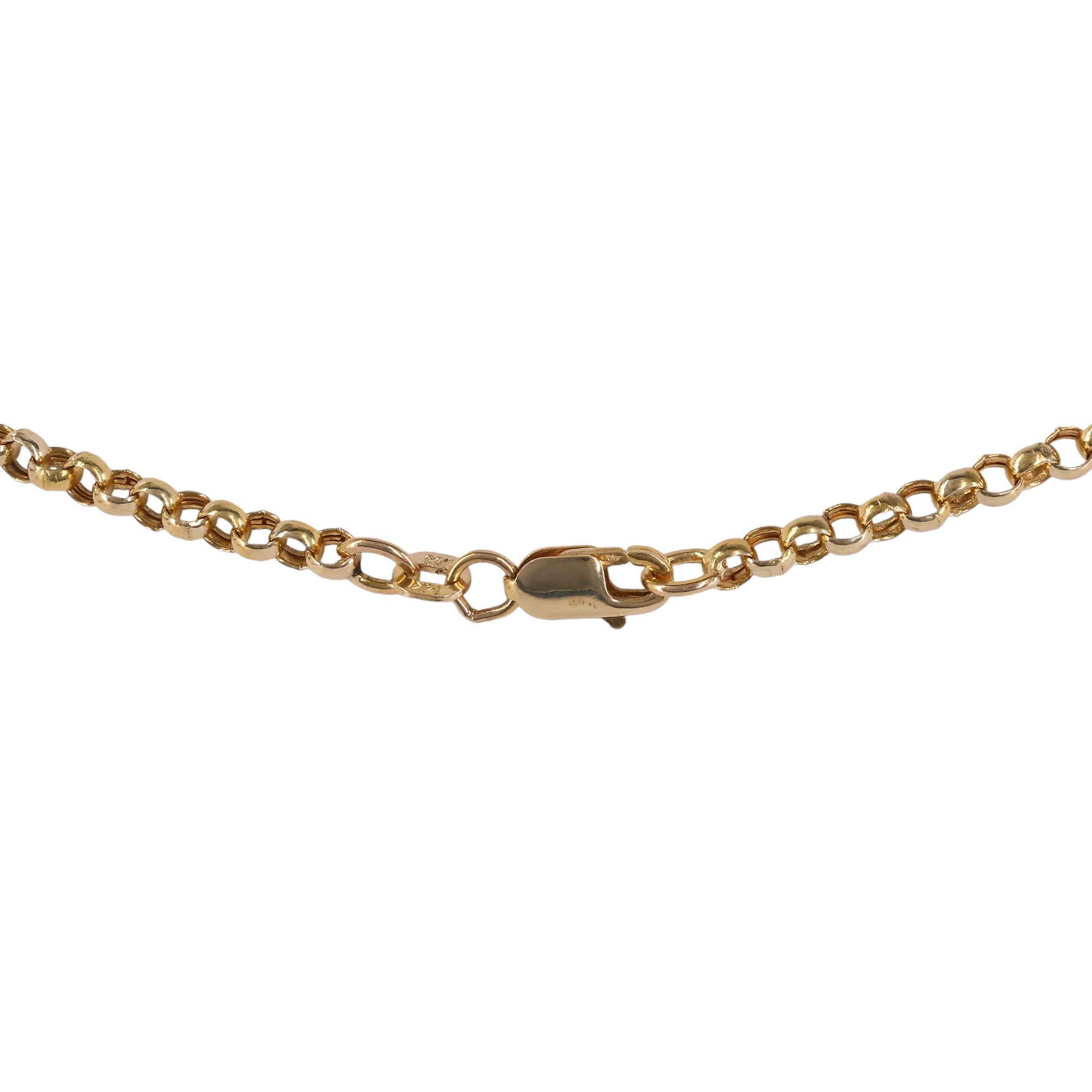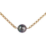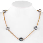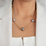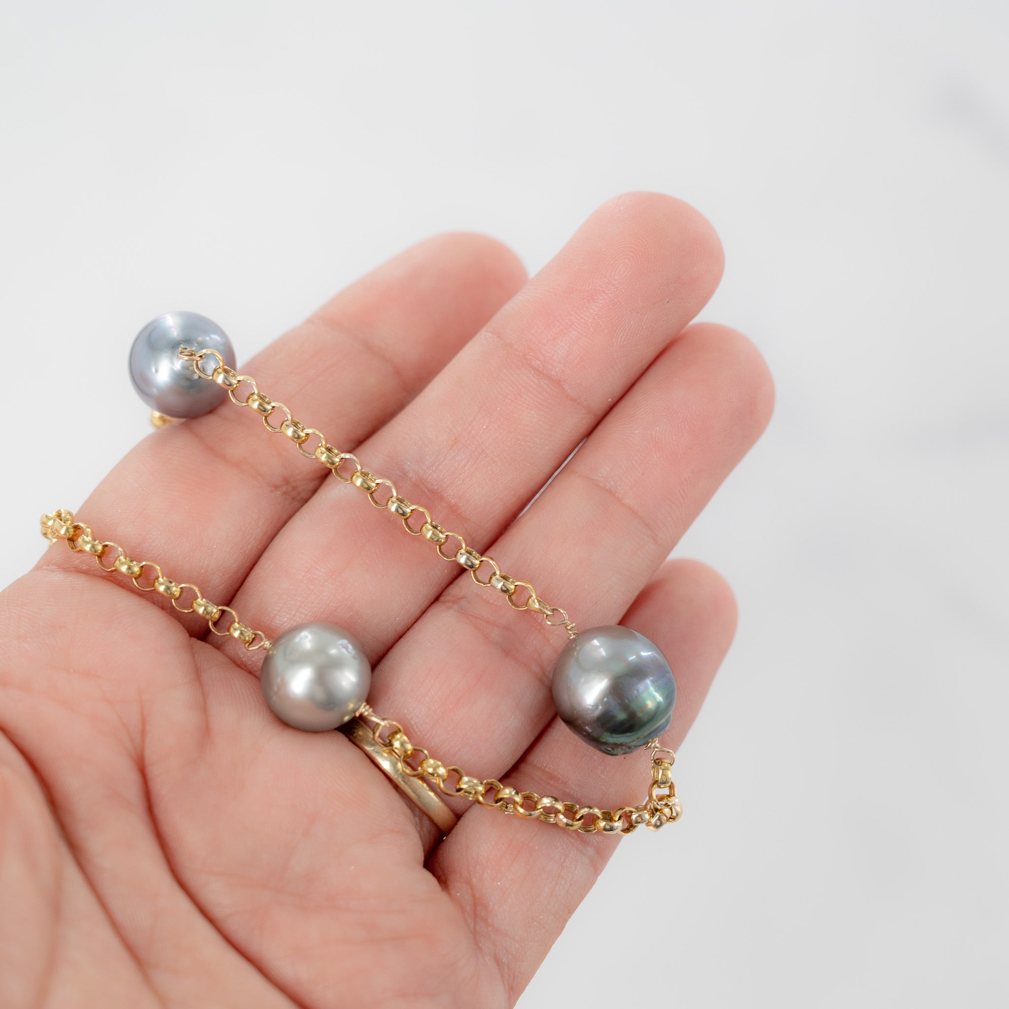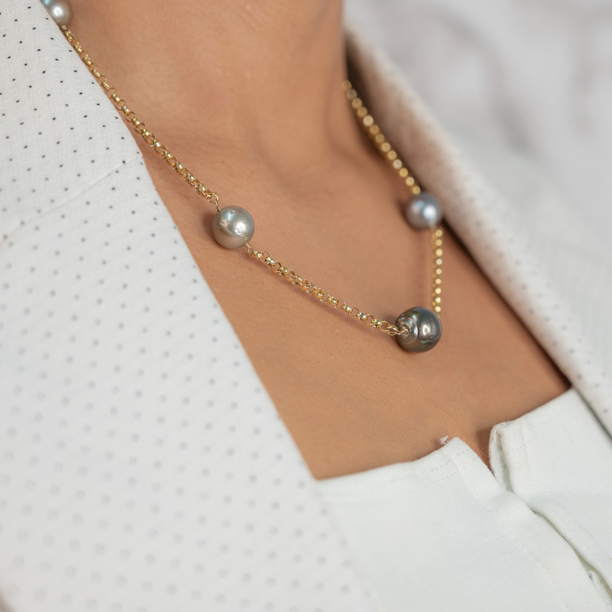 14K Yellow Solid Gold Necklace adorned with 5 big Grey Pearls. This unique piece features a classic rolo link chain, providing the perfect backdrop for the lustrous pearls. Embrace timeless beauty with this exquisite necklace, ideal for adding sophistication to any look.