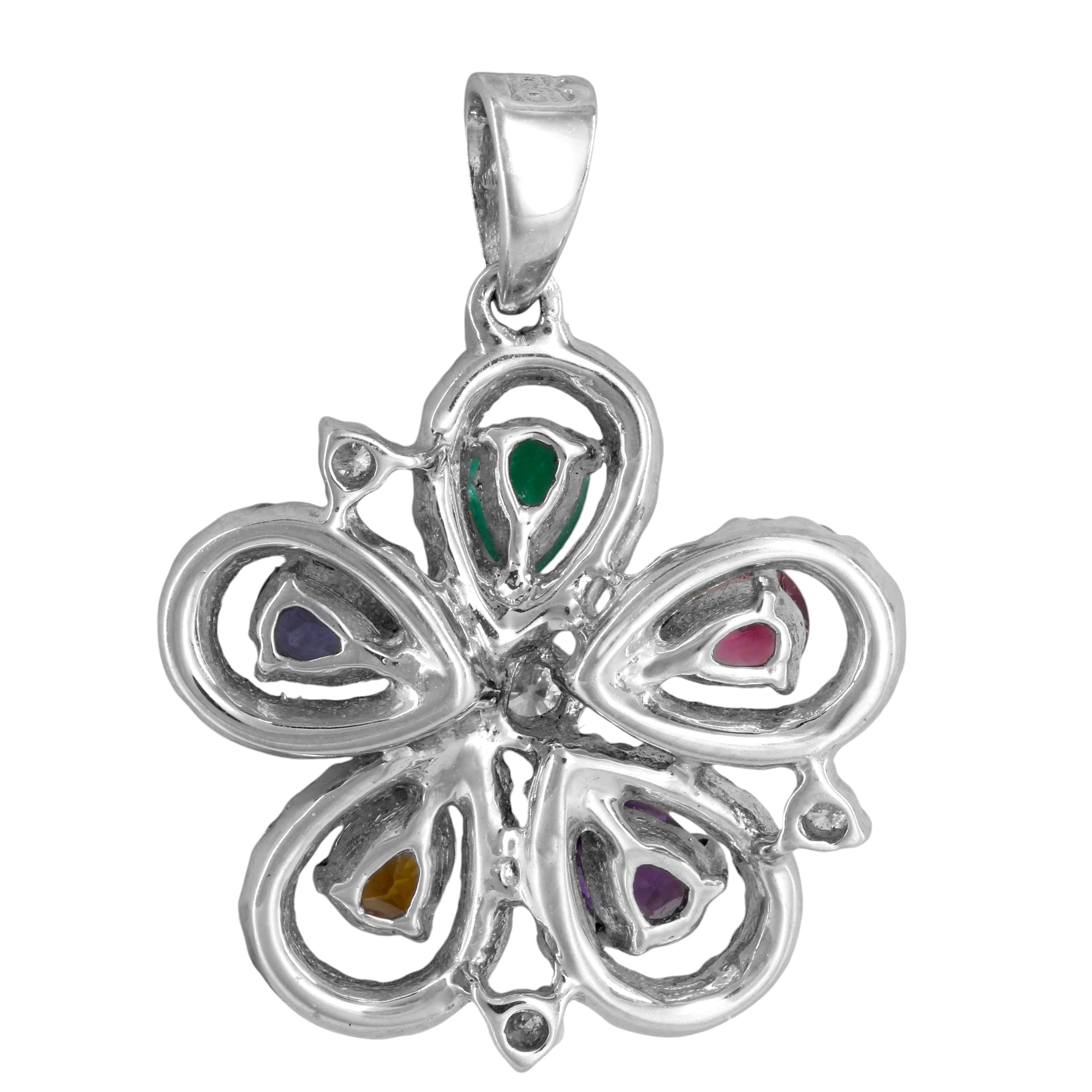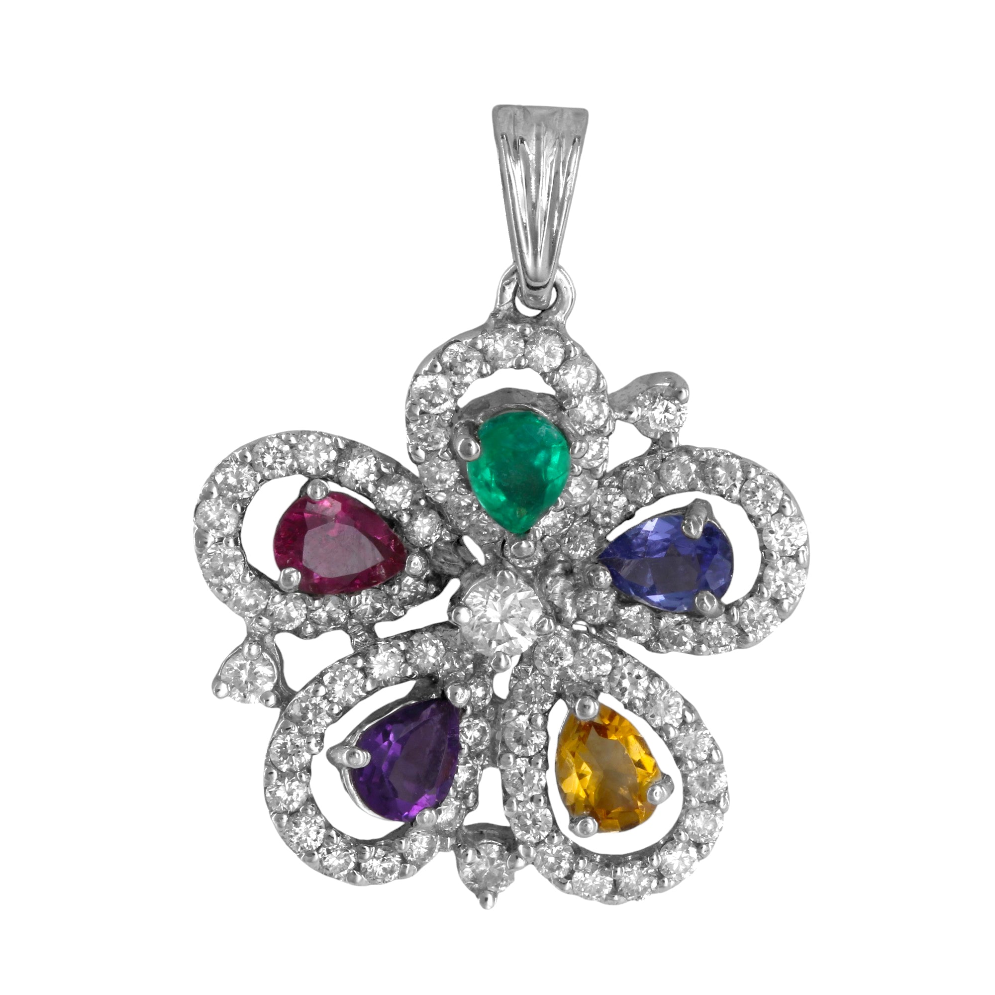 This elegant 18K White Gold Flower Jewelry Set includes a pendant, earrings, and a ring, all adorned with sparkling diamonds (2.10 Ctw) and vibrant gemstones—emerald, ruby, sapphire, citrine, and amethyst (2.76 Ctw). A stunning combination of color and sparkle, this luxurious set is perfect for adding a touch of glamour to any special occasion.