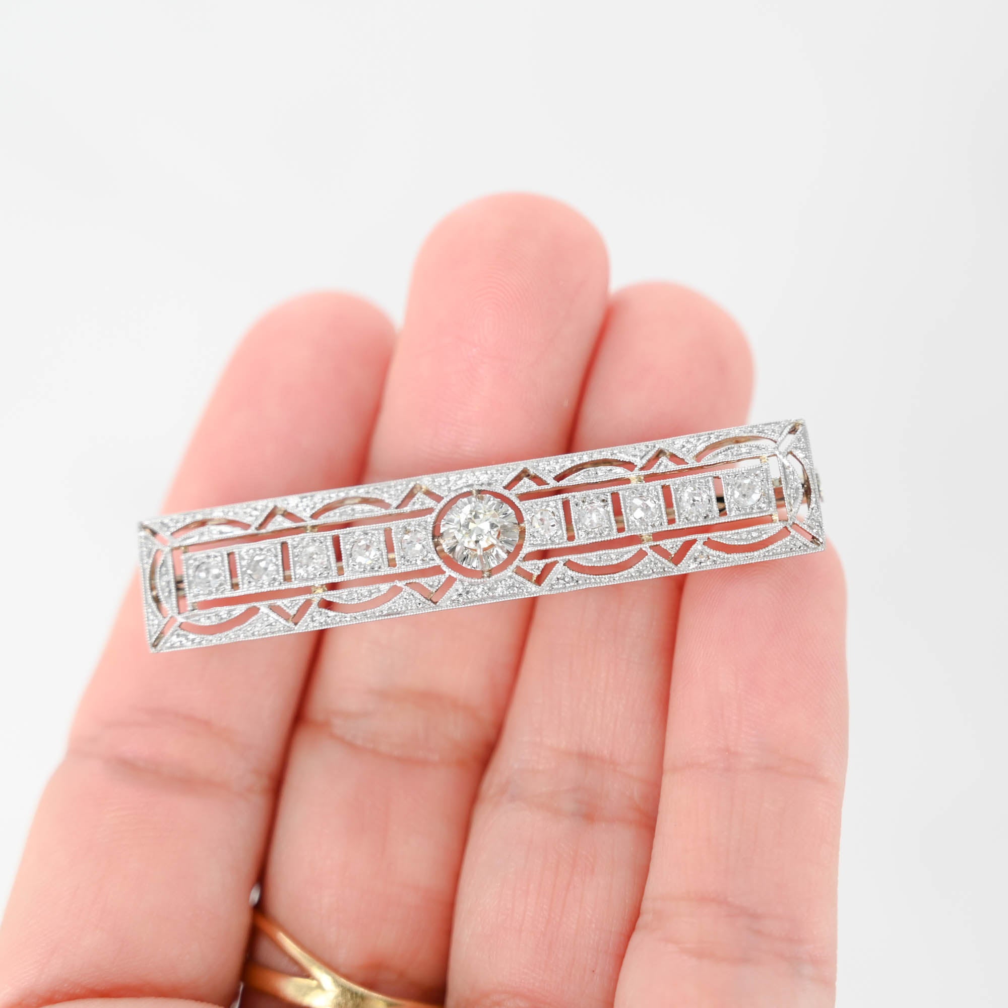 This exquisite 18K White Gold Diamond Antique Milgrain Illusion Setting Center Brooch features a stunning arrangement of sparkling diamonds set in an intricate milgrain design.