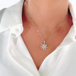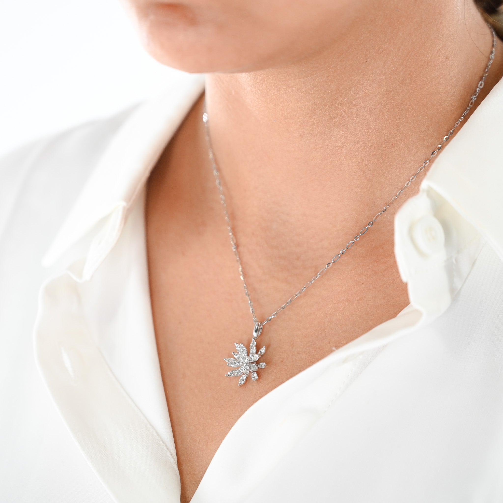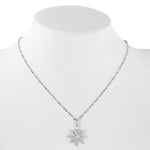 This set is truly stunning largely in part due to the absolutely brilliant quality of diamonds. This gorgeous set features a matching pendant and ring, each containing a 0.05ct center stone and 32 0.02ct accent stones, set in a star-like cluster. These gorgeous VS clarity diamonds are set on a simple band, and hung on a 16" figarolo link necklace.