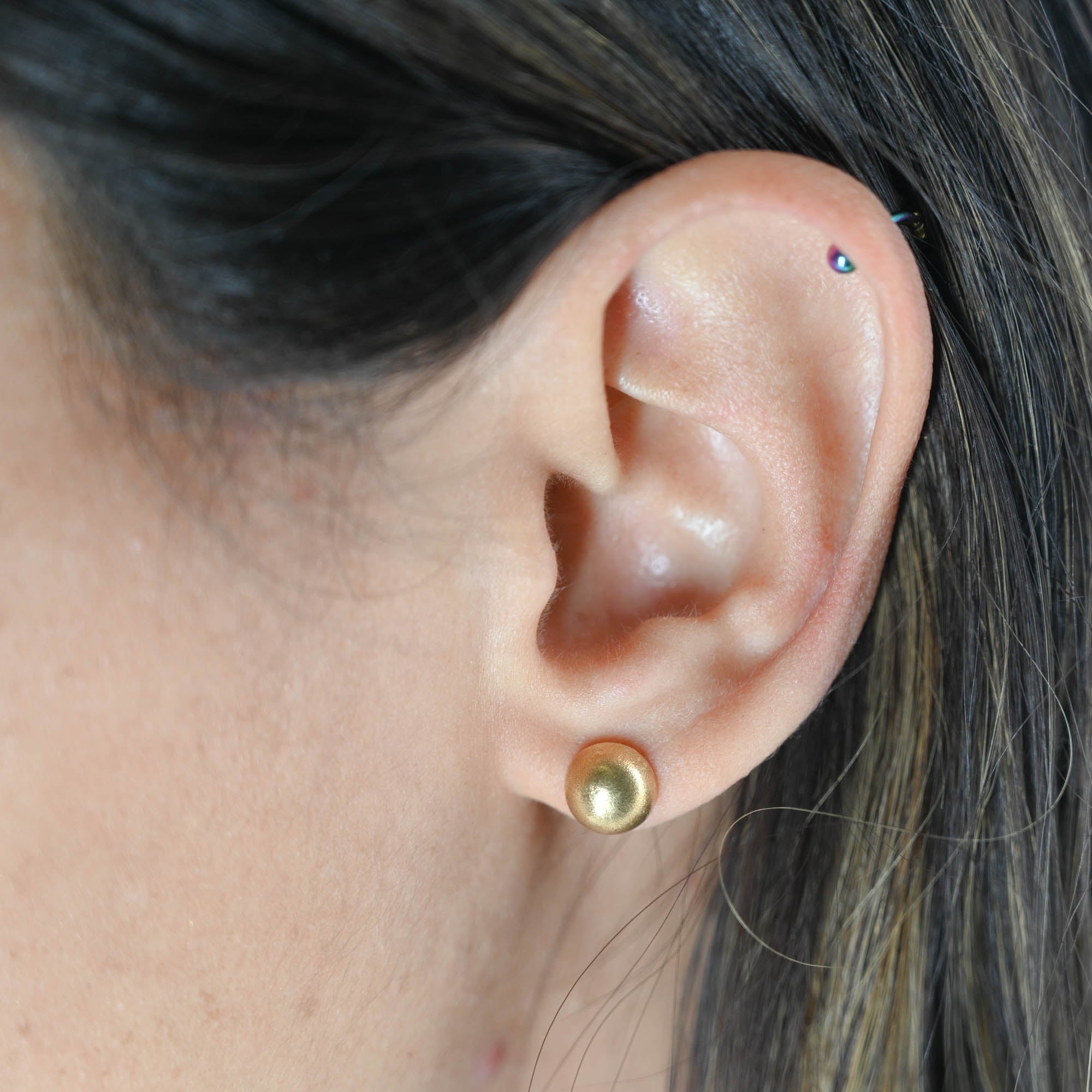Crafted from radiant 18k yellow gold, these Domed Hemisphere Stud Earrings boast a diameter of 8mm, ensuring a subtle yet elegant presence. Secured with a convenient pushback closure, they offer both style and comfort. With a weight of 1.7 grams, these earrings are the perfect accessory to elevate any ensemble.