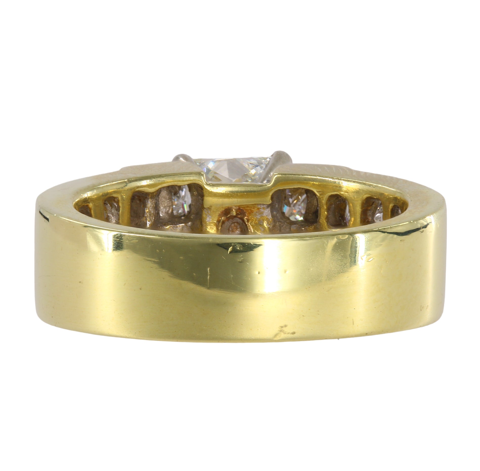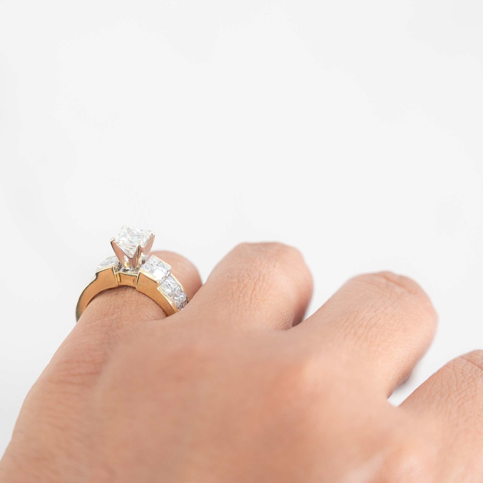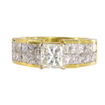 Embrace the timeless allure of our Ladies 18k Yellow Gold Diamond Engagement Ring. This exquisite piece showcases a center Princess cut diamond weighing 1.05 carats, radiating brilliance and beauty. along the center stone are 20 accent Princess cut diamonds, each weighing 0.10 carats, adding a touch of sophistication to the design. With a total carat weight of 3.05 carats.