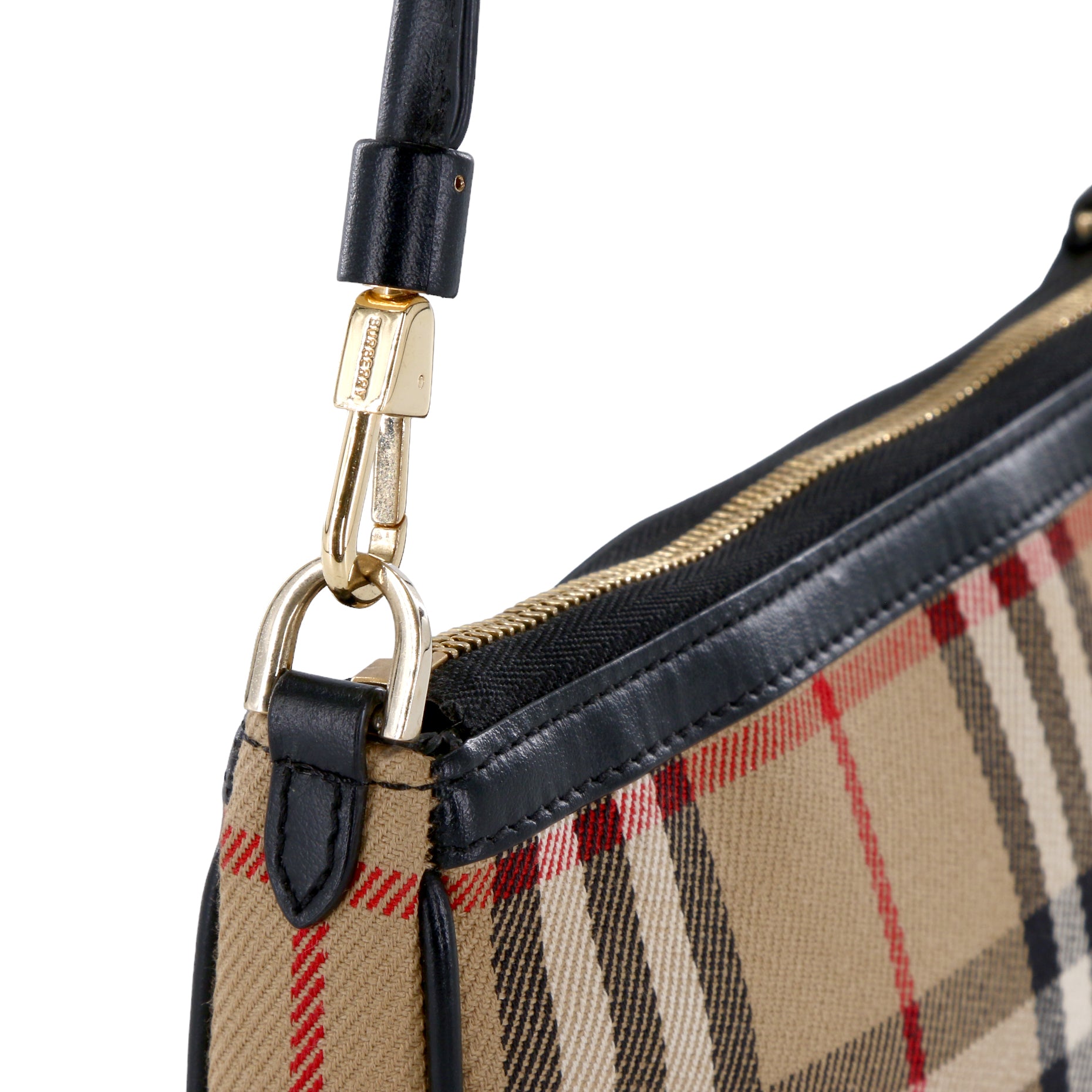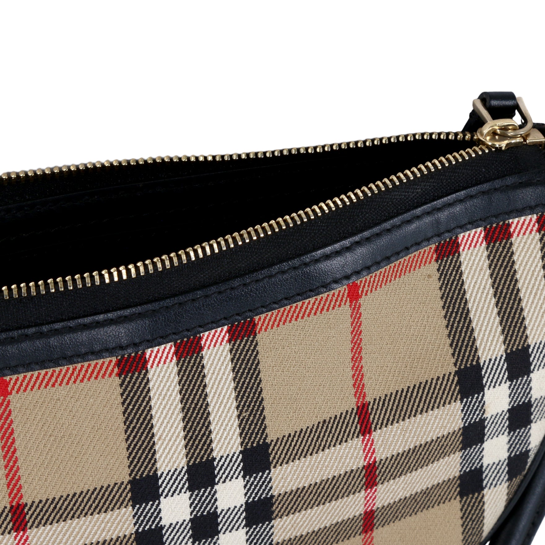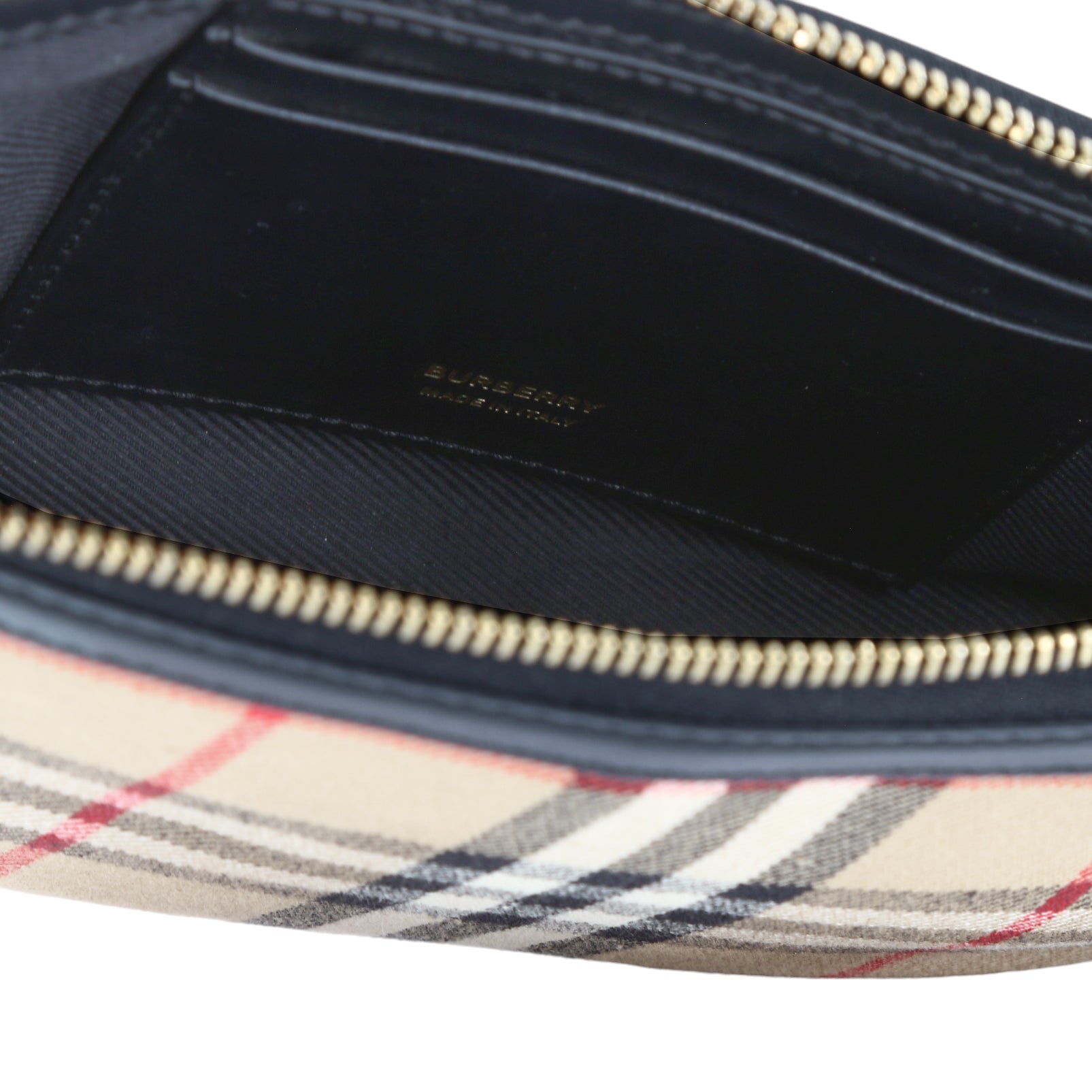 This is an authentic BURBERRY Vintage Check Calfskin Olympia Slim Pouch in Archive Beige. This petite bag is crafted of check coated canvas in beige. The bag features a black leather trim, an optional black leather handle, and gold hardware. The top zipper opens to a black fabric interior.
