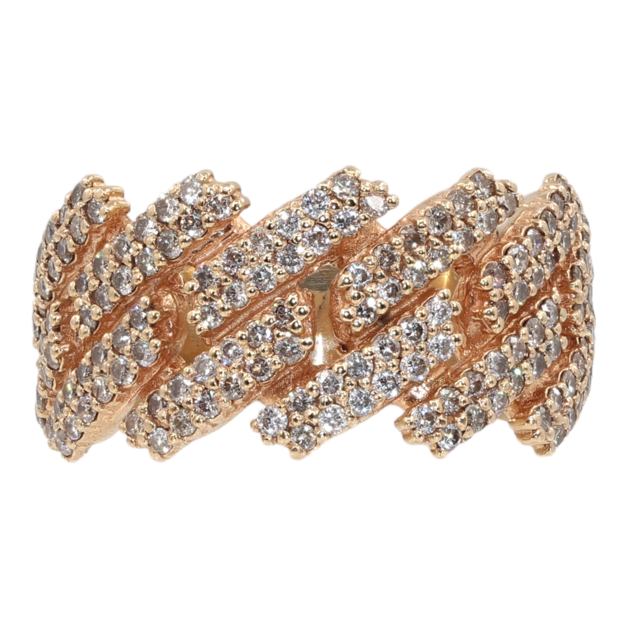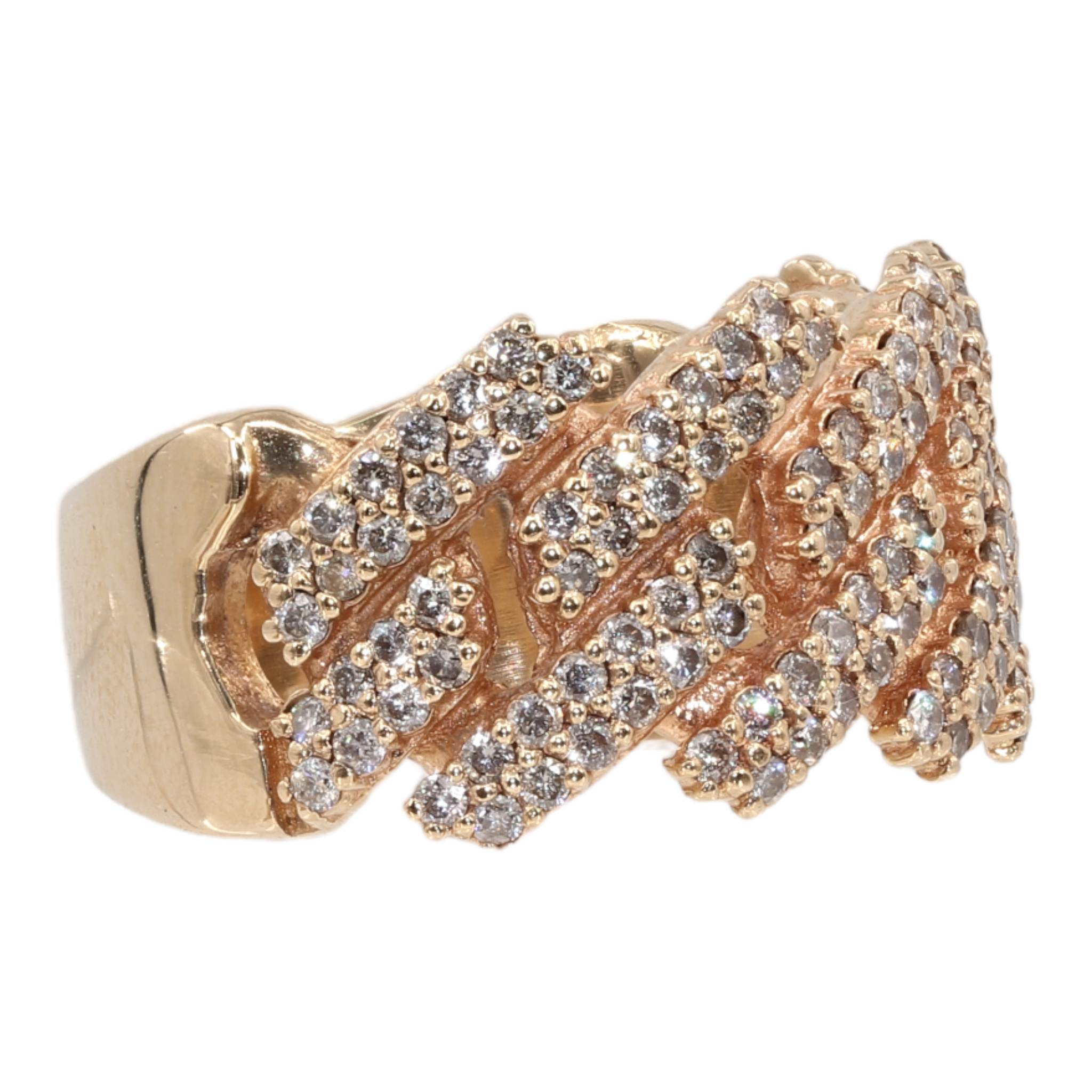 Adorn your hand with the timeless elegance of our Estate 14k Yellow Gold Diamond Cuban Link Ring. This exquisite ring, designed for a size 9 finger, boasts a substantial 6.25mm shank and a striking 12.5mm head, creating a bold yet graceful statement piece. The centerpiece of this ring is adorned with a stunning array of 146 round brilliant cut diamonds, each 0.01ct, resulting in a remarkable total carat weight of 1.46ctw. Crafted from luxurious 14k yellow gold, this ring carries a weight of 10.6g, symbolizing both opulence and enduring quality. Elevate your jewelry collection with this exceptional diamond Cuban link ring, a true masterpiece of sophistication and style.