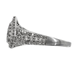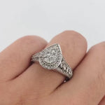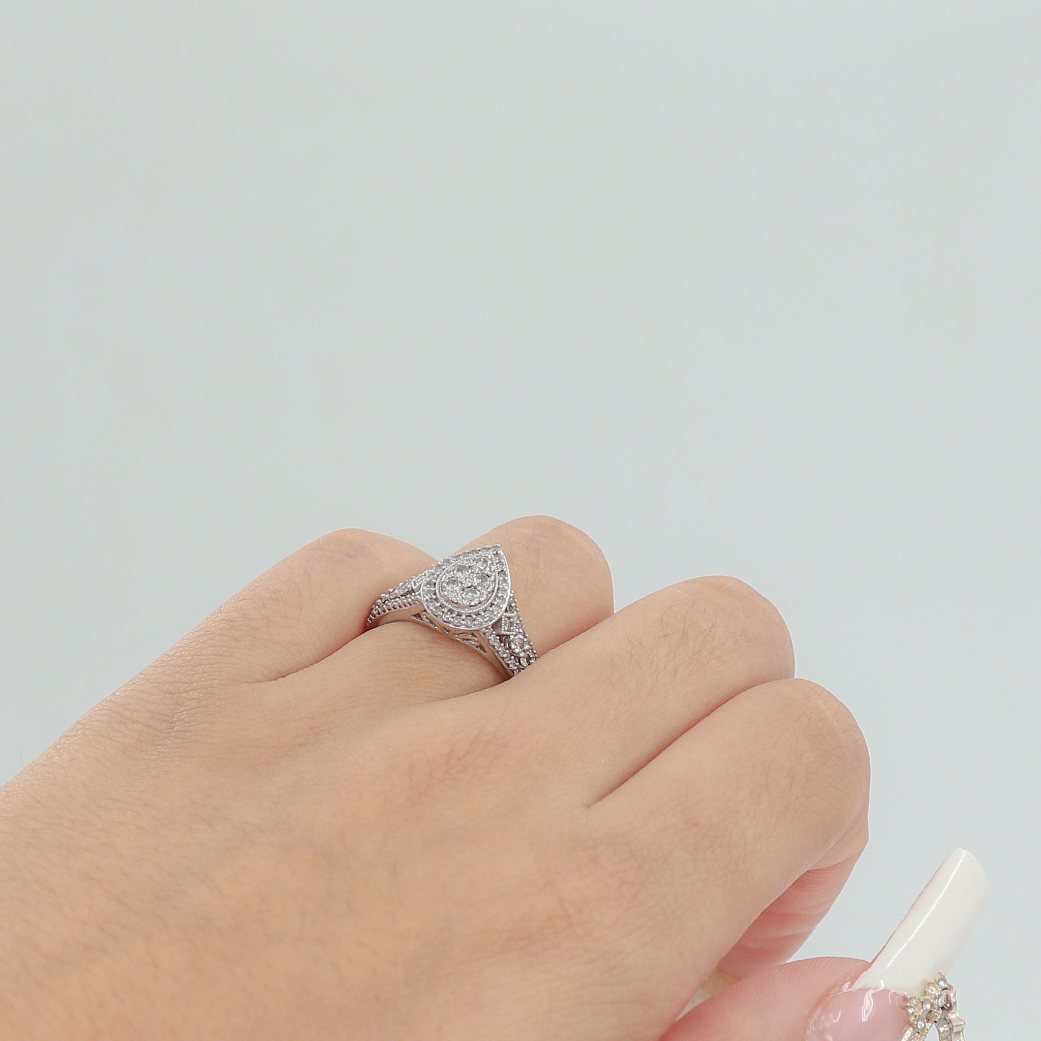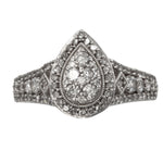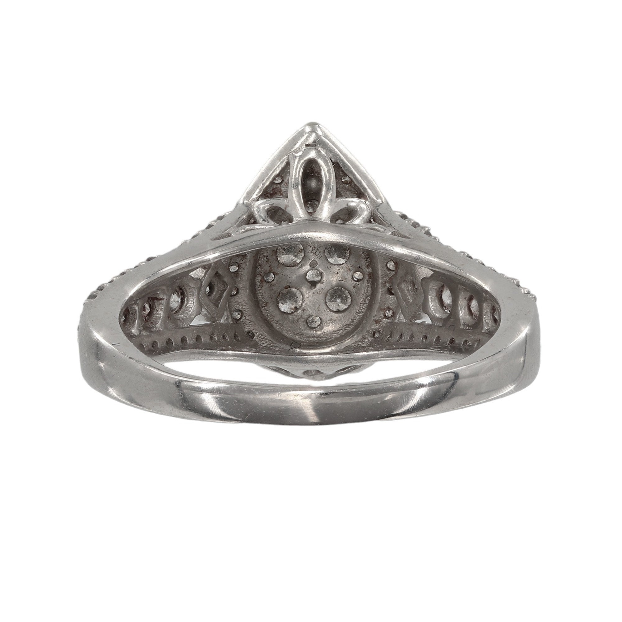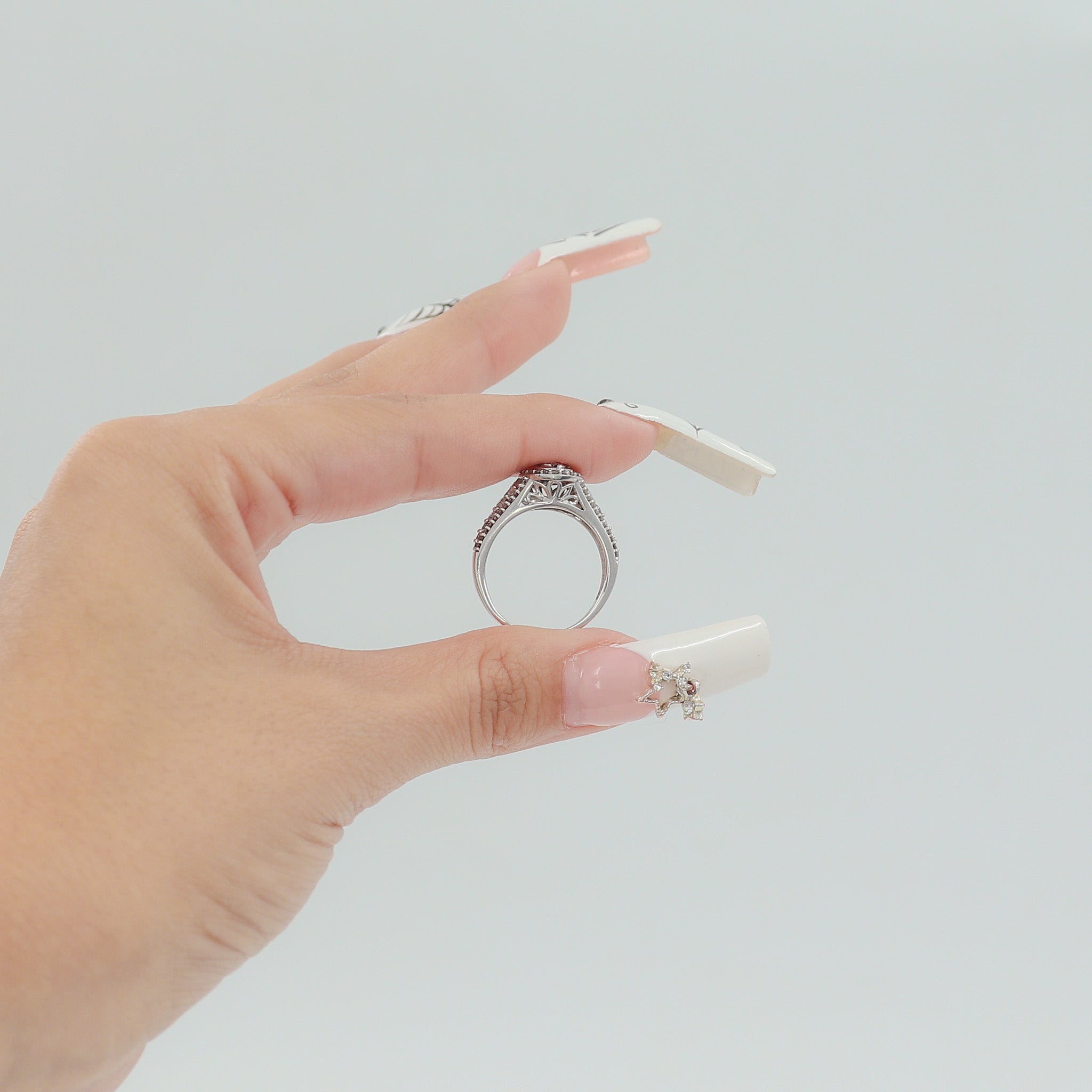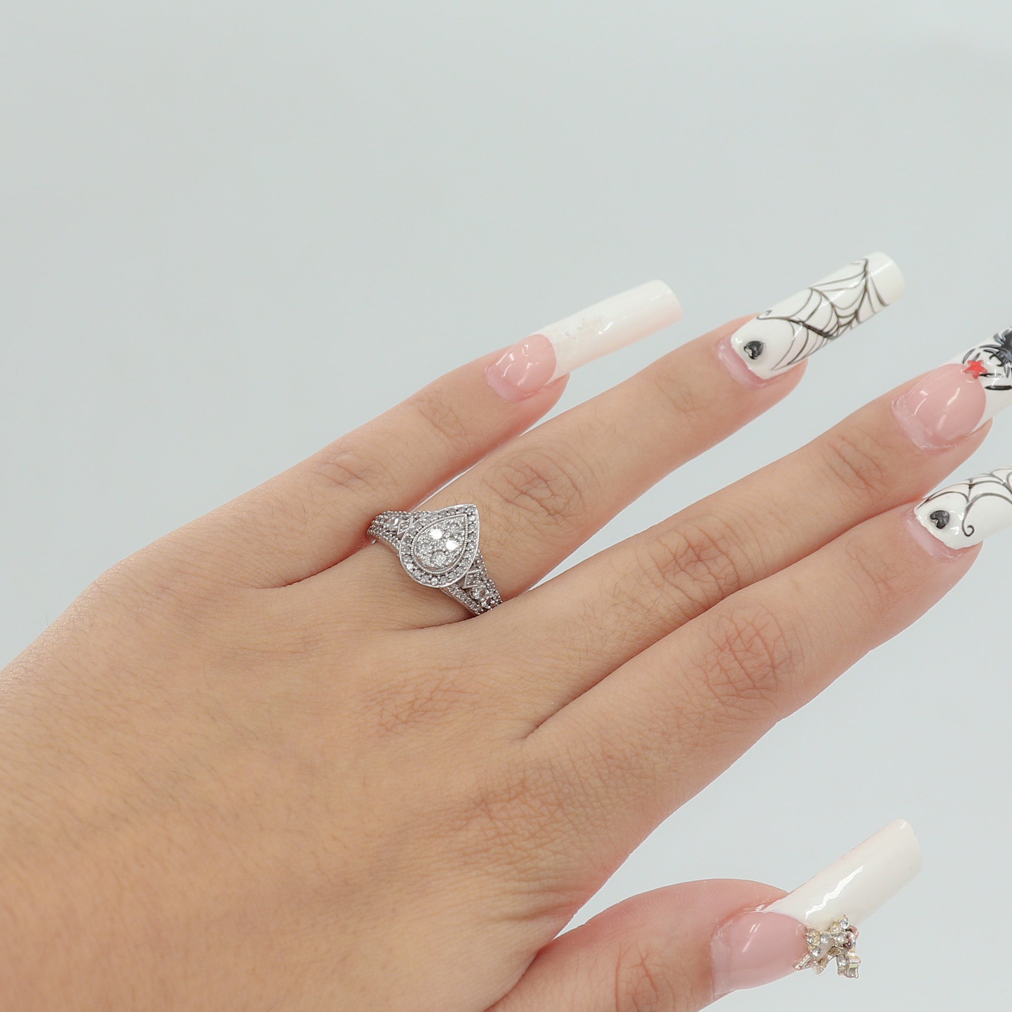 Indulge in sophistication with our Ladies 10k White Gold Diamond Cocktail Ring, a dazzling expression of timeless beauty. The slender 2mm shank delicately supports a captivating arrangement of diamonds. The 13mm head size is adorned with a spectacular ensemble, featuring 7 center round brilliant cut diamonds with a substantial 0.05ct each, accentuated by a single 0.01ct diamond, 2 diamonds at 0.025ct each, 4 diamonds at 0.015ct each, and 7 more at 0.05ct each, creating a total carat weight of 0.85ctw. The stones, ranging in color from H-J, with I1 clarity, are set in lustrous 10k white gold, adding an air of elegance to the 7.75 ring size. Weighing 3.5g, this ring is an exquisite testament to refined style and enduring grace.