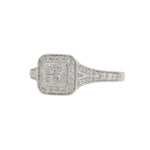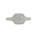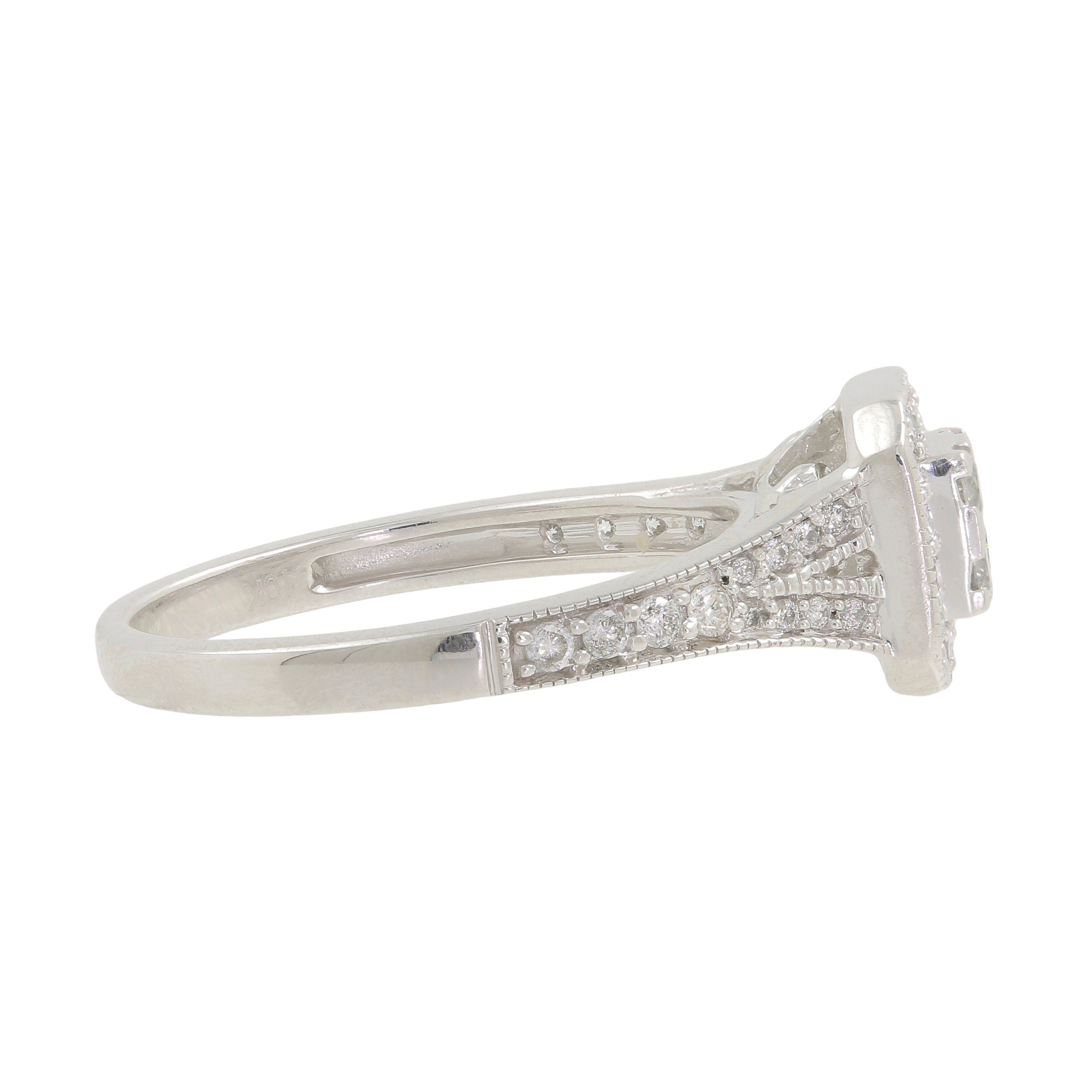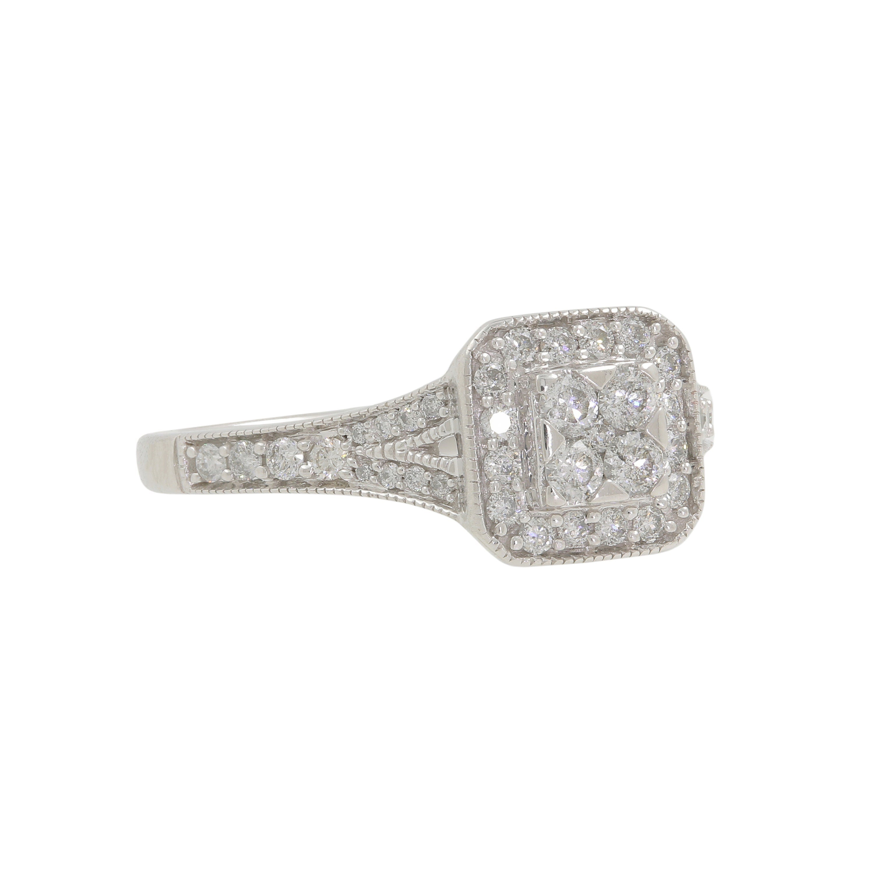 Brilliant and meaningful, this diamond ring raises genuine admiration. Created in 10-karat white gold, this ring showcases a composite of brilliant round diamonds at its center. A border of smaller accent diamonds surrounds the center cluster, while additional diamonds and milgrain-detailing along the split shank add heirloom appeal. The engagement ring is accompanied by a matching prong-set, round-cut diamond wedding band.