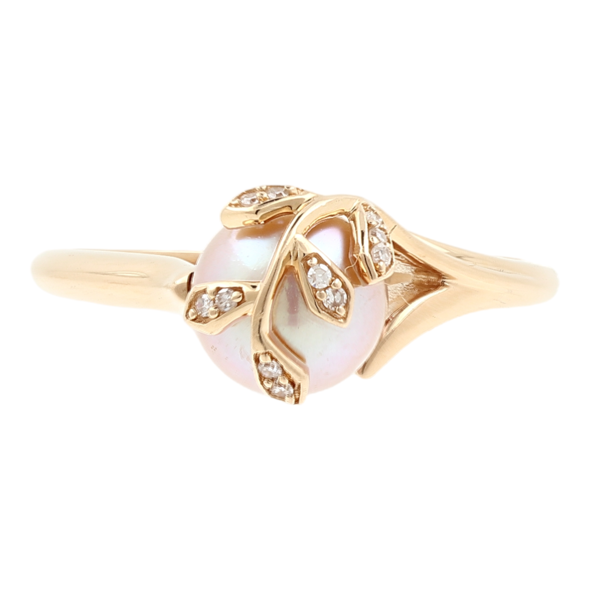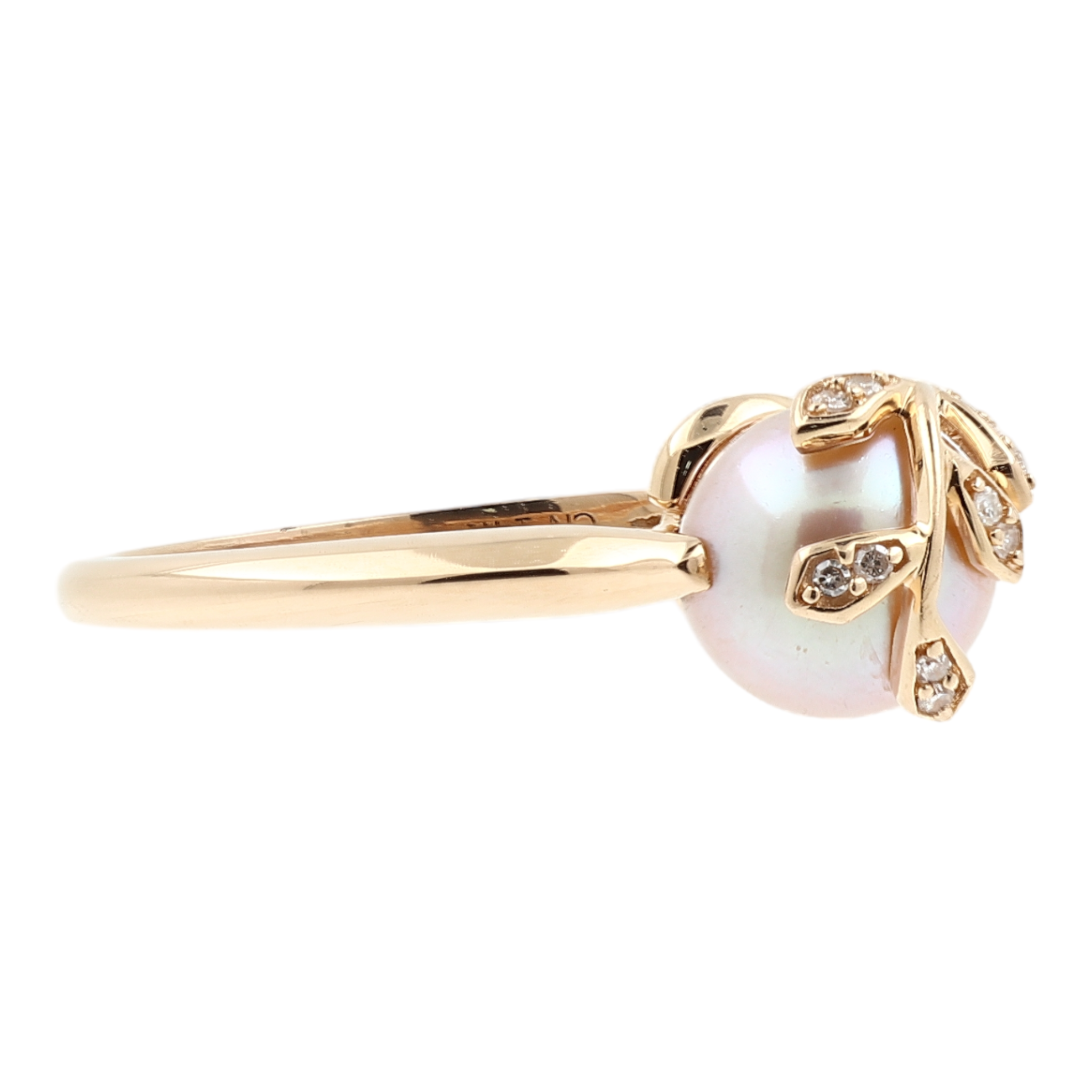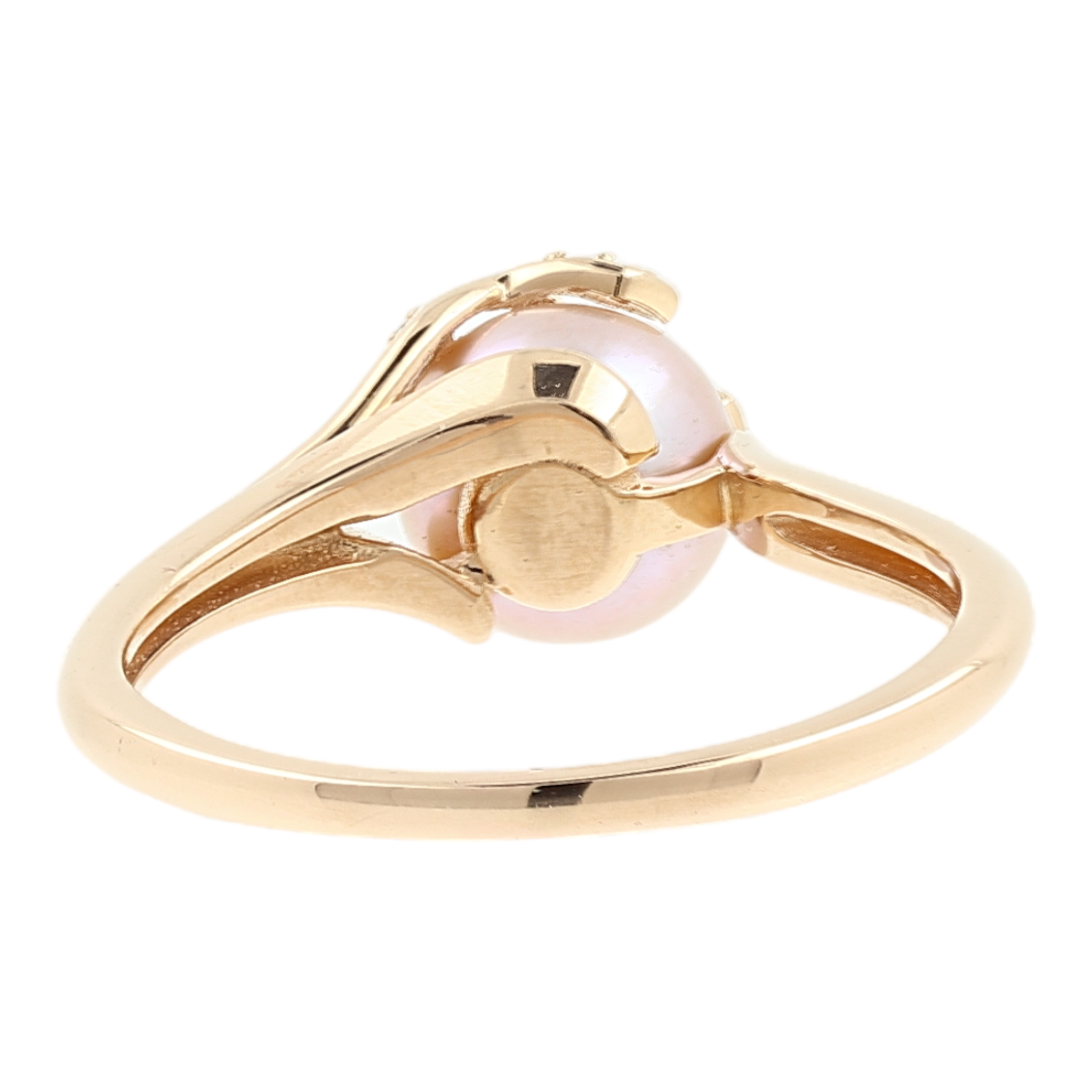 Make a statement of elegance and sophistication with our Ladies 14k Rose Gold Diamond and Rose Pearl Ring. The delicate shank, measuring 1.4mm, beautifully complements the head size of 8mm, creating a harmonious design. The centerpiece of this ring is a stunning 7.6mm rose pearl, exuding natural beauty and grace. Adorning the band are 11 round cut accent diamonds, with a total carat weight of 0.055, adding a touch of sparkle and luxury. Crafted with 14k rose gold and weighing 3.5g, this ring showcases both quality and style. Perfect for special occasions or as a symbol of your refined taste, this ring is a true masterpiece.