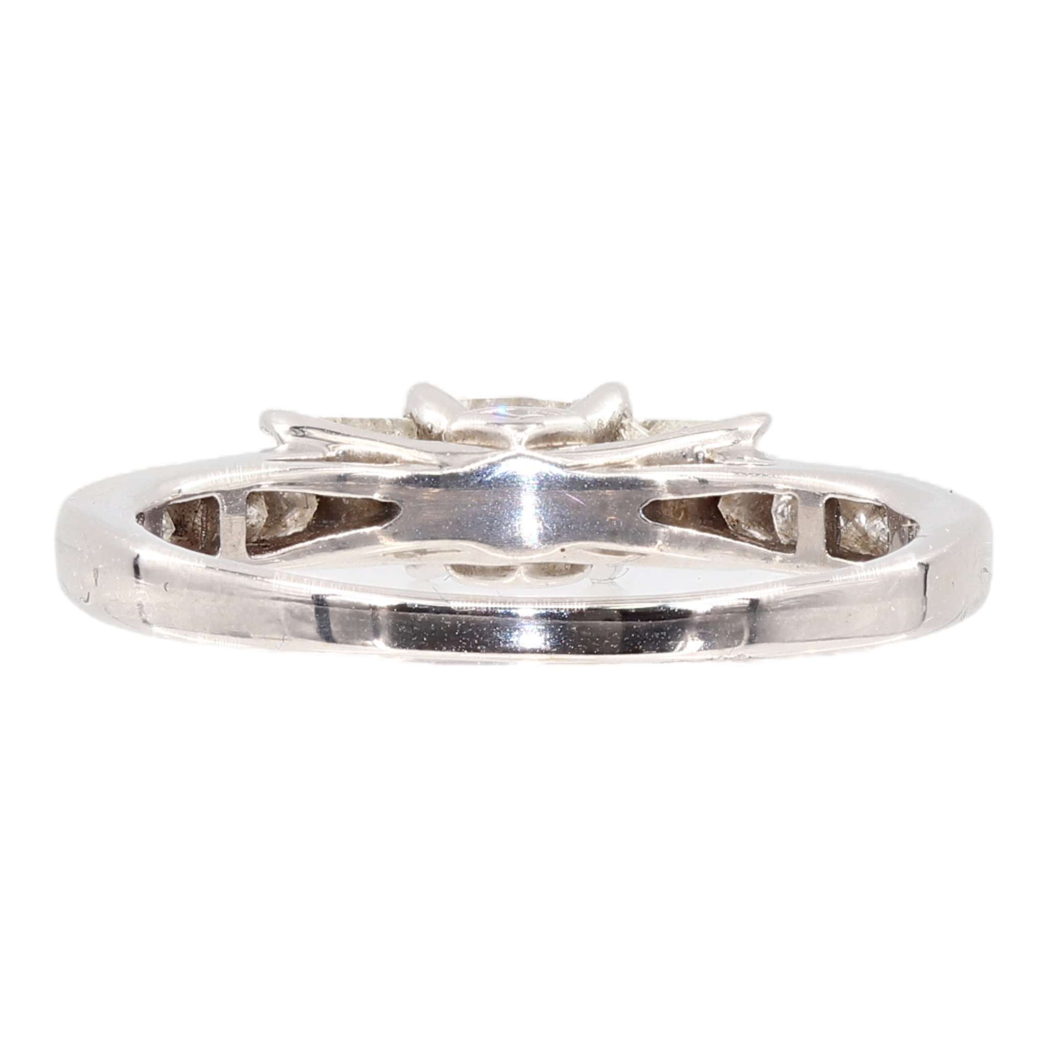 Celebrate love with our Ladies 14k White Gold Princess Cut Diamond Engagement Ring. With a dainty 1.45mm shank and a 4.7mm head, this size 7.75 ring is a symbol of elegance. Its centerpiece boasts a sparkling princess cut diamond of 0.40ct, flanked by two accent princess cut diamonds, each 0.20ct, creating a stunning focal point. Ten accent princess cut diamonds, each 0.04ct, and two more accent princess cut diamonds, each 0.02ct, complete the ensemble, culminating in a total carat weight of 1.24ctw. Meticulously crafted from 14k white gold, the ring weighs 3.1g, encapsulating grace and lasting commitment.