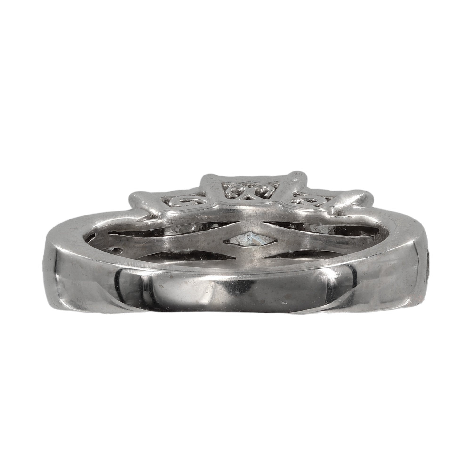 Embrace the timeless beauty of our Ladies 14k White Gold Princess Cut Diamond Engagement Ring. With a slender 2.5mm shank and a captivating 13.5x6mm head, this ring is designed to perfection. The centerpiece boasts a stunning princess cut diamond of 0.29ct, gracefully complemented by two accent princess cut diamonds, each weighing 0.15ct. Enhancing the allure, ten accent round-cut brilliant diamonds of 0.025ct each and twenty-four smaller accent round-cut diamonds of 0.0067ct each add to the grandeur, achieving a total carat weight of 1.0ctw. The stones, exhibiting a color range of G-I and clarity of I2, are set in a lustrous 14k white gold band that weighs 4.5g. Elevate your special moments with this exquisite engagement ring, a symbol of enduring love and sophistication.