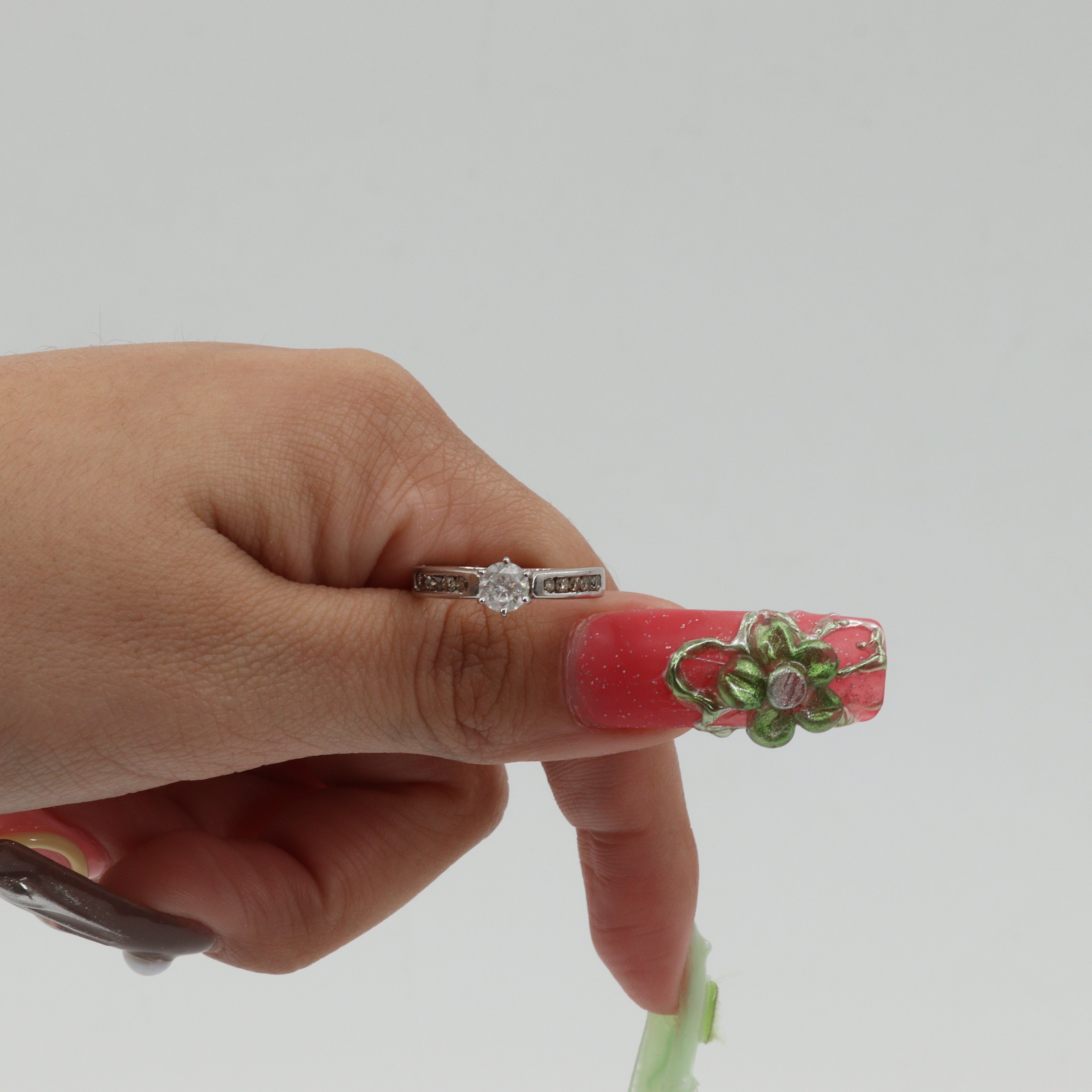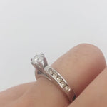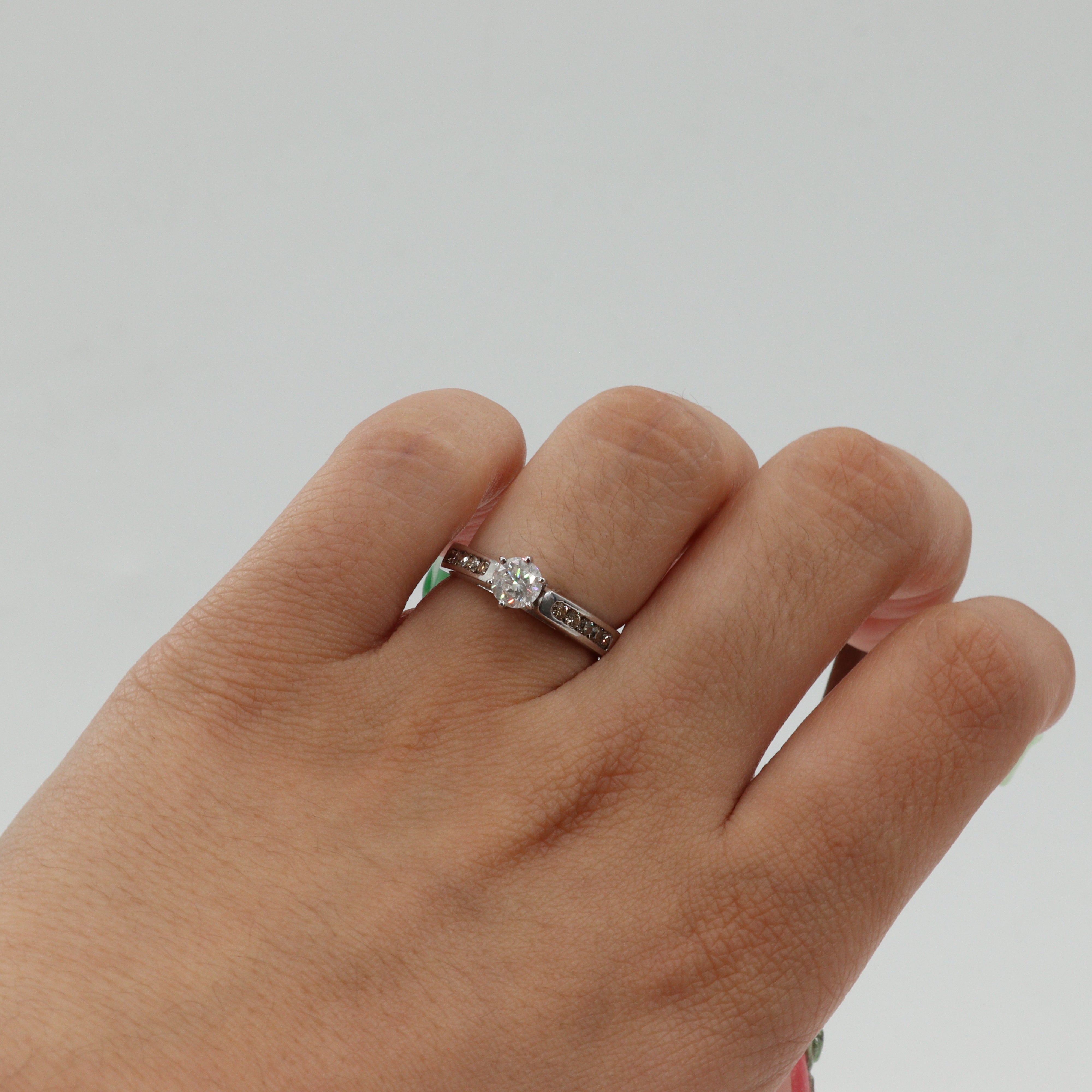 Set on a 10k white gold high polished setting, expertly crafted with a prong setting that holds a scintillating 0.48ct brilliant round cut diamond. Accenting the center stone are channel set shimmering round cut diamonds that add an impressive presentation to the shoulders. Tell her how much she means to you with this diamond 0.78CTW solitaire ring.