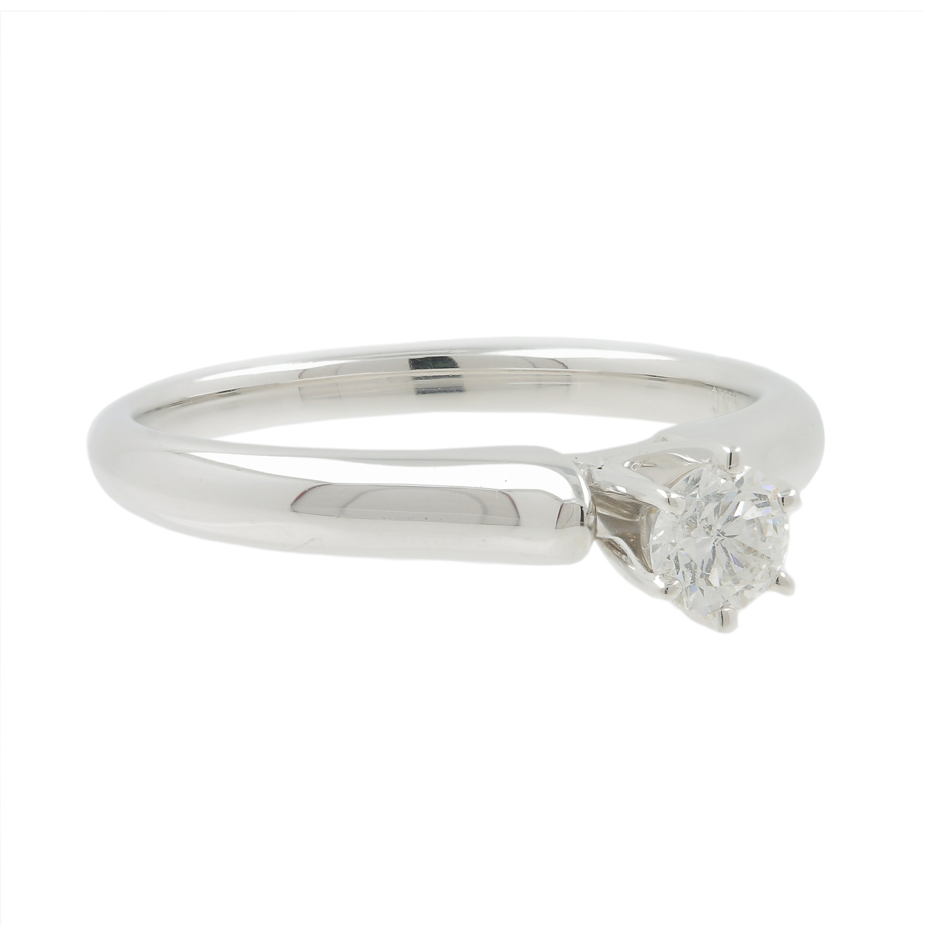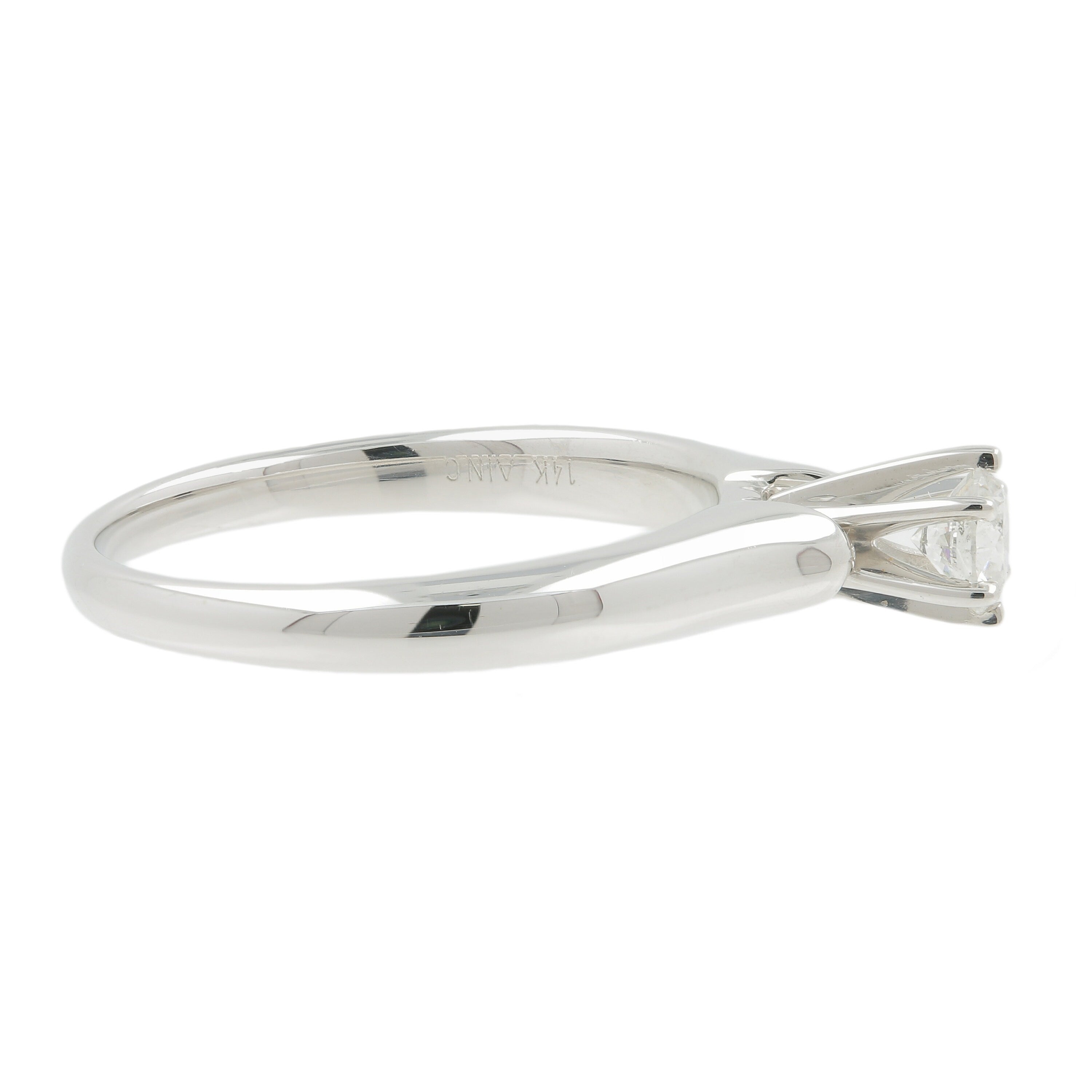 The superb quality of this exquisite engagement ring speaks for itself. A stunning 0.70 ct. round diamond solitaire, with a color ranking of H and a clarity of SI2, is nestled in a traditional 14-karat white gold six-prong setting, designed to beautifully complement the stone. Comes with a lovely gift box and a complimentary professional final polish.
