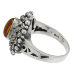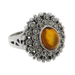 Give yourself an exotic look destined to make heads turn. Fashioned in sterling silver, this beautiful style highlights an oval cabochon amber stone wrapped in a double halo of marcasite stones. Truly a one-of-a-kind, this extraordinary ring will make a statement.