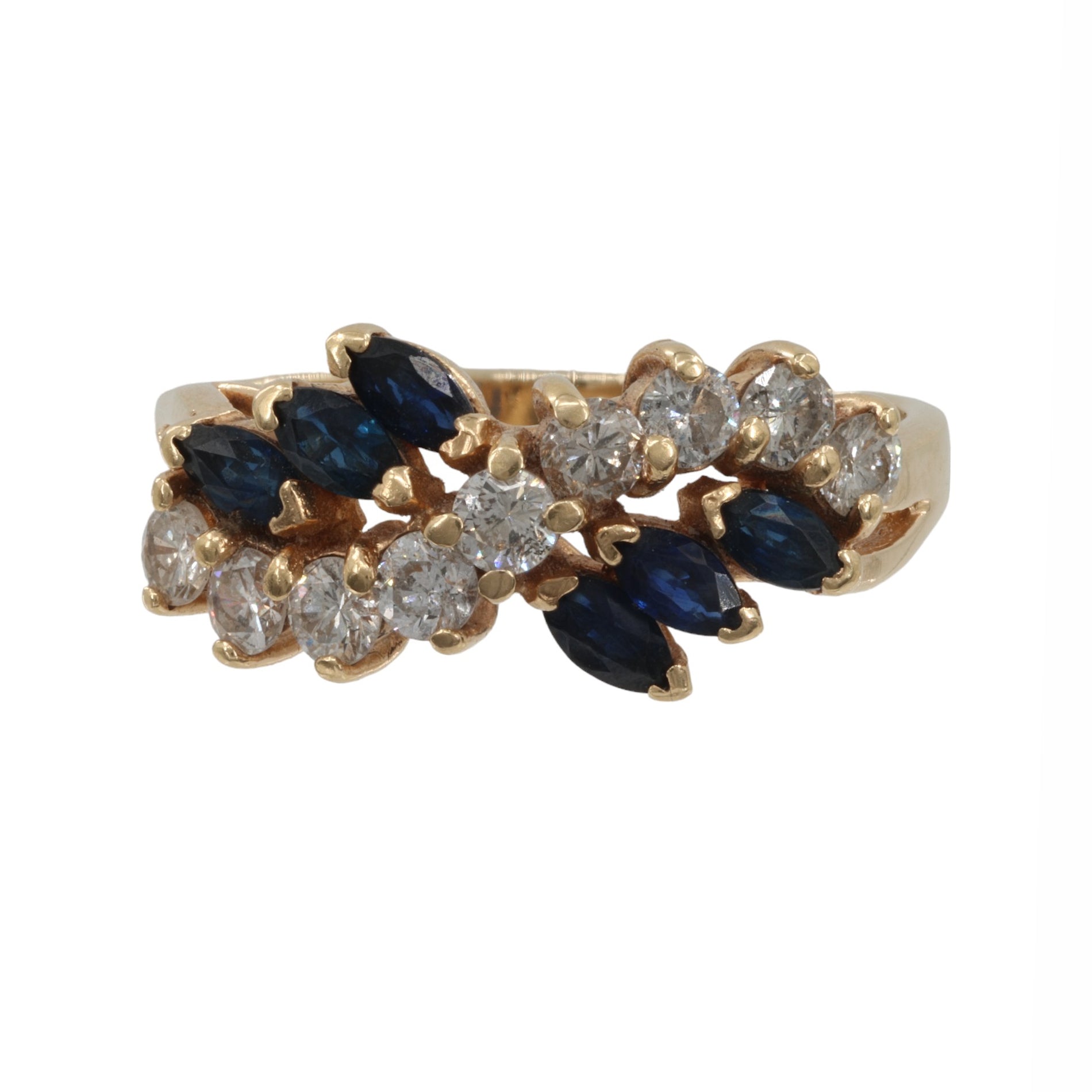 14K Yellow Gold Diamond & Blue Sapphire Gemstone Bypass Ring