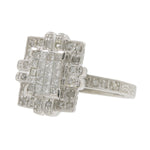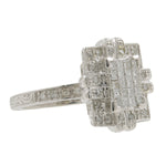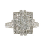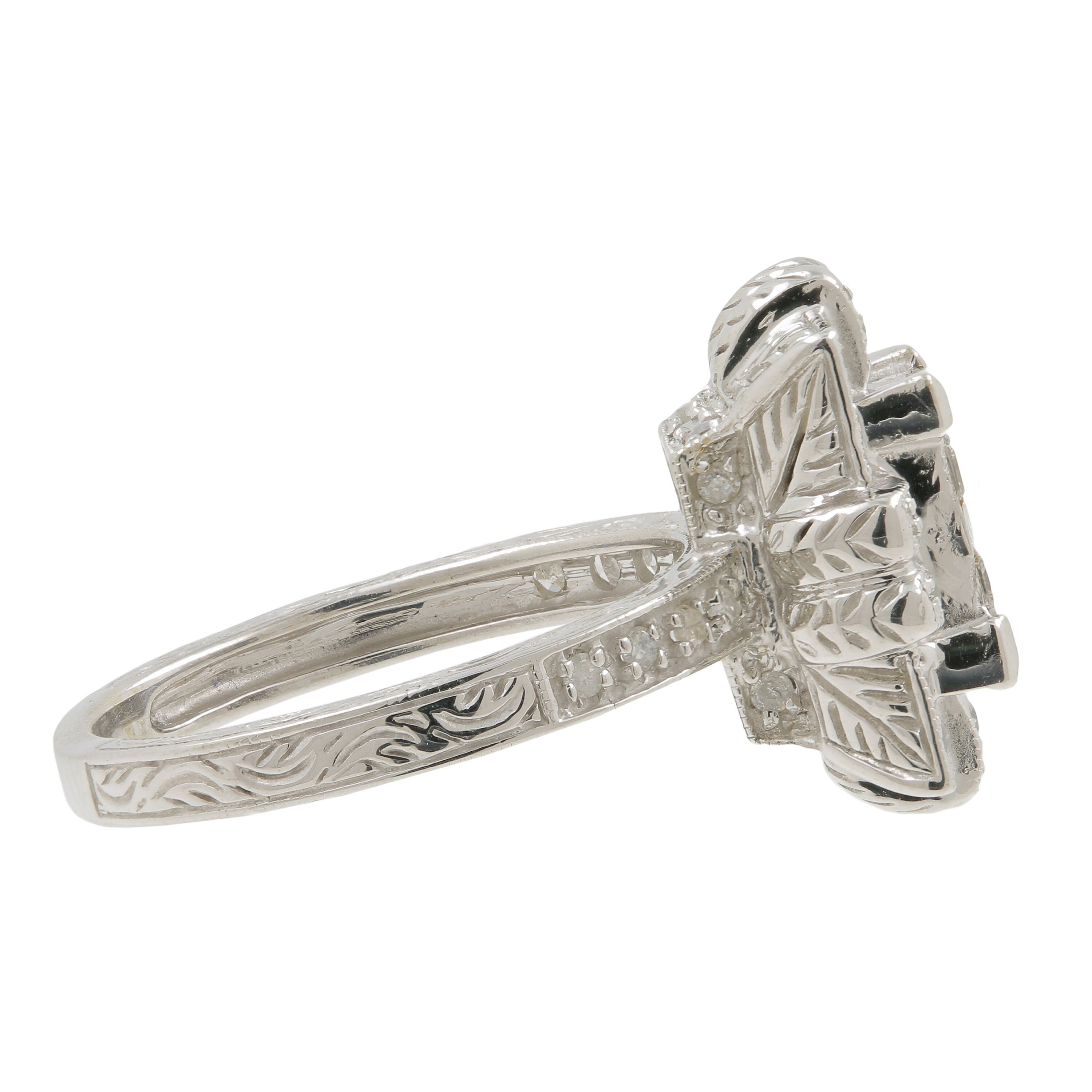This new ladies 14k white gold ring has an ornate setting and deco design along the shank, it features both princess and round brilliant cut diamonds for a total carat weight of 1 Ctw in all. Comes to you in a complimentary gift box.