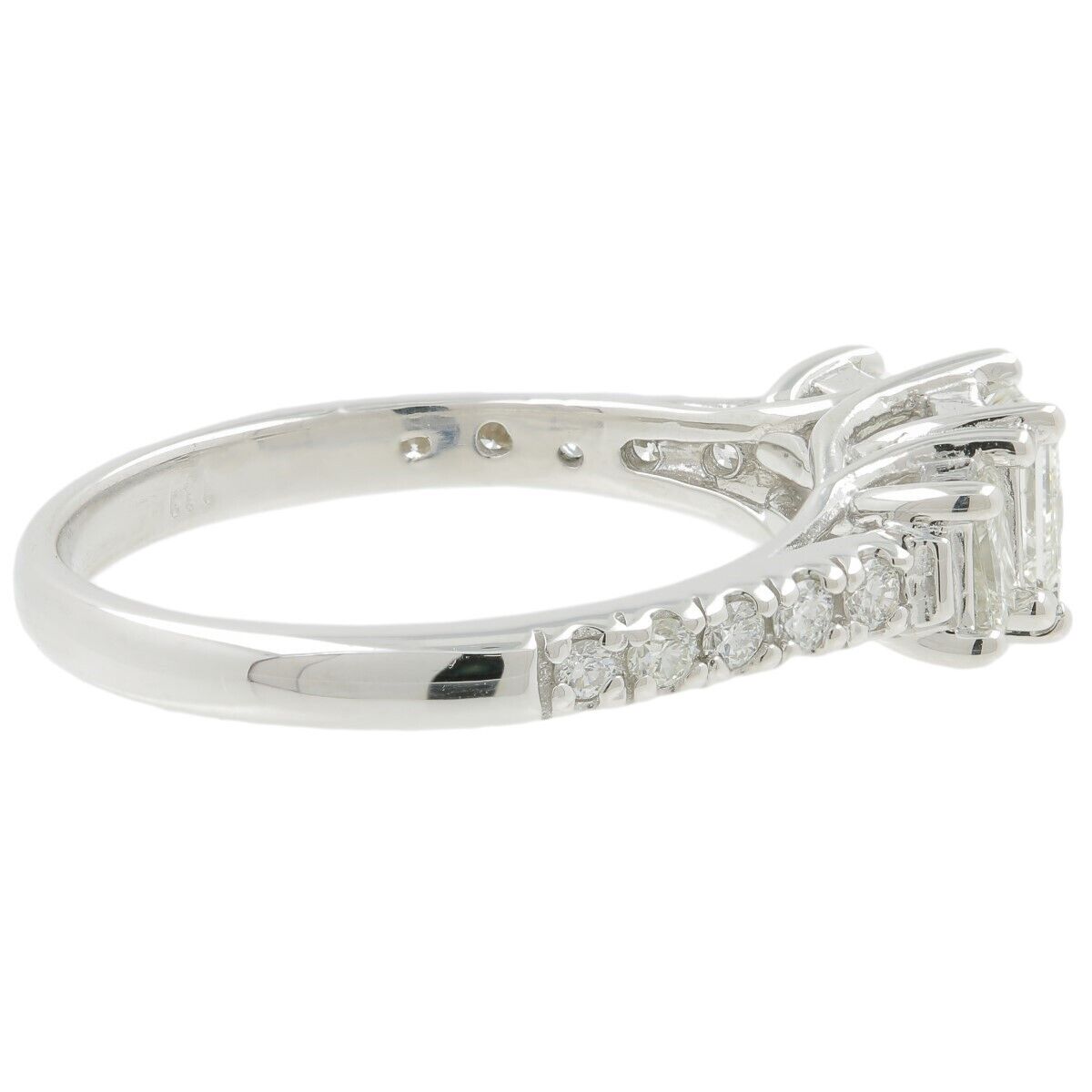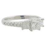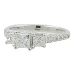 Express all the love you hold in your heart with this timeless three-stone diamond ring. Fashioned in gleaming 14-karat white gold, three shimmering princess-cut diamond center stones catch the eye. With diamond set shoulders to create an added feeling of indulgence. There is no better way to represent your past present and future together. Comes with a lovely gift box and a complimentary professional final polish.