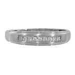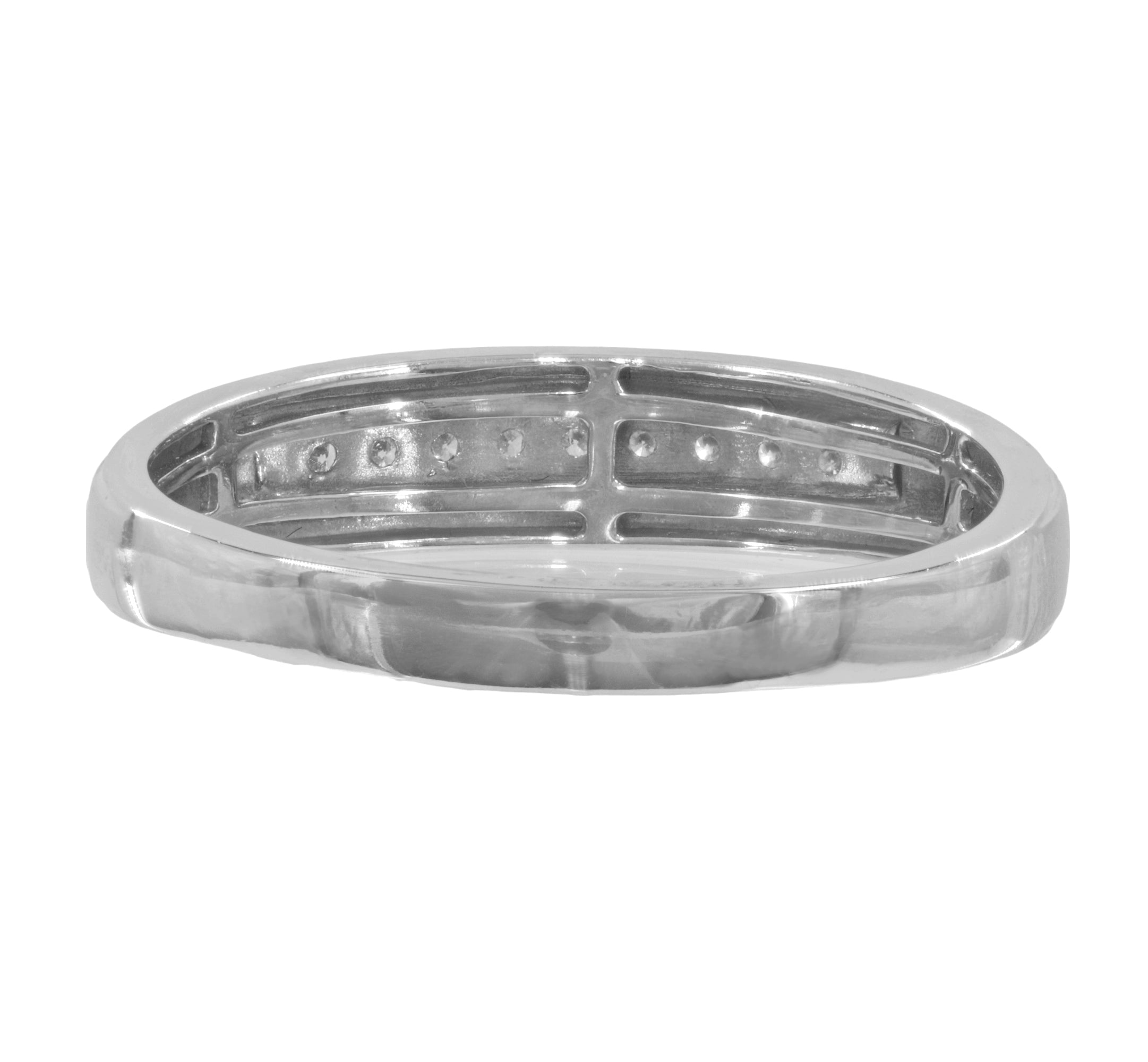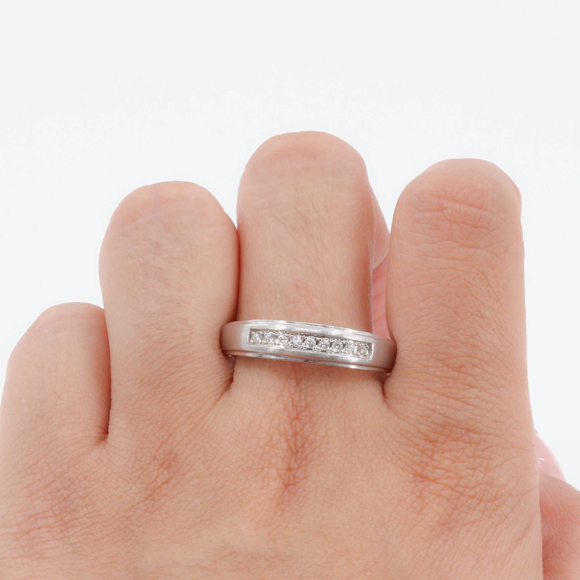 Introducing this Men's 14k White Gold Diamond Satin Finish Ring, a fusion of sophistication and style. The shank, measuring 3mm, provides a sturdy and stylish foundation for the ring. With a head size of 5.5mm, it showcases nine dazzling round brilliant cut diamonds, each 0.02ct, totaling 0.18ctw. Perfectly sized at 13.5, it offers a comfortable and snug fit. Crafted with 14k White Gold, the satin finish adds a unique touch to this piece, making it an ideal choice for those seeking refined elegance and contemporary charm.