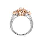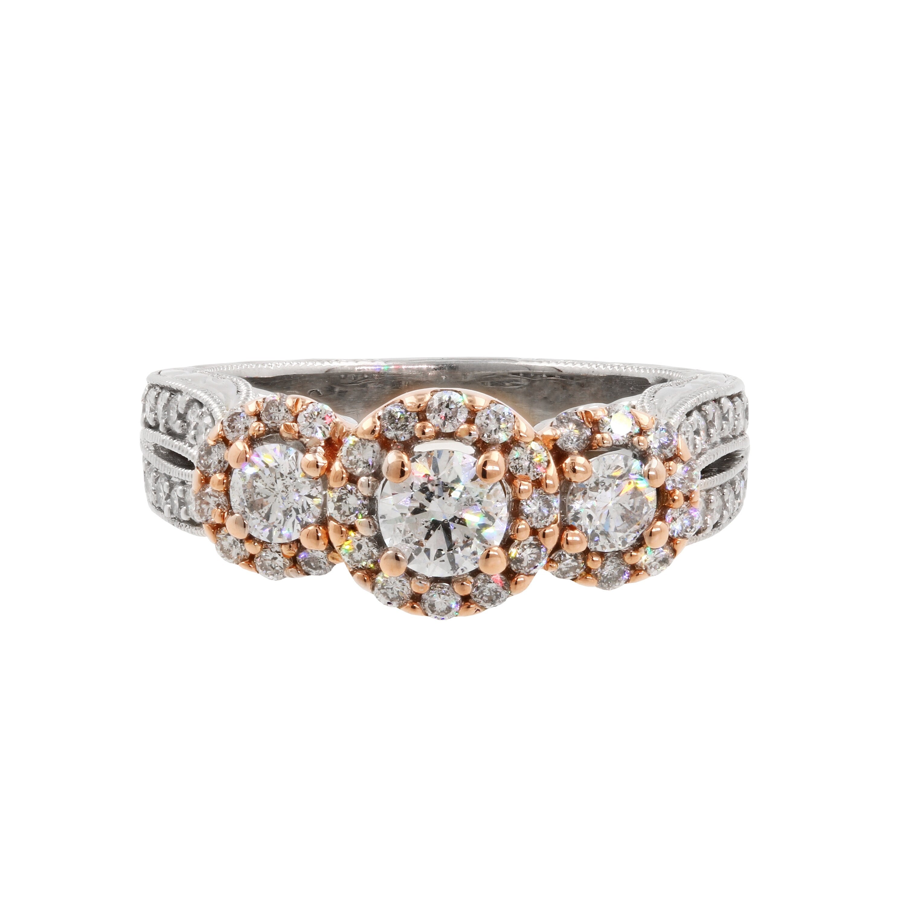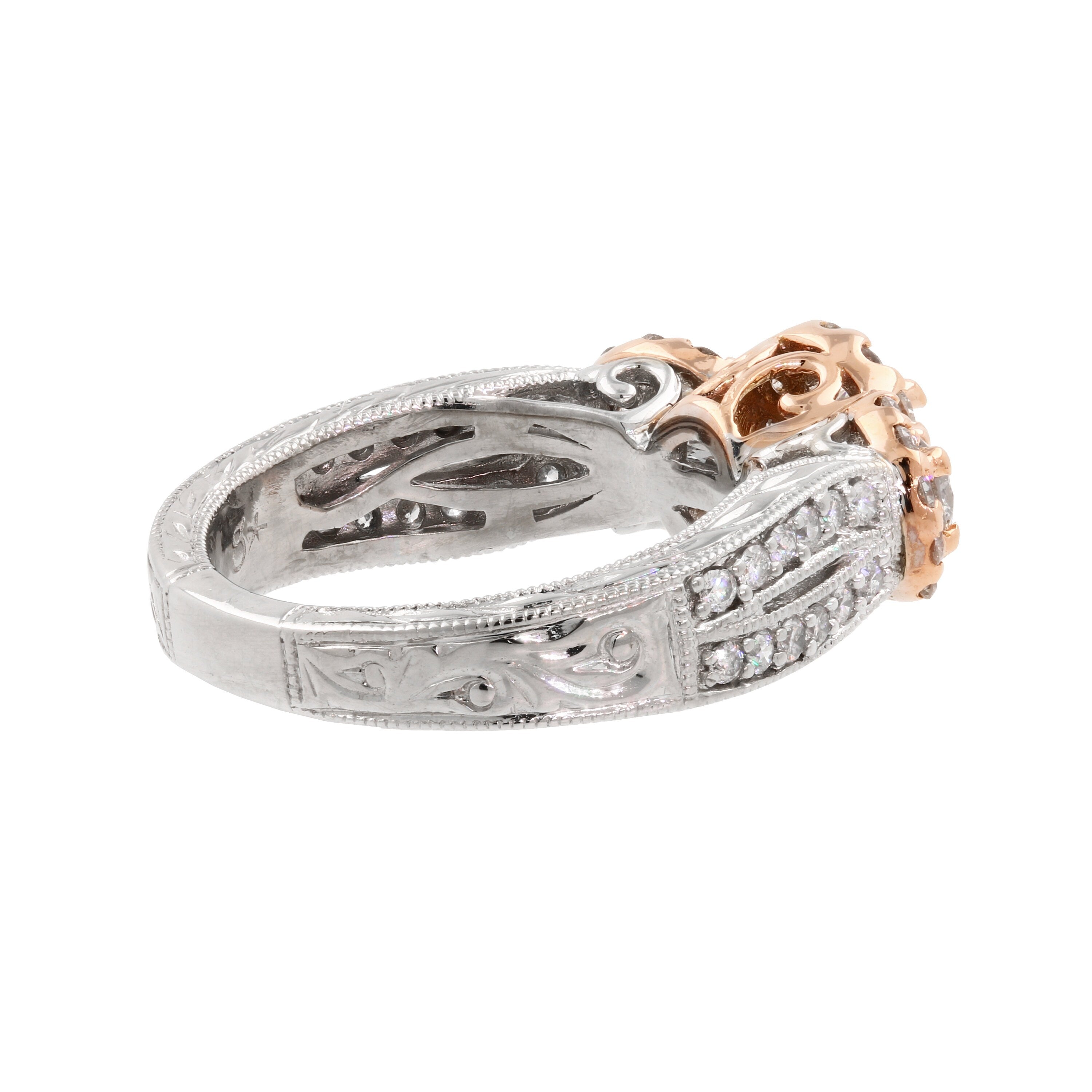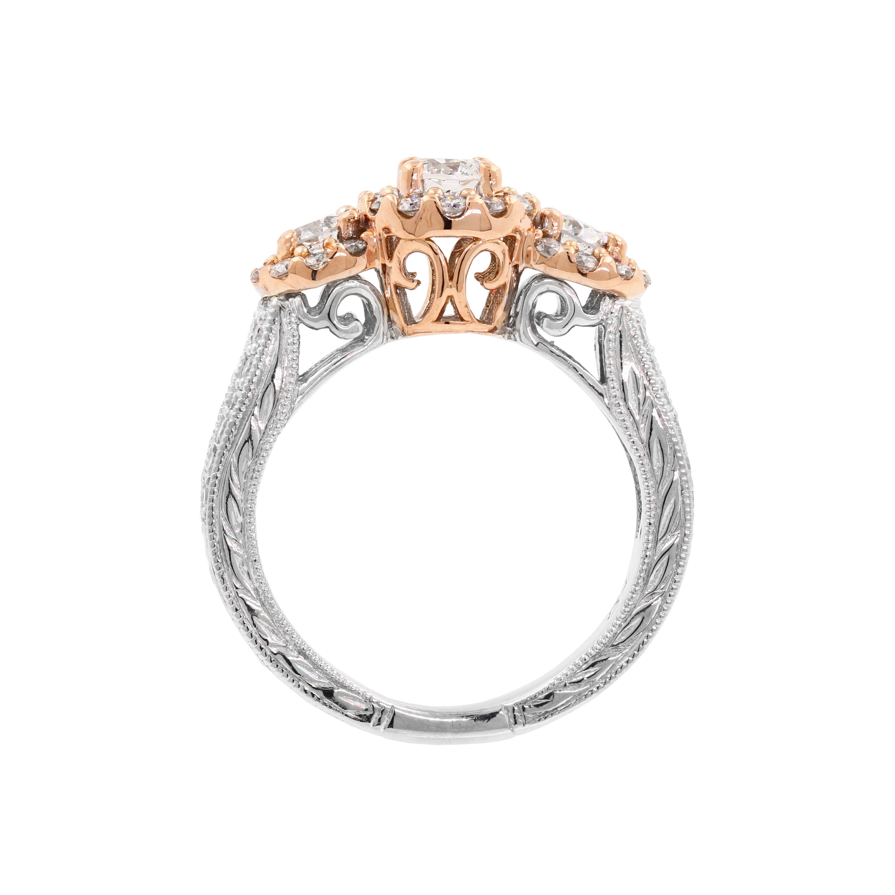 Whether its an anniversary, engagement, or just a present to yourself... This one-of-a-kind piece of masterful craftsmanship will put a smile on that special someone, no matter who they are. Dazzle your friends with the amazing craftsmanship of this ring. Featuring a 14k gold rose gold head with a 0.25ct round brilliant diamond center stone & two 0.11ct round brilliant diamond side stones, all encompassed by a total of 28 diamonds set in the halos. This ring also features 24 round brilliant diamonds on the 14k white gold band, accented by hand engraved designs along the shank and bordered by milgrain edges. This ring has a total carat weight of 1.17ctw.
