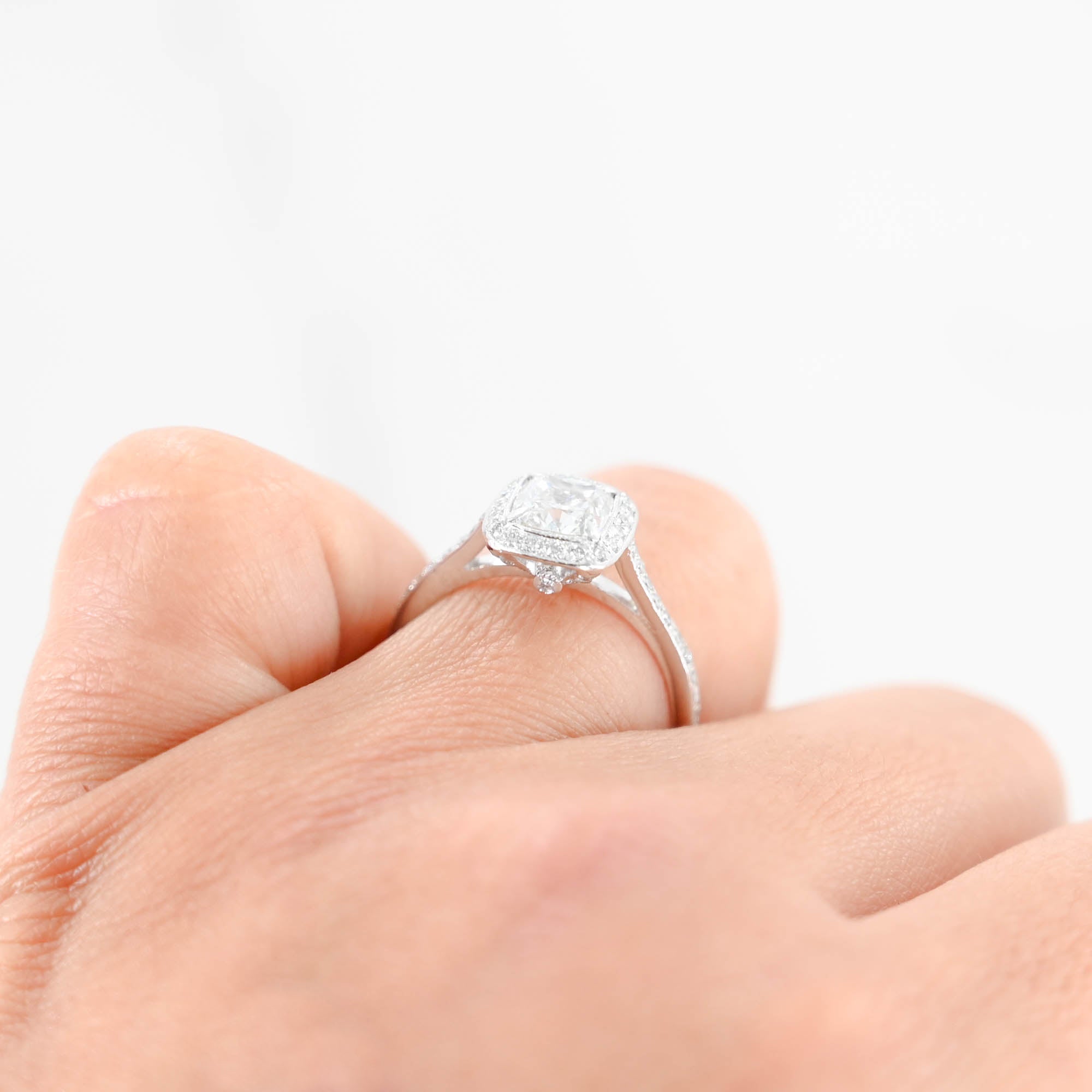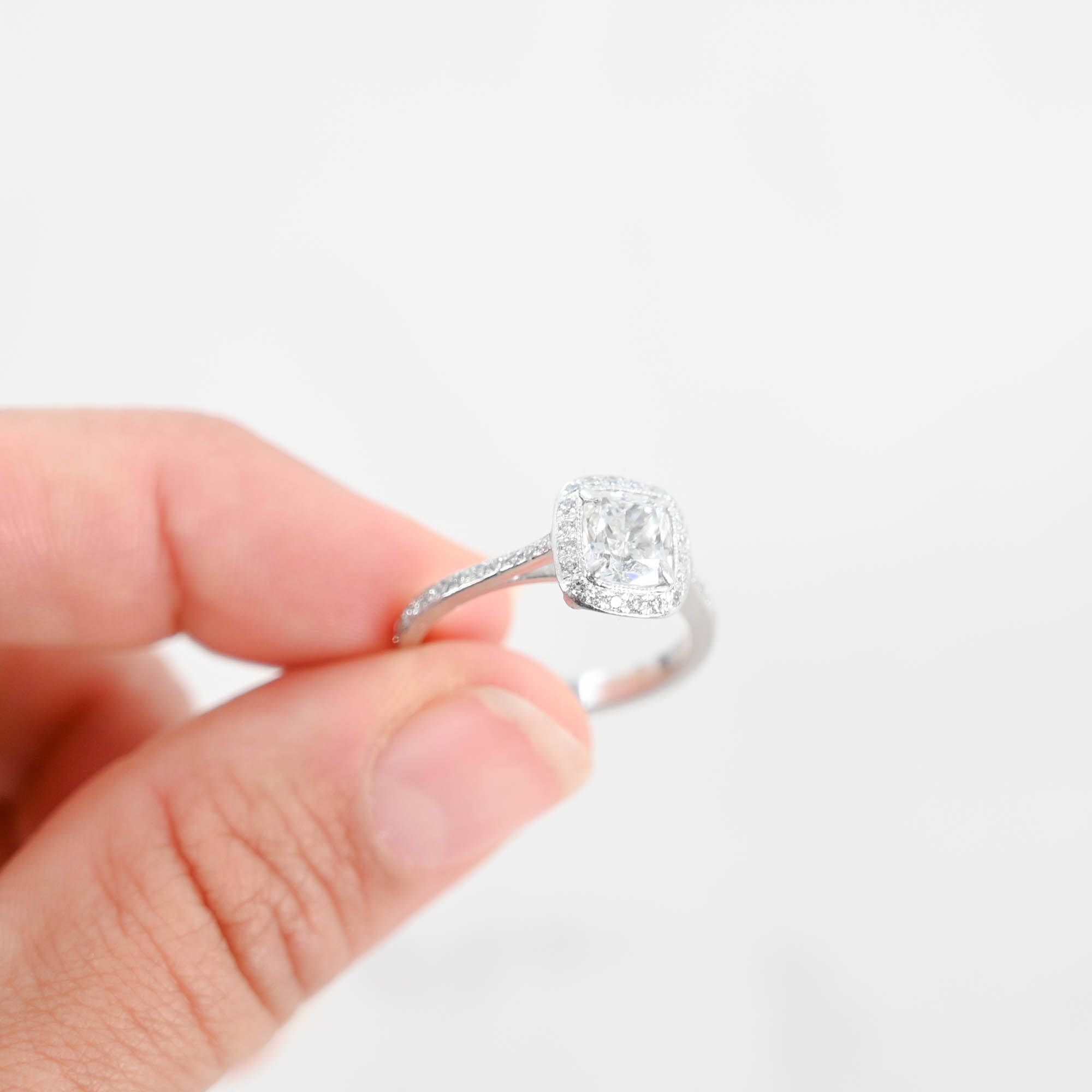 Exquisite Platinum Engagement Ring featuring a stunning 1.90 carat total weight. The centerpiece is a cushion-cut diamond, elegantly framed by a halo of sparkling side diamonds, all set in luxurious platinum. Perfect for making any proposal unforgettable.