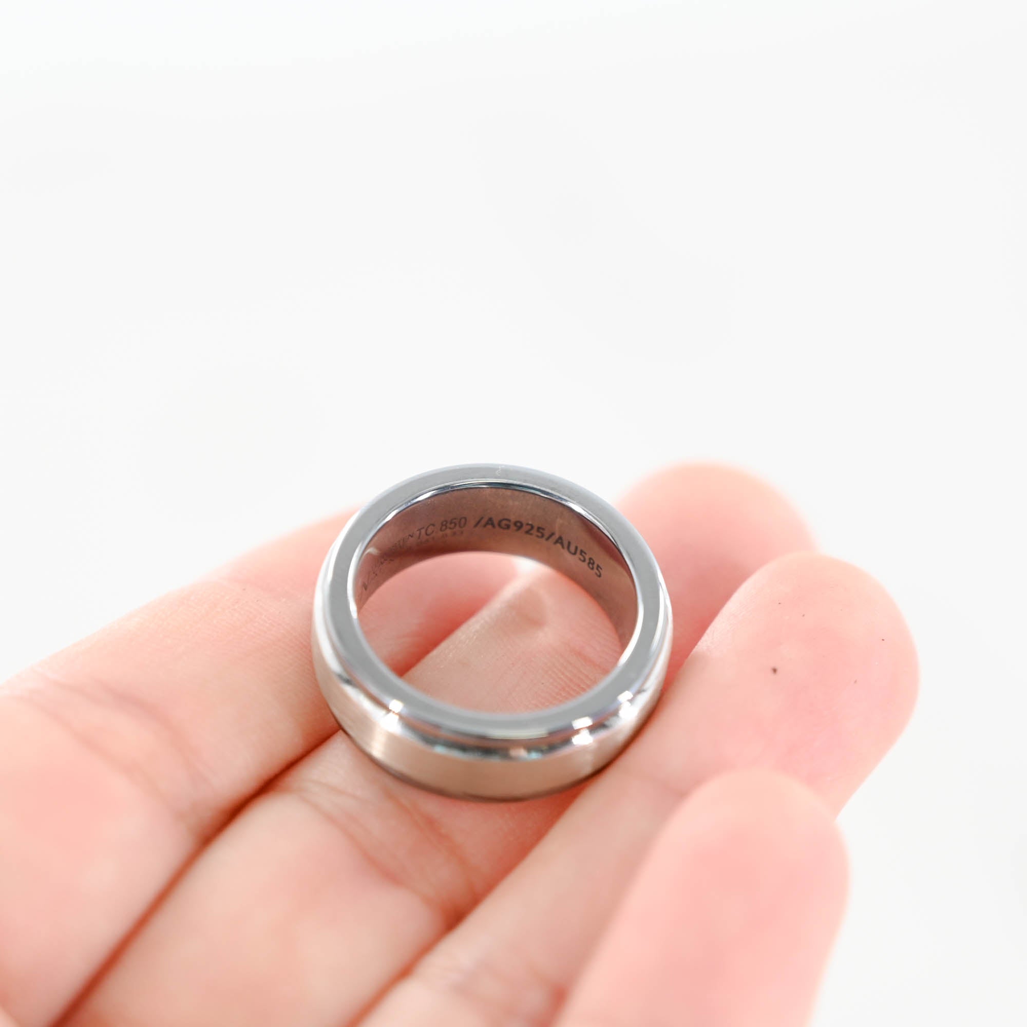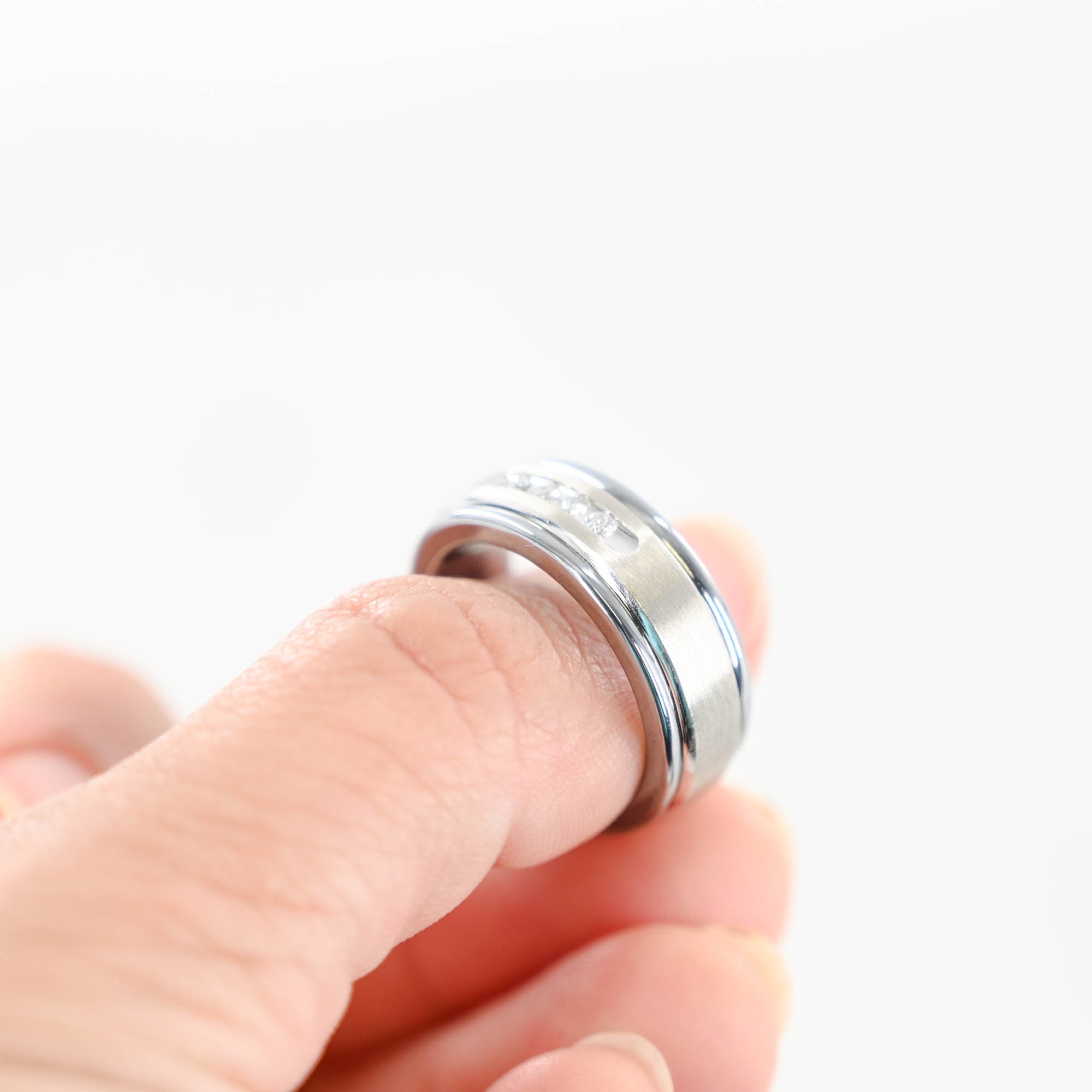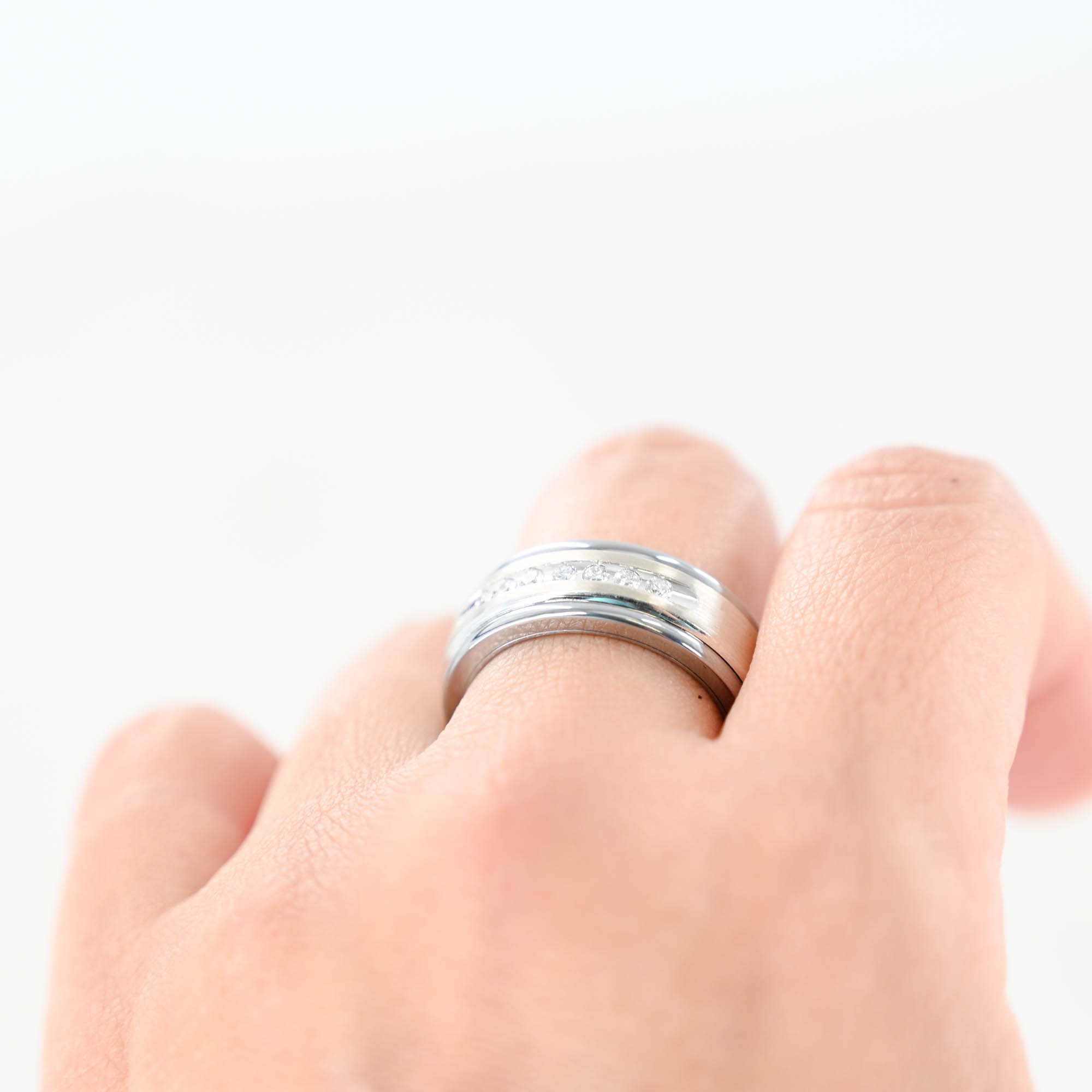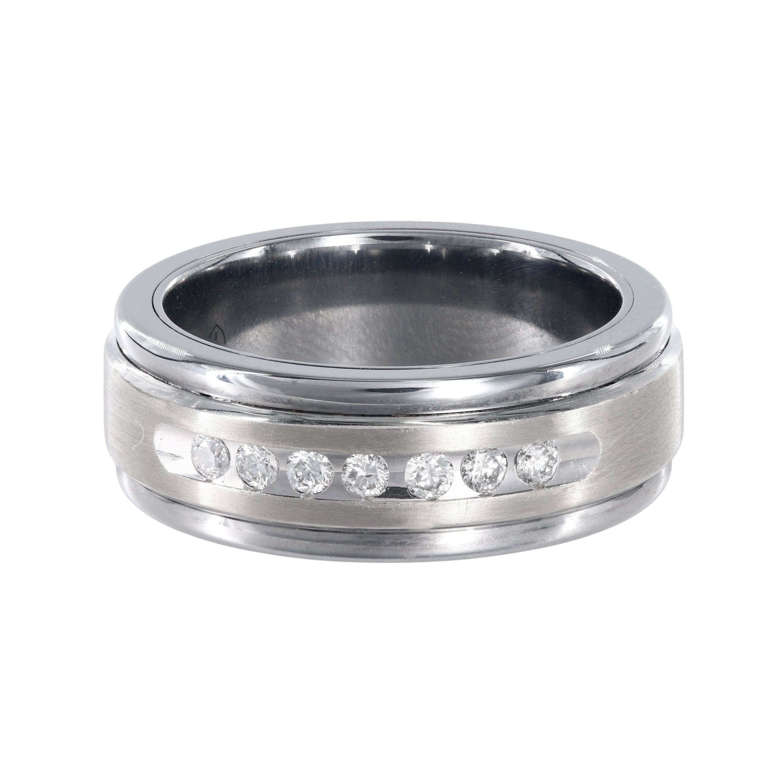Triton band ring, crafted from durable tungsten and accented with luxurious 14K white gold. The band features seven stunning diamonds, each weighing 0.035 carats, with a total carat weight of 0.245Ctw, adding a touch of brilliance and sophistication. Perfect for weddings, anniversaries, or a statement of timeless elegance.