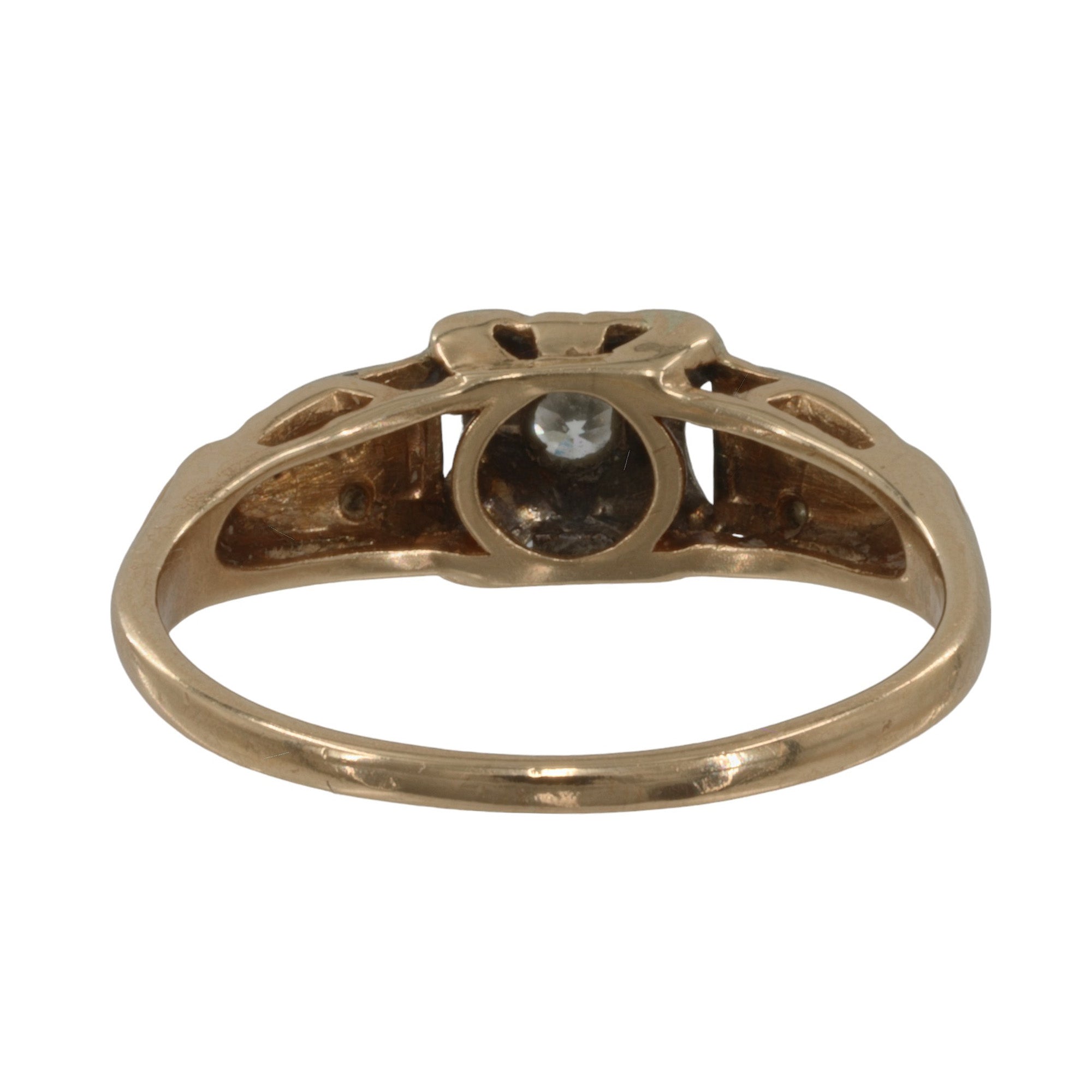 Exhibiting timeless elegance, this vintage Art Deco diamond ring in 10k two-tone gold features delicate details and captivating design. The centerpiece boasts a round brilliant-cut diamond weighing 0.07 carats, framed by four accent diamonds totaling 0.09 carats. With a clarity grade of SI2 and a color grade of G-H for the center stone, and I1 clarity and I-J color for the accents, this ring exudes sophistication. The intricate shank, measuring 1.25mm in width, and the head, 6.25mm in size, add to its allure. Weighing a total of 2 grams and designed for a size 6 finger, it's a stylish and timeless addition to any jewelry collection.