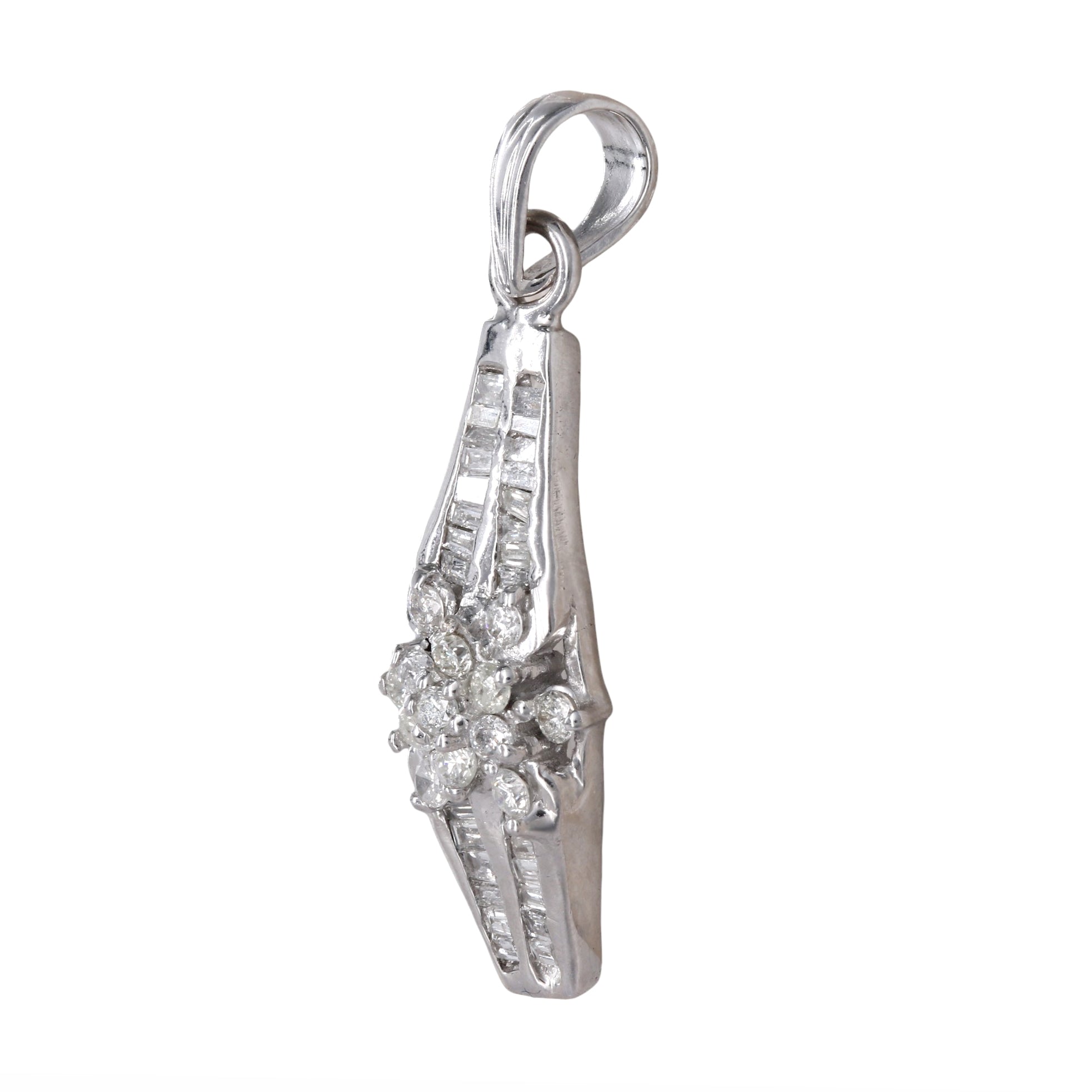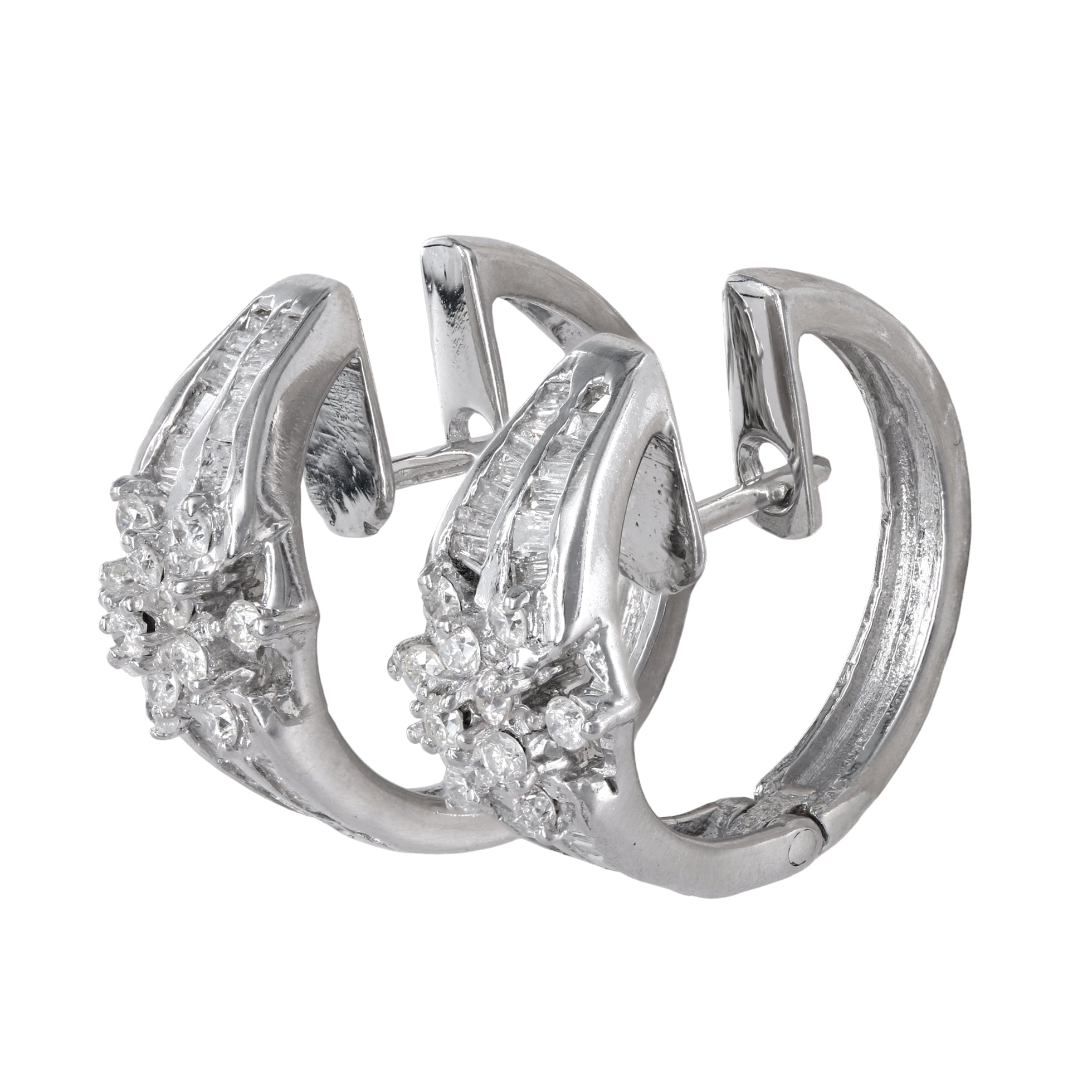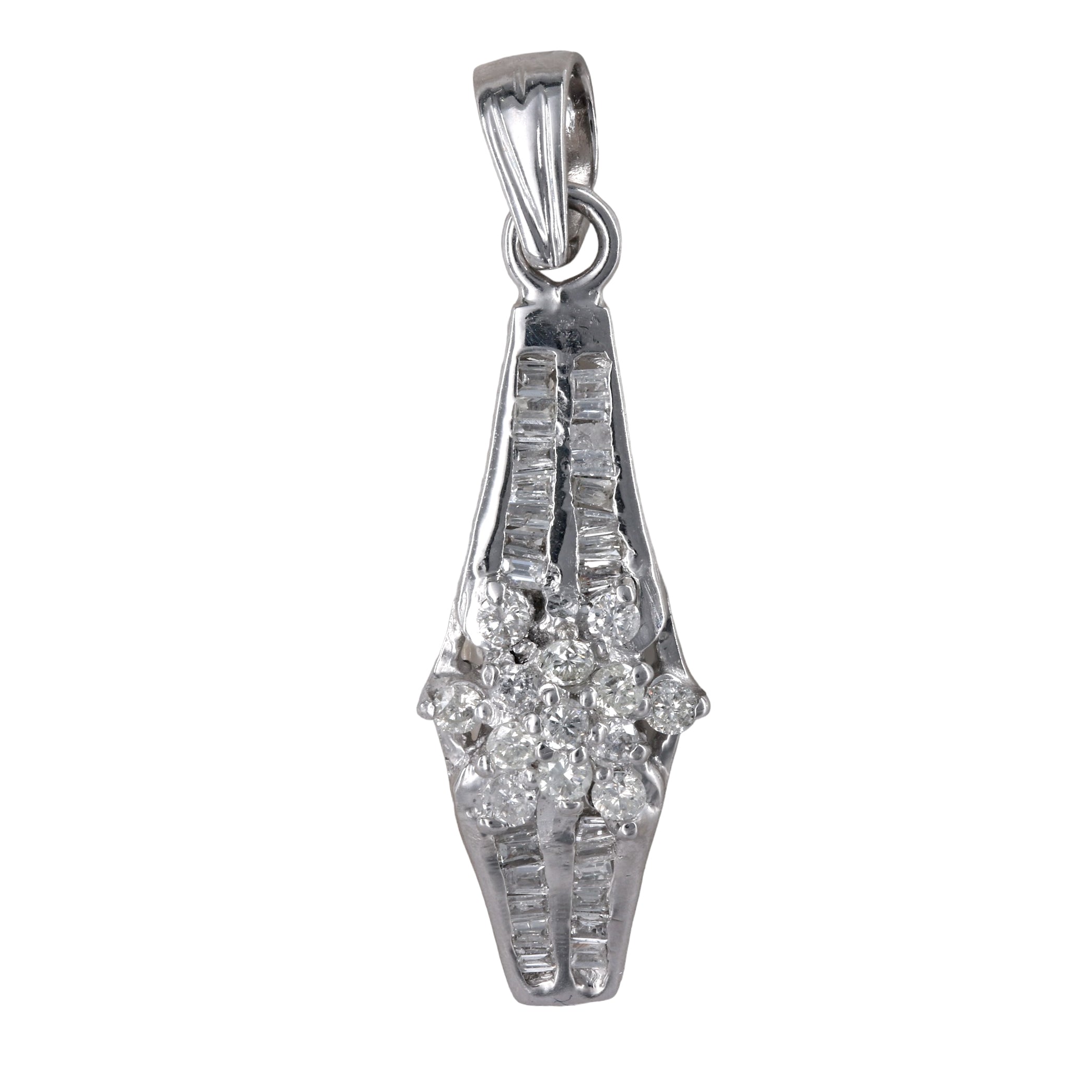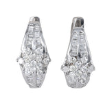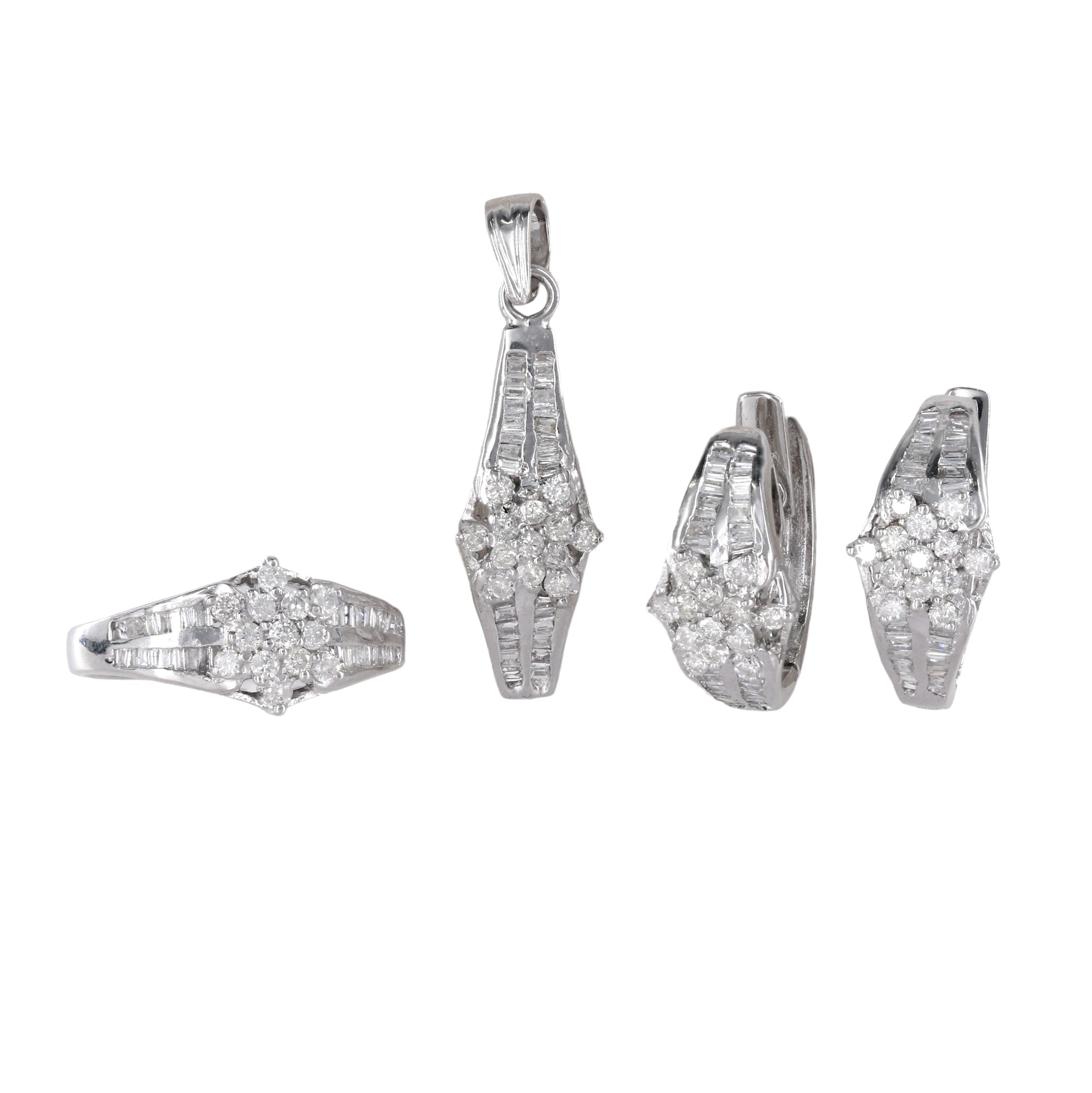 Crafted in vintage 14k white gold, this exquisite diamond jewelry set radiates elegance and sophistication. The ring, with a shank size of 2.5mm and a head size of 9mm, pairs seamlessly with the pendant and earrings. The pendant, measuring 31mm in length (including the bale) and 9mm in width, and the earrings, each 18.5mm in length and 9mm in width, showcase a dazzling array of diamonds. Adorned with a total of 52 round brilliant-cut diamonds and 116 baguette-cut diamonds, all boasting I1 clarity and G-H color, this set exudes timeless charm. Secured with hinged latch closures, each piece is a testament to classic beauty. Weighing a combined 12.2 grams, this vintage set is a stunning addition to any collection.