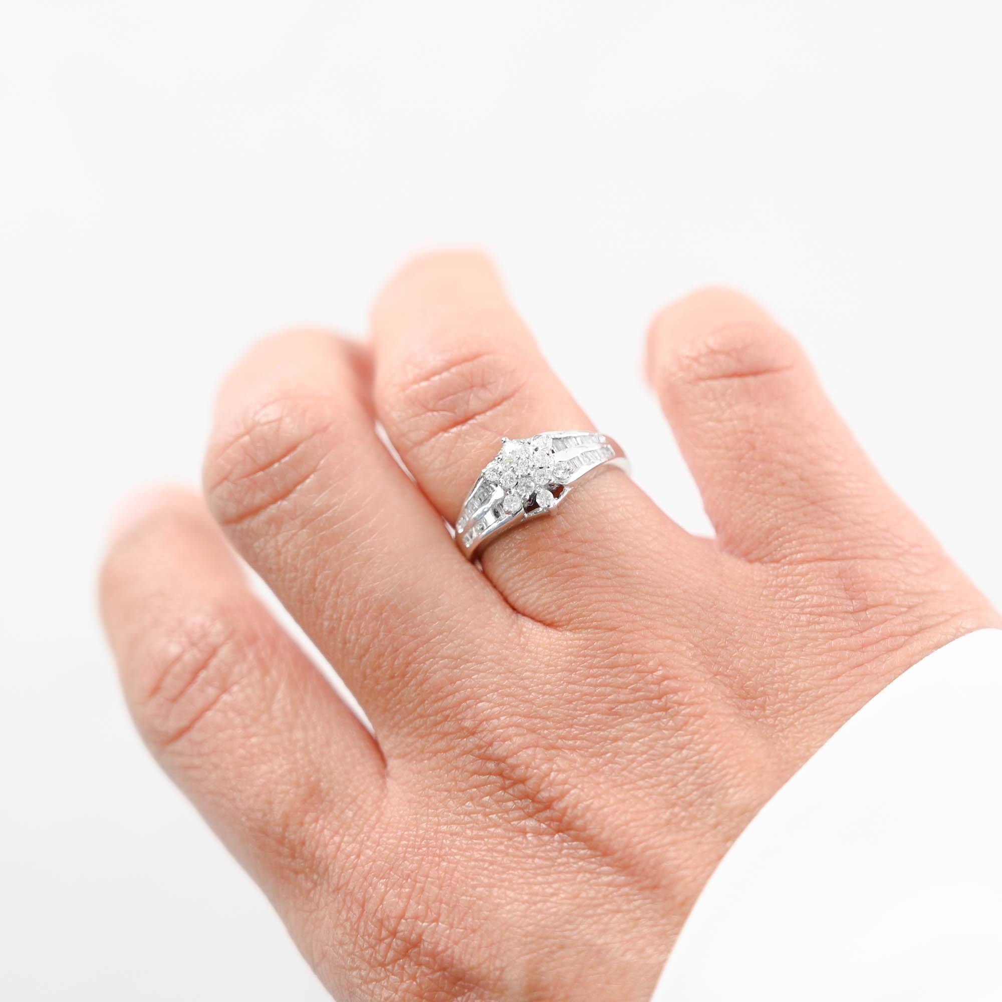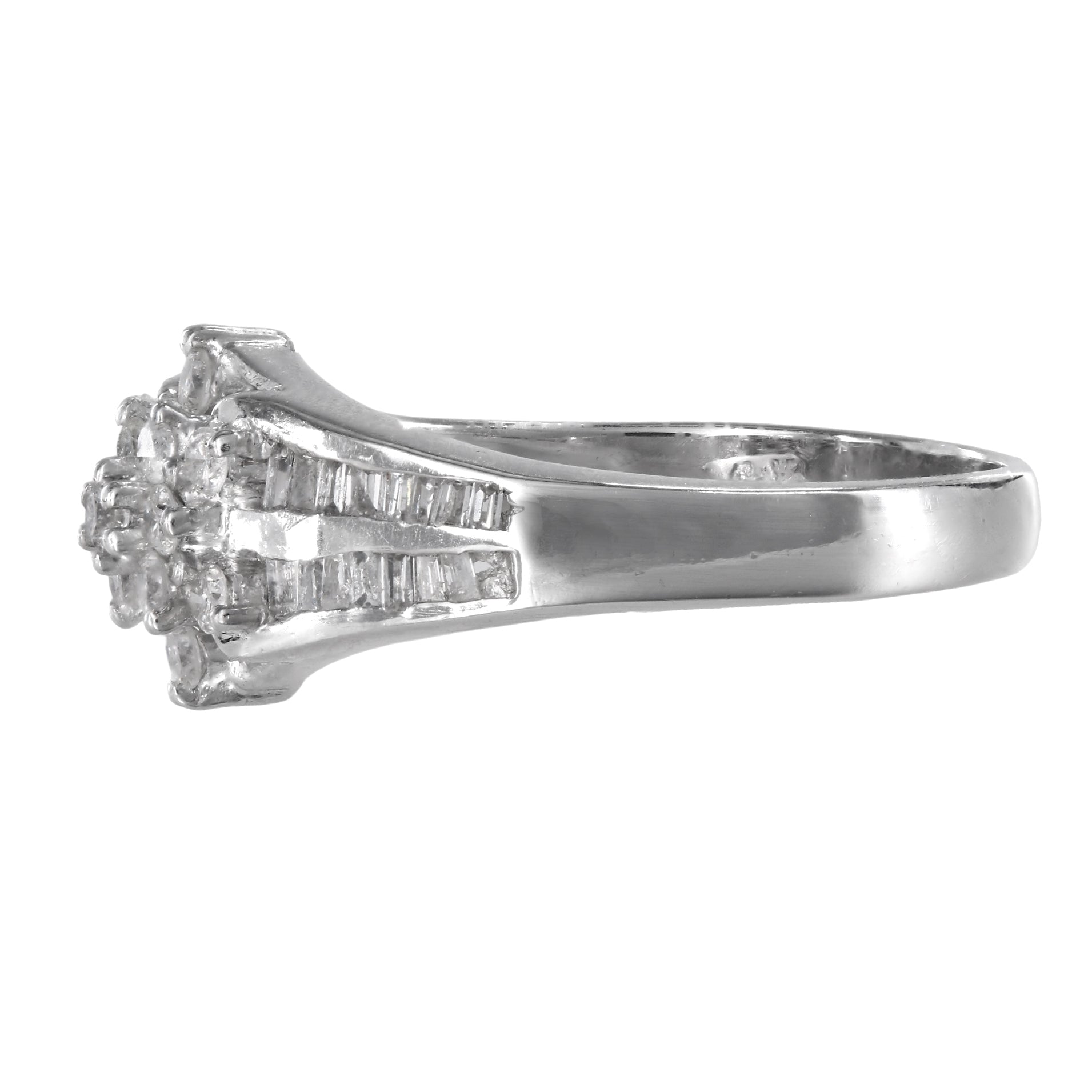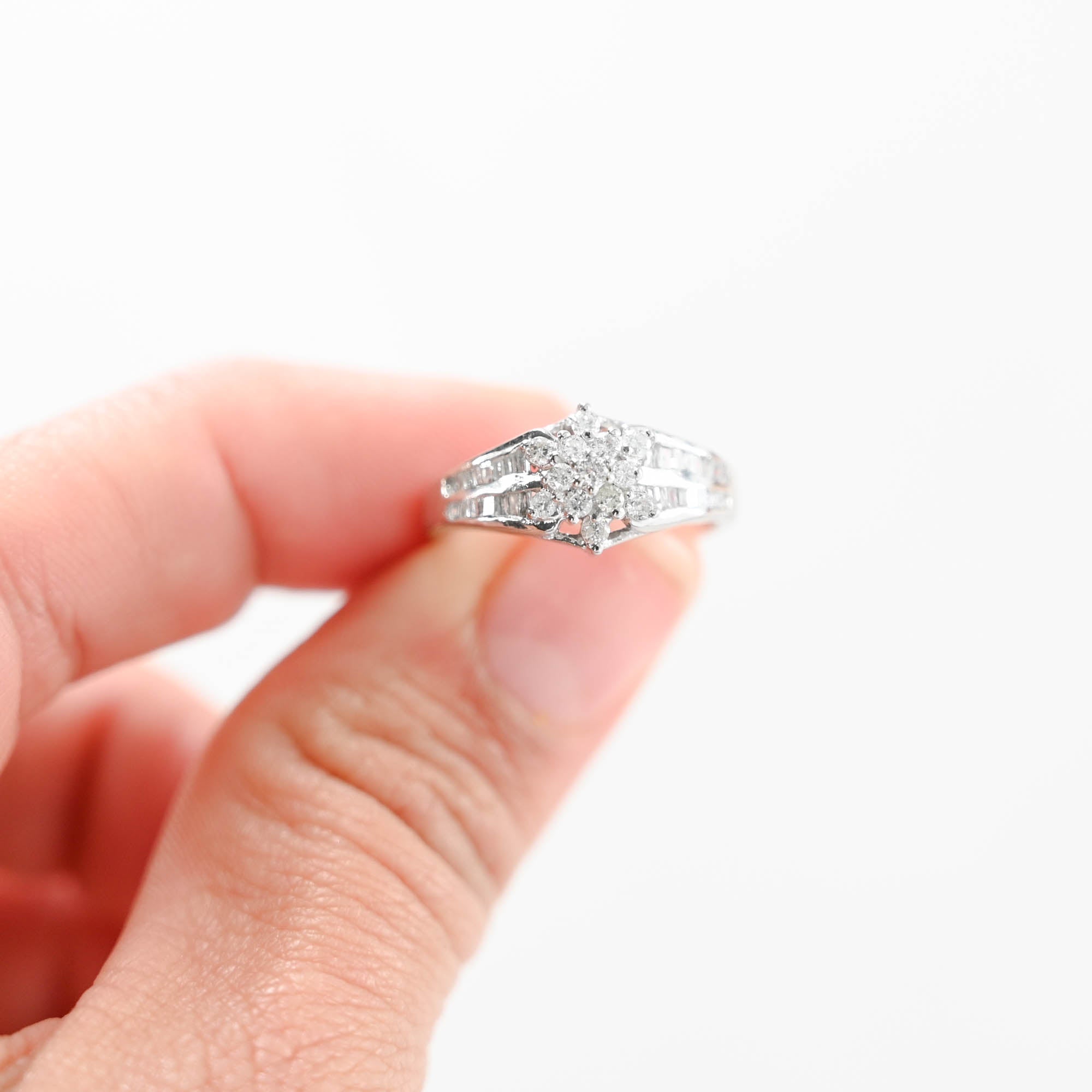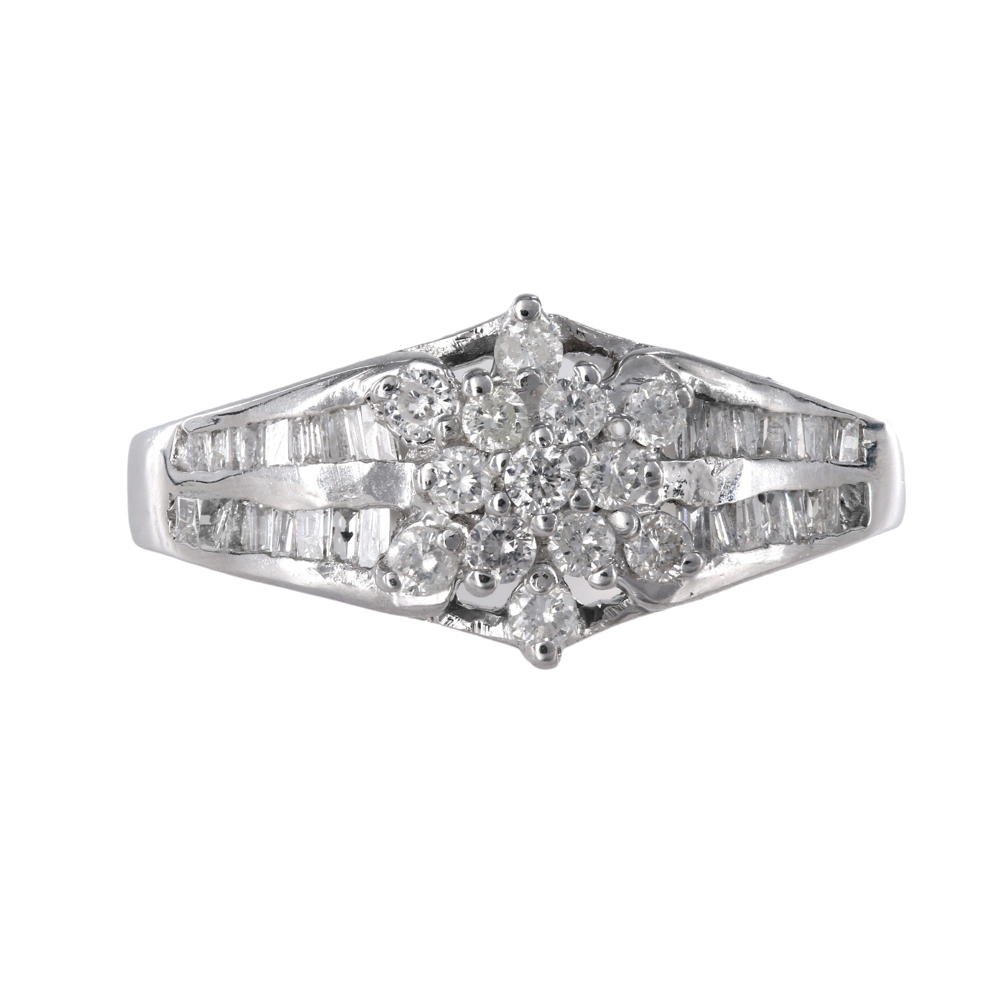 Crafted in vintage 14k white gold, this exquisite diamond jewelry set radiates elegance and sophistication. The ring, with a shank size of 2.5mm and a head size of 9mm, pairs seamlessly with the pendant and earrings. The pendant, measuring 31mm in length (including the bale) and 9mm in width, and the earrings, each 18.5mm in length and 9mm in width, showcase a dazzling array of diamonds. Adorned with a total of 52 round brilliant-cut diamonds and 116 baguette-cut diamonds, all boasting I1 clarity and G-H color, this set exudes timeless charm. Secured with hinged latch closures, each piece is a testament to classic beauty. Weighing a combined 12.2 grams, this vintage set is a stunning addition to any collection.