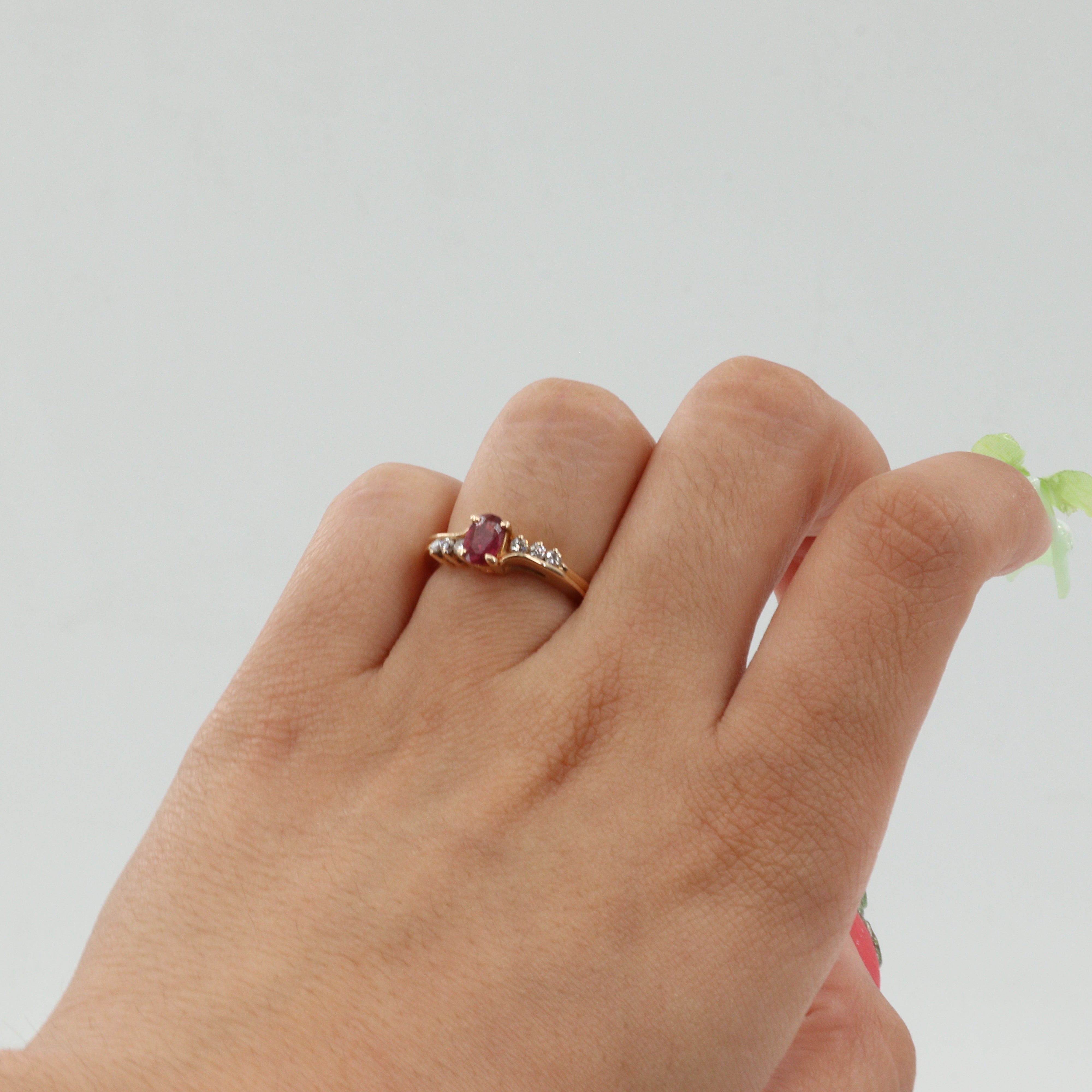 This stunning piece features a vibrant ruby gemstone flanked by sparkling diamonds, all set in lustrous yellow gold. The combination of rich color and brilliant diamonds creates a captivating and luxurious design. Perfect for making a statement or as a unique accessory, this ruby and diamond ring is a timeless addition to your jewelry collection.