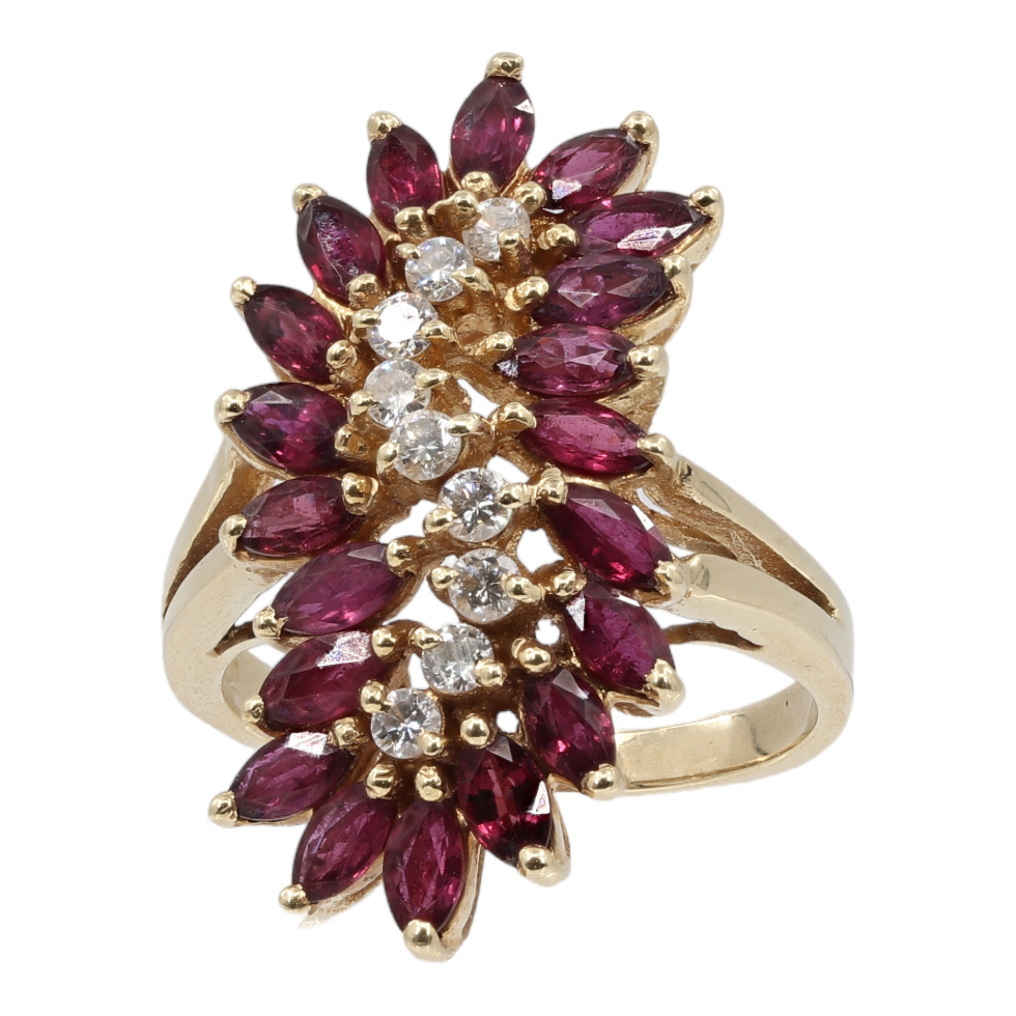 Embrace the timeless allure of our Vintage Estate Ladies 14k Yellow Gold Ruby and Diamond Cocktail Cluster Ring. In a size 7.25, this ring showcases a delicate 2.0mm shank and a captivating 28x15mm head, echoing the grace of a bygone era. The centerpiece is adorned with nine round brilliant cut diamonds, each 0.04ct, encircled by 20 accent marquise cut rubies, estimated at 0.15ct each, creating an exquisite total carat weight of 0.36ctw. The ring's total stone weight reaches an impressive 3.36ctw. Crafted from 14k yellow gold, this vintage treasure weighs 7.2g, symbolizing both opulence and enduring quality. Elevate your jewelry collection with this cocktail cluster ring, a true masterpiece of sophistication and history.